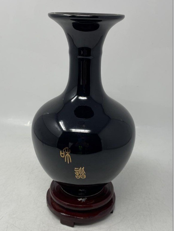 Physical Description: This elegant black antique vase features a slender neck and flared lip, adorned with intricate floral designs in soft colors. The vase stands approximately 10 inches tall and has a diameter of about 5 inches at its widest point. The base is mounted on a wooden stand, enhancing its display appeal. The vase is signed at the bottom, indicating its maker.