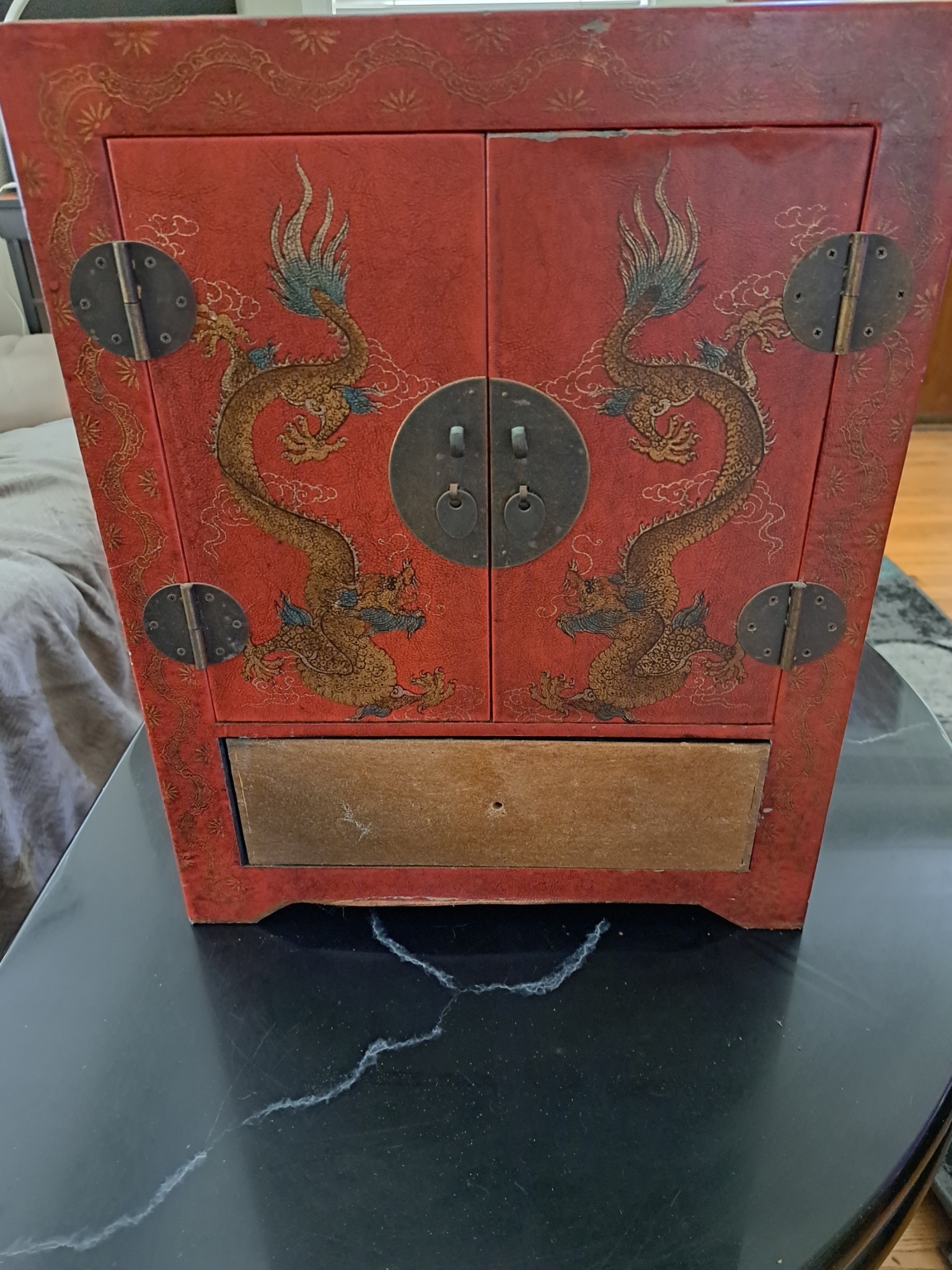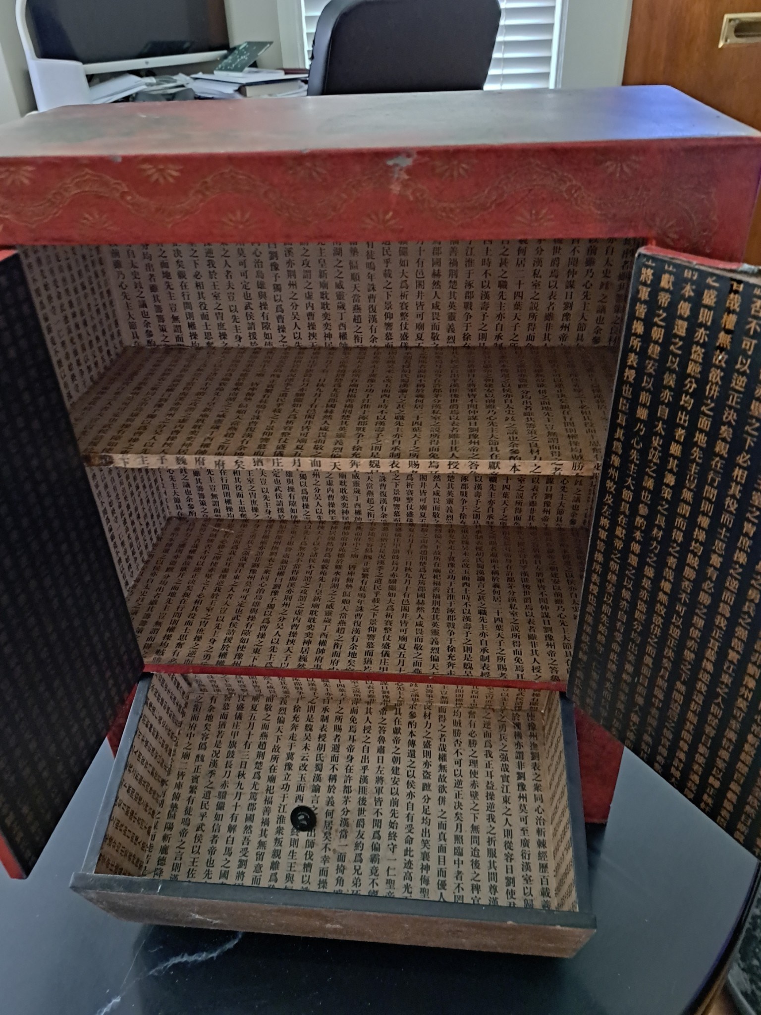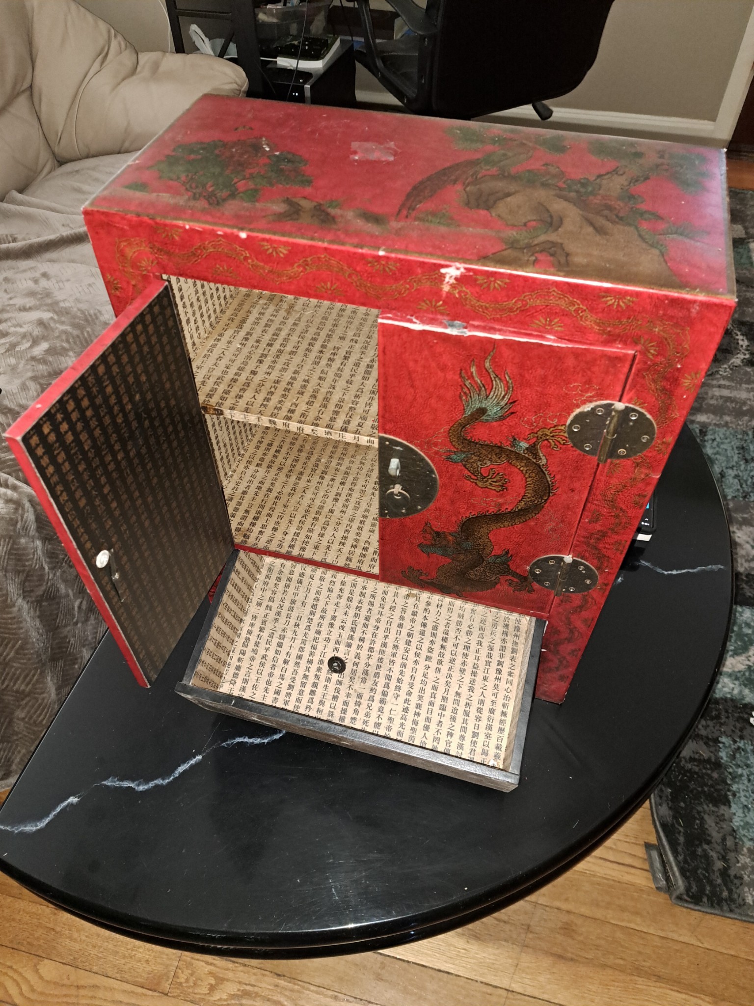 Antique Chinese wall cabinet. Chinese writing inside telling a long story.