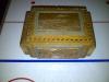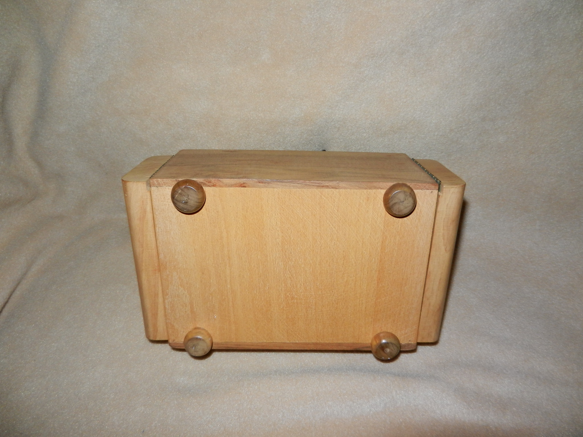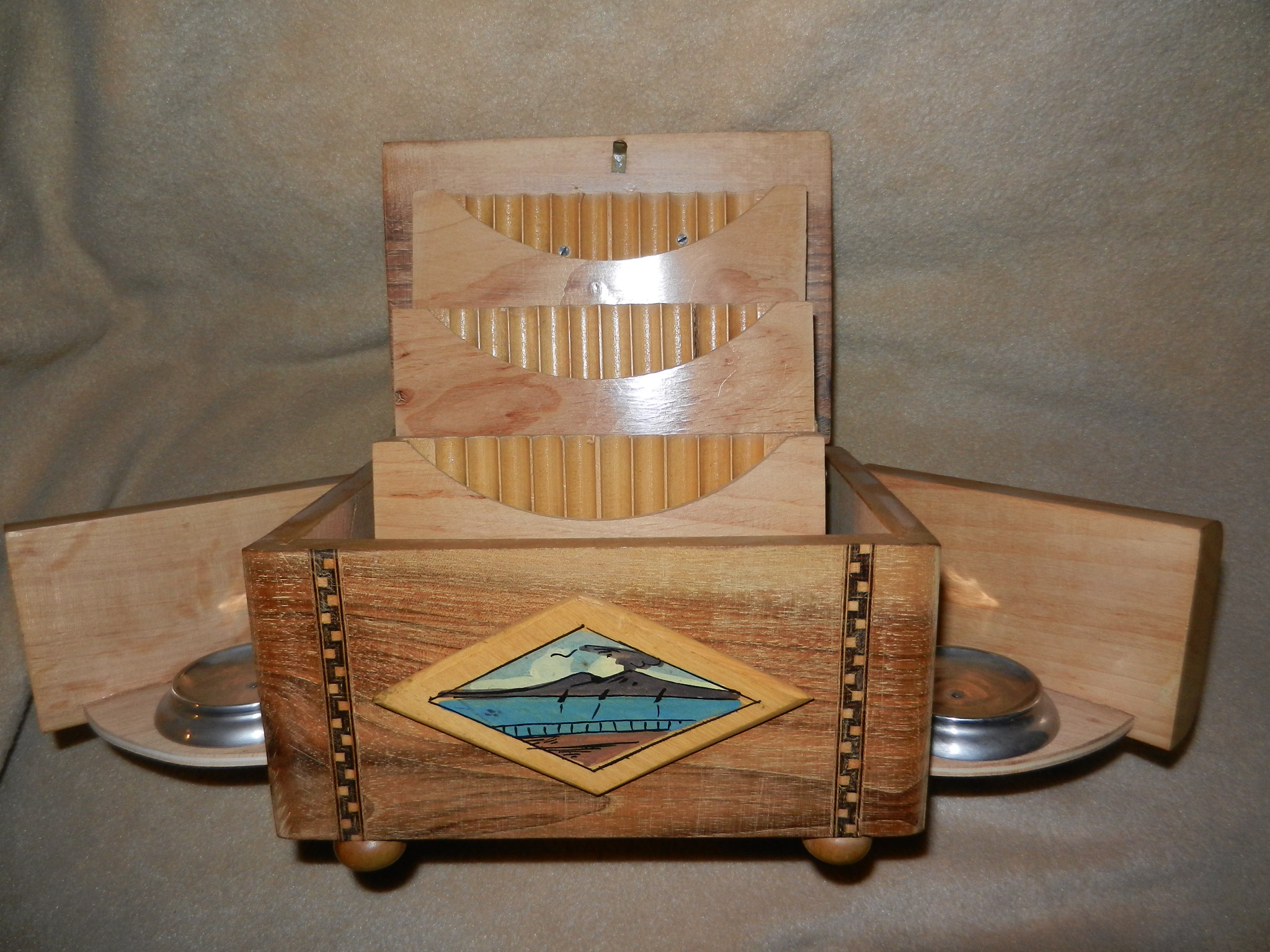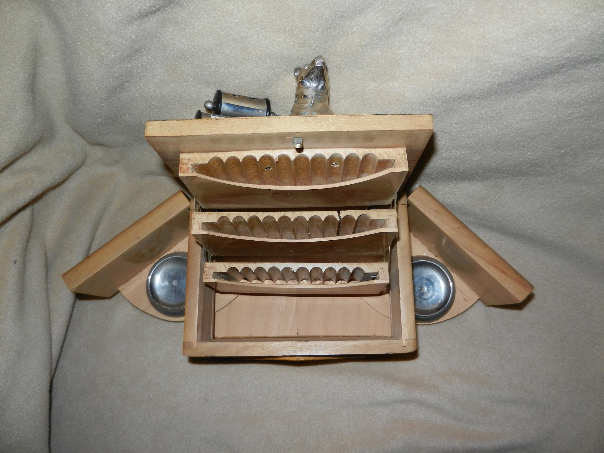 I found this at a tag sale, it had a tag saying it was from the 1950's. The box itself is roughly 8.5''x4.5''x3.5''. lift the lid and it automatically swings out the ash trays on each side and brings up the cigarets. It holds 30 cigarets, there is a metal dog on top along with a roller calender. The front and the top are inlays of the checkered wood. It is in nice shape, there is a break in the wood on one of the cigaret layers and besides that it is a solid wood piece.Thank you