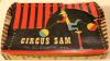 Cast iron circus toy with two horses pulling a cart with a giraffe inside