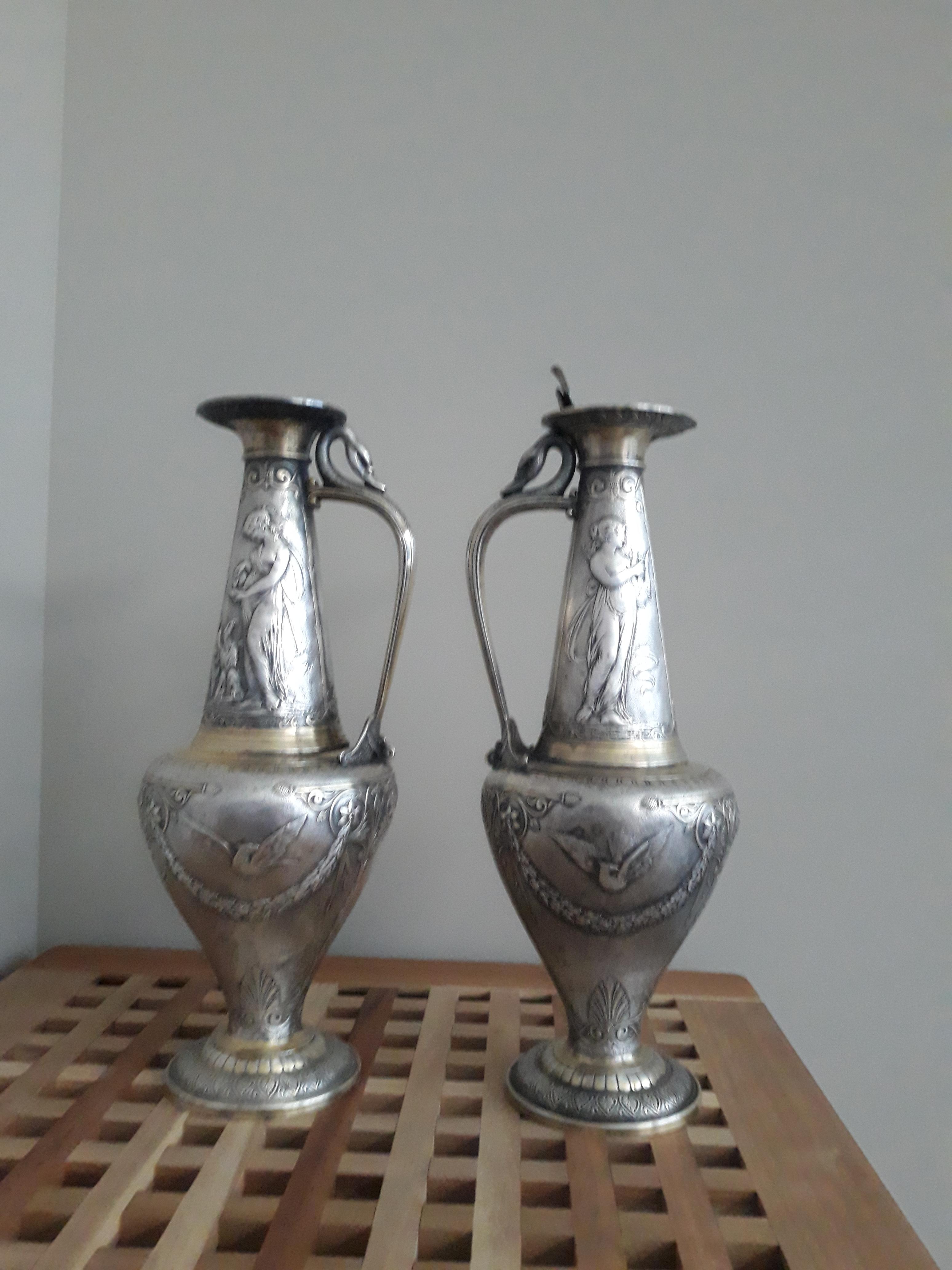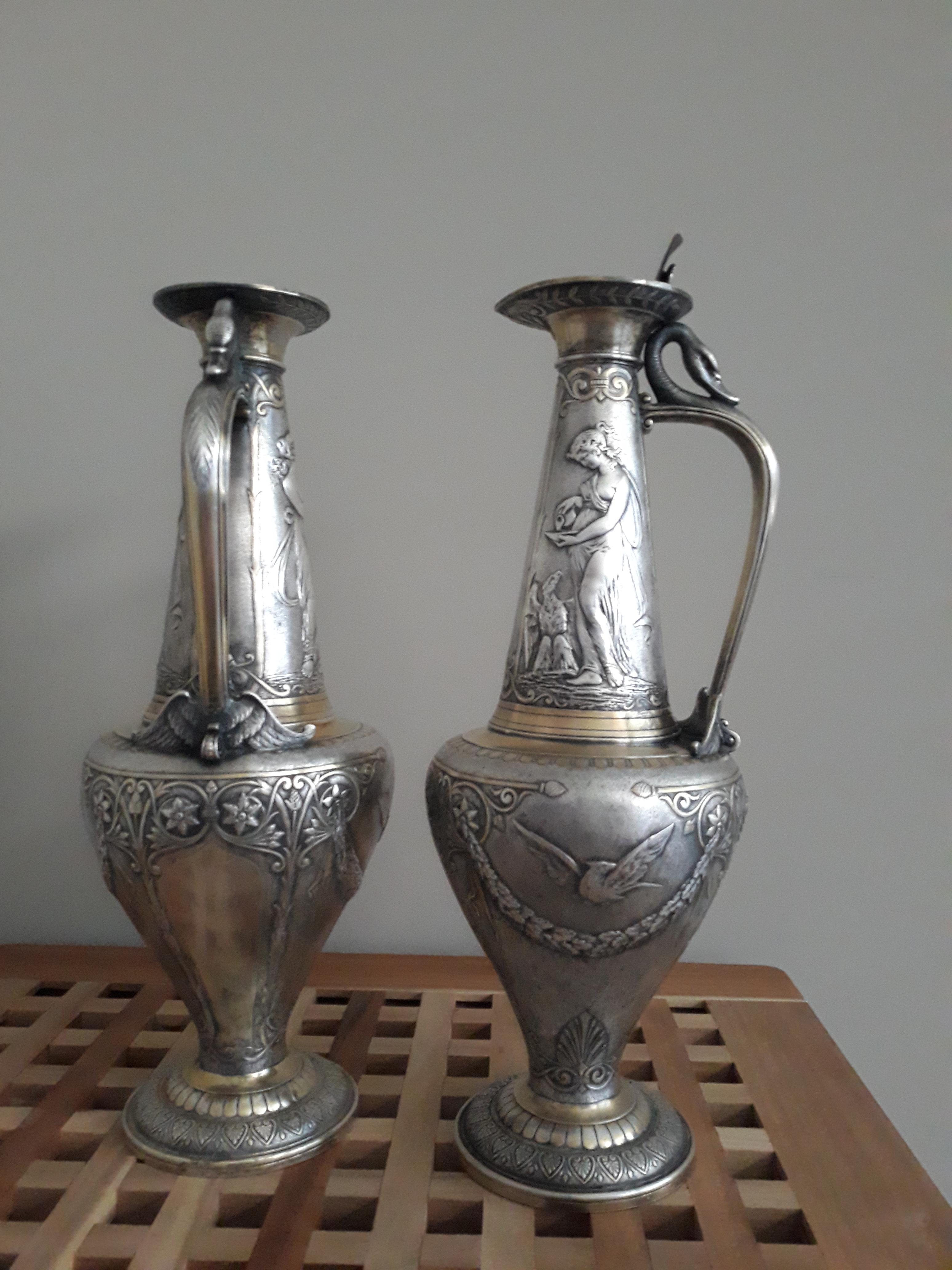 I have this pair of Elkington & Co pitchers which were passed on to my family by my husband's Grandfather. He served as a pilot in WWII and was stationed in England and Germany during that time frame. I do not know where they were purchased or how much he paid for them. The cafter jugs are identical with greecian design and phoenix design. There is some gold embellishment. Both jugs have engravings on the bottom (see pictures for details). From my research I believe that both were produced in 1876.