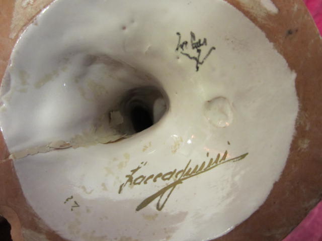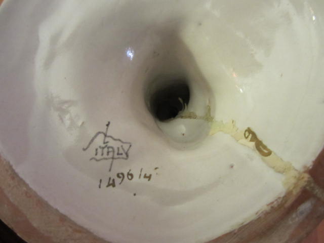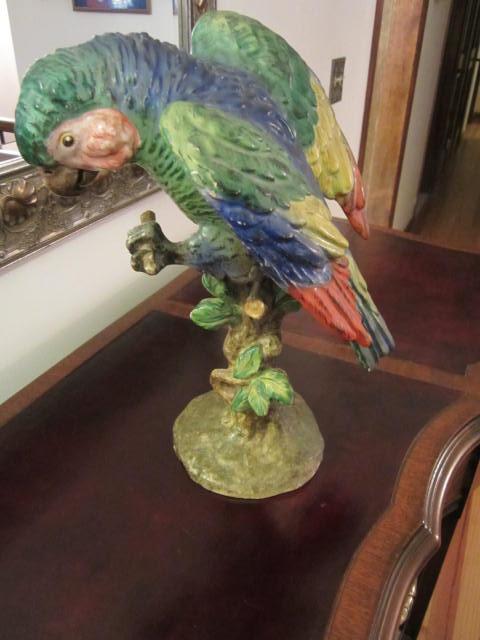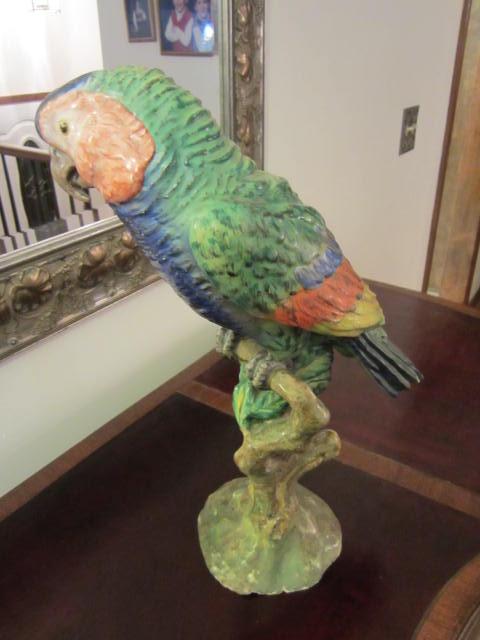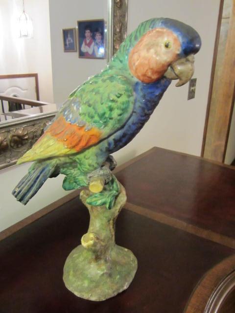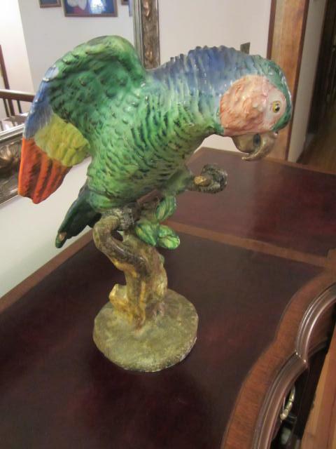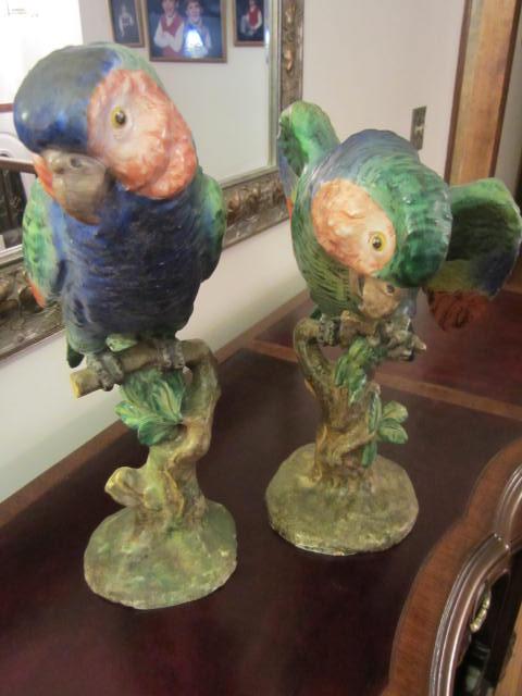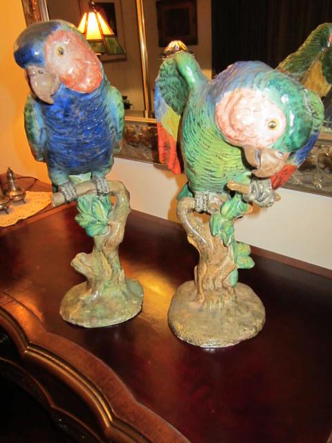 These parrots were a gift to my wife from her grandmother. They were brought to the United States from Italy by my wife's great grand mother. Not too much to add other than there are inscriptions on the base of these parrots that I don't understand and can be seen in my photos. They are beautifully colored and really stand out. The parrot with its wings spread is 12 in. in height with a weight of about 4 lbs. The other taller parrot is 14 in. in height with a weight of about 3.5 lbs. The tip of one of thie wings of the taller parrot is broken off and not found.