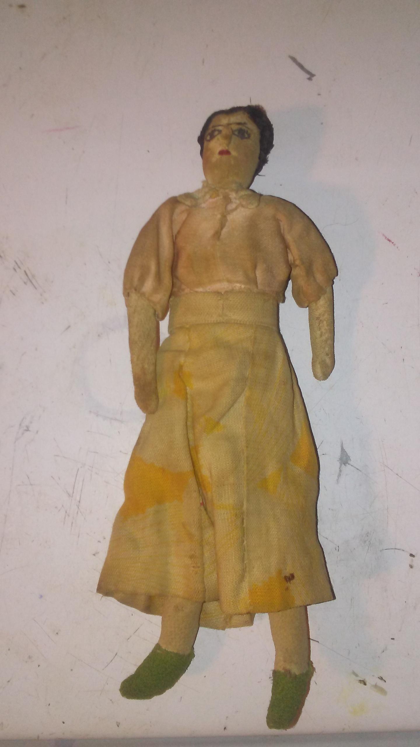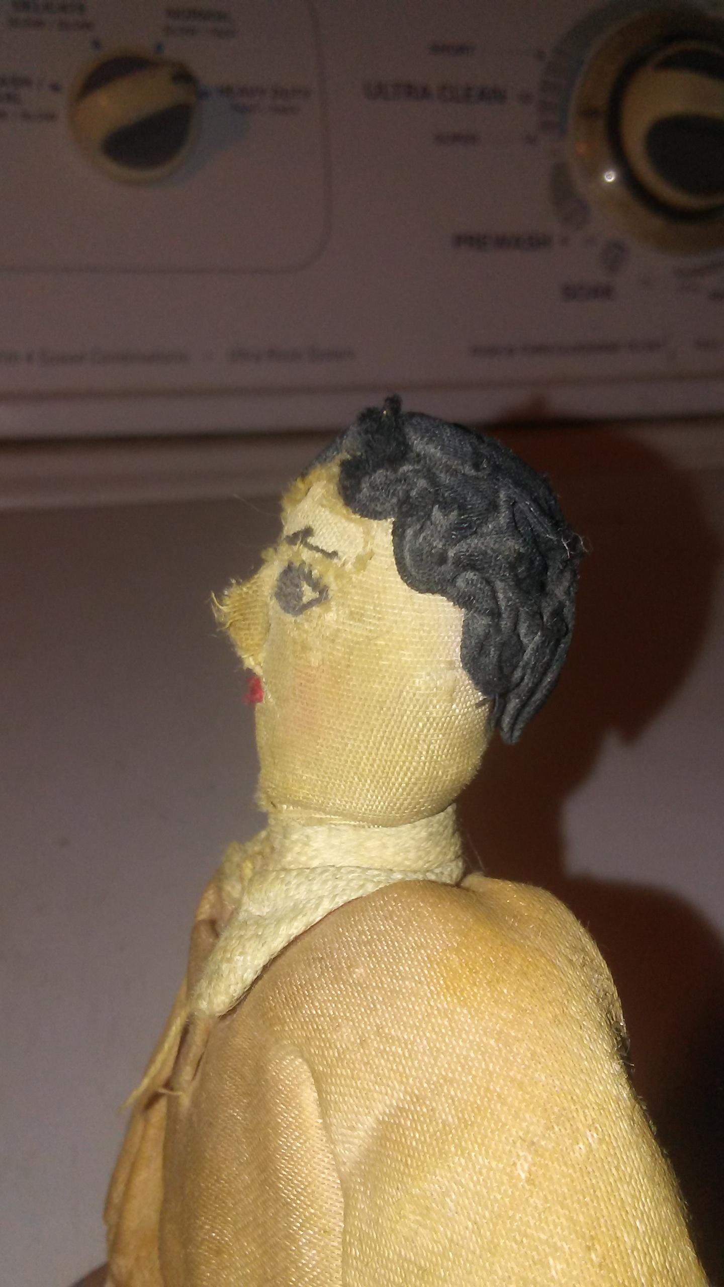 I don't have much info on this. I found it in some stuff I bought at an auction. If anyone has any idea of what it might be worth I would appreciate it. The entire thing is made out of cloth. And it looks as if it was homemade.