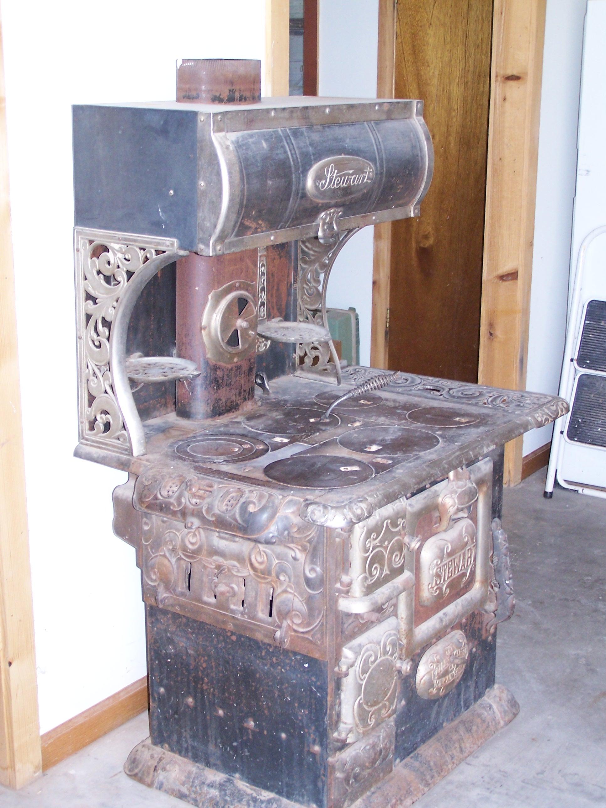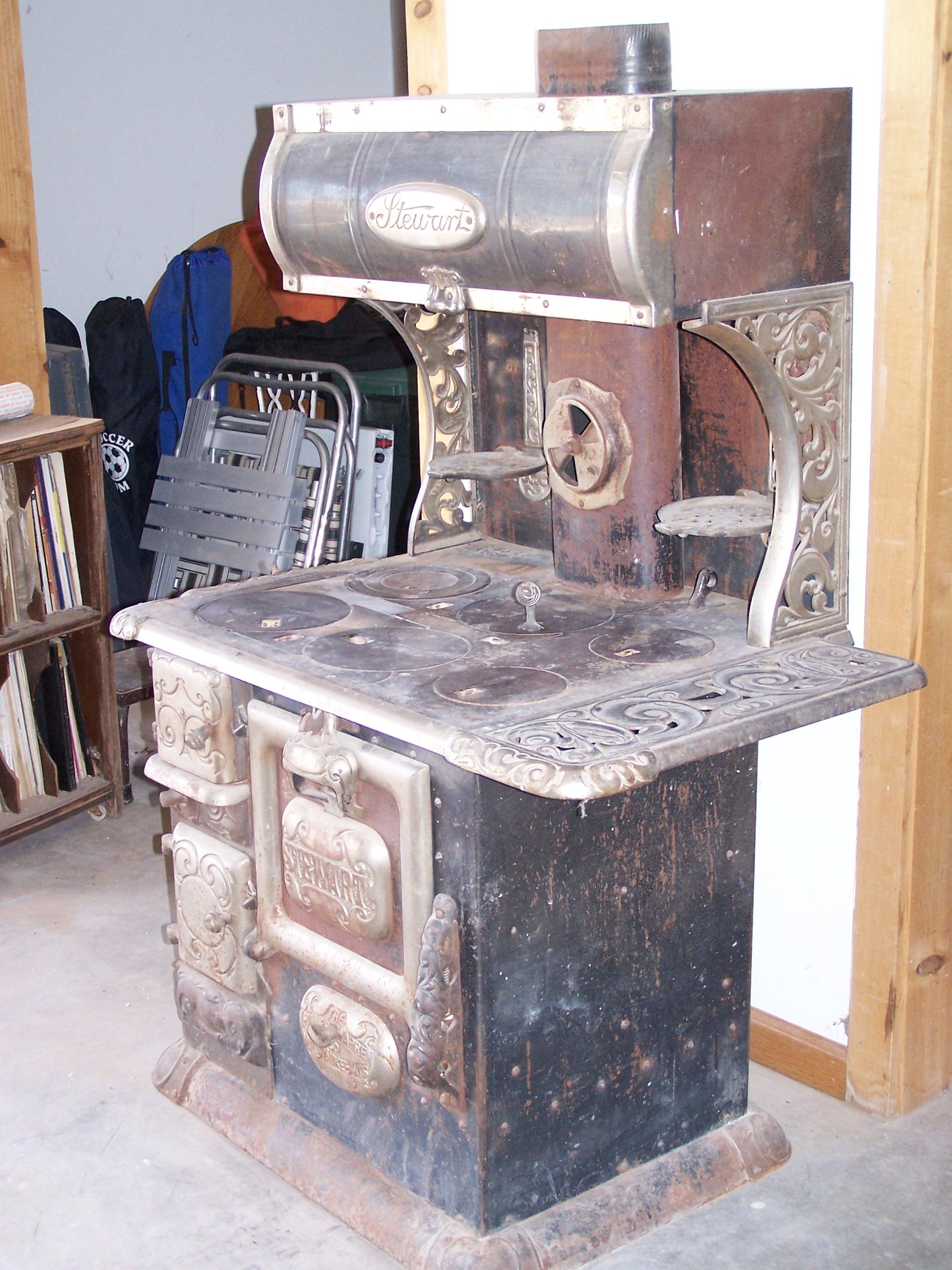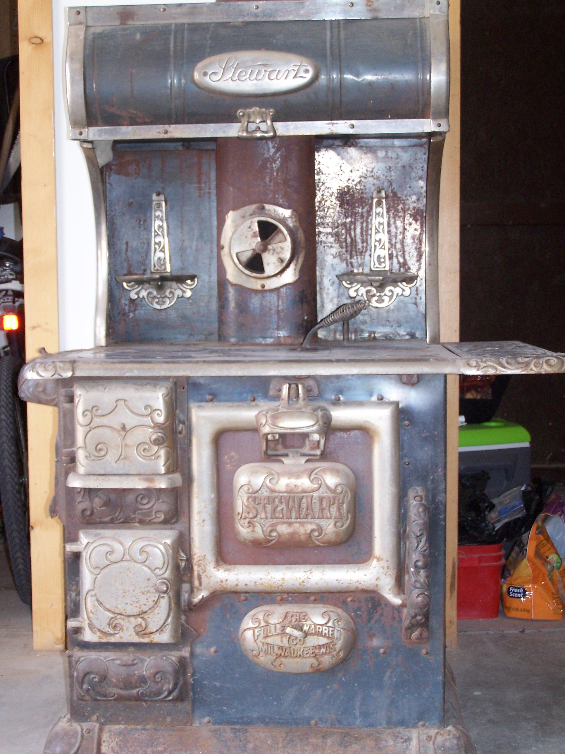 6 burner antique coal kitchen type stove, bread warmer with door, no broken or missing parts, Stove is a Stewart Fuller Warren cast iron Kitchen stove, magnet 80-14. It is in good condition, some rust on some surfaces, no holes or soft spots. Nickle trim in good shape also with some spotting. Around base has rolled steel caped with cast caps, rather than plain base. Has fold down pot warmers off back wall, some ornate nickle decorative accents with matching cast accents on front and some other surfaces, plus nickle trim and surface accents. Mother had and used it for 20 years, has been in dry protected storage for 40 years, was restored by Mother but now shows age. Appears readily usable and would respond very well to restoration efforts. Pictures included (I hope)