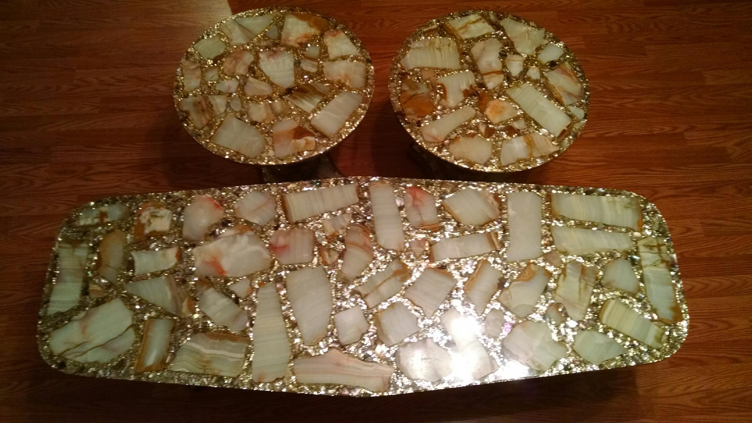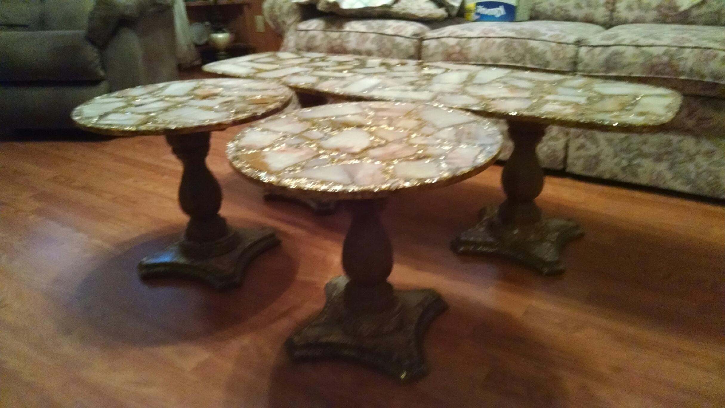 If it he metal was brass the metal would turn green in the bends. I talked to a friend and he works granite , he said thatthe small tables would valueat around$175.00 to$275.00 and the bigger one$300.00 to$400.00 i would not take any less.you would be better off selling thein the big cities such as New york,florida ,los angeles they hav fancy restaraunts that would us them i know your thinking they are not tables these kind of restaraunts have livingroom eating areas so they would look good