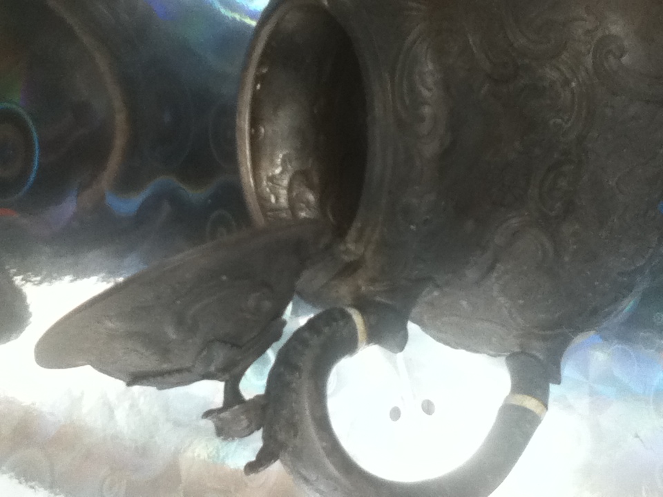 Silverplated coffee or teapot with a flower motif, two inlaid bone or ivory rings in the handle. It is six inches high and six inches wide. On the bottom, it has several small stamps I was able to photograph which seem British. I have not polished it at all, so it's pretty black. I'm thinking the best way to clean it would be to immerse it in a commercial preparation that hotels use. The home remedy of aluminum foil, detergent and salt apparently strips the silverplate. The wingnut tht holds the decorative rose to the top seems to be an original part of the piece, but I imagine indicates it's not a truly valuable piece. I am curious as to how much I could sell this item for. I received it free. It came from a family on Maui.