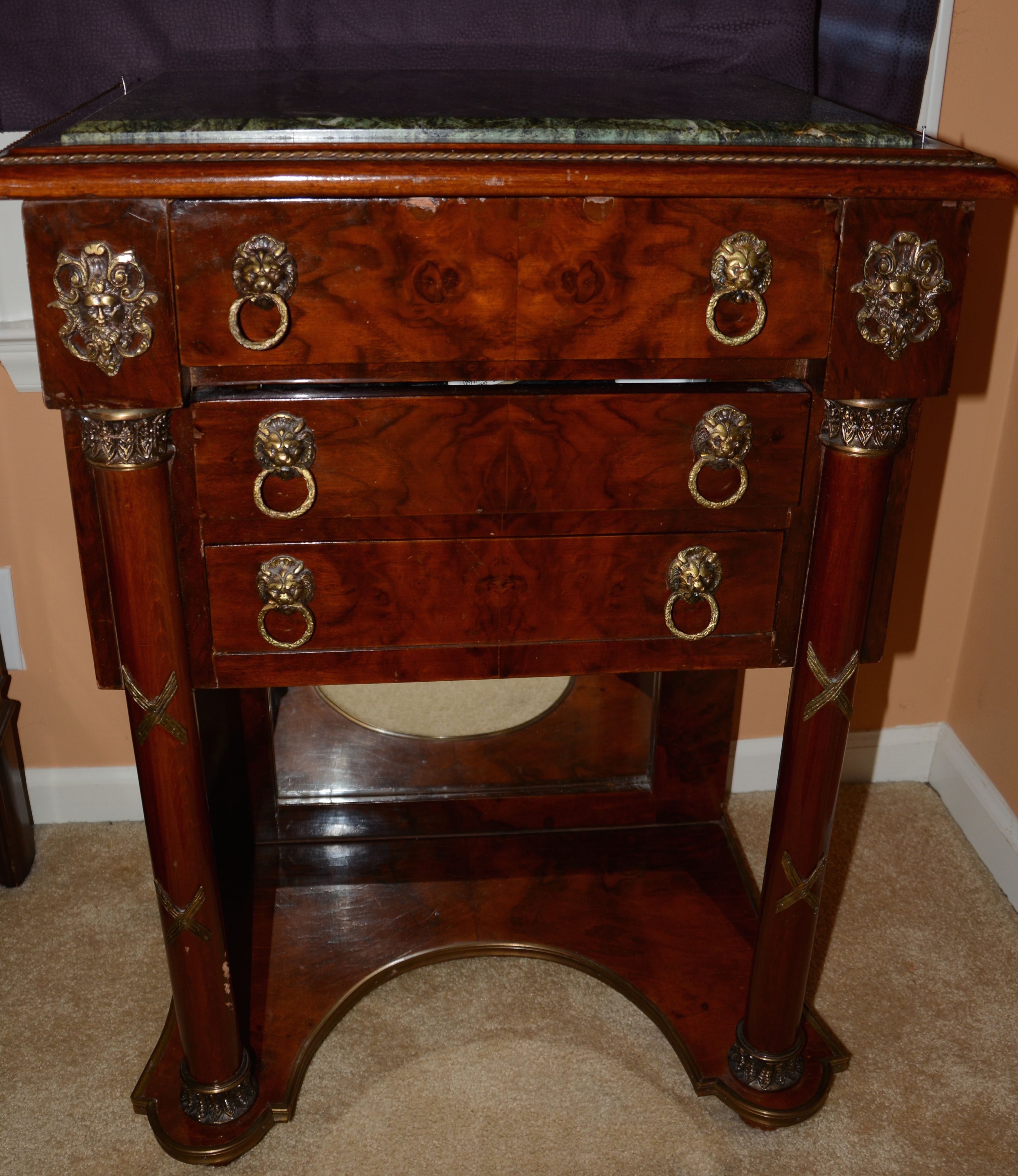 I was told this was an antique commode....the semi-circle bottom was where the commode went. Not for sure if this is the correct answer. Any information would be appreciated including the value. There are two of these! Green marble top with ornate brass hardware. No markings are anywhere on the piece. Thank you!