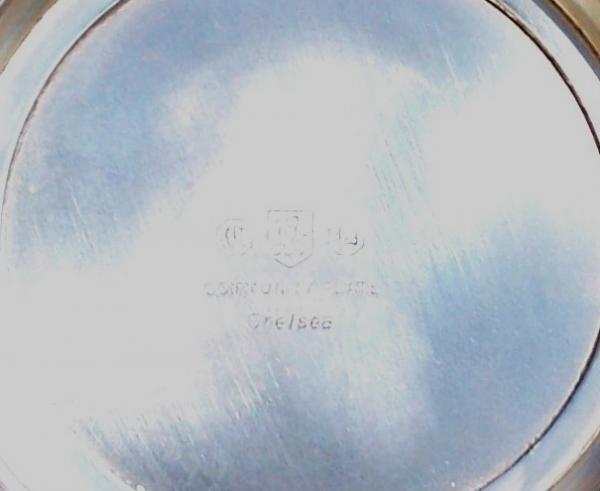 This is a very delicately and intricately floral and scroll engraved silver teapot. The engraving encompasses the top and rim portions of the vessel with engraving and scrollwork on the handle and spout as well. The mark has three symbols: an Olde English "C" in an octagon followed by a winged gryphon? or creature on a shield followed by an Olde English "P" in an octagon. Under the symbols are the words "Community Plate" followed with "Chelsea" underneath. The teapot has a short round base.