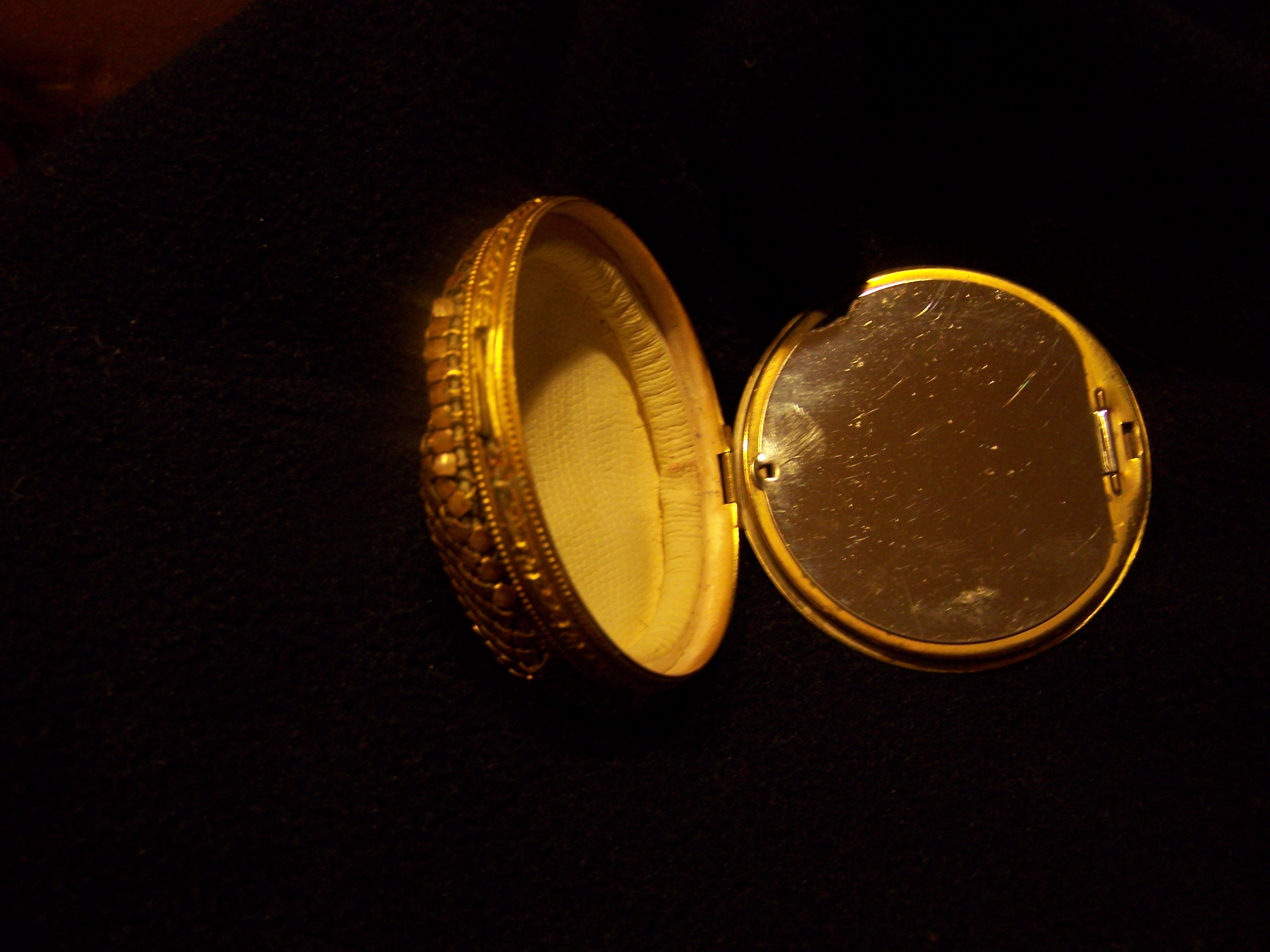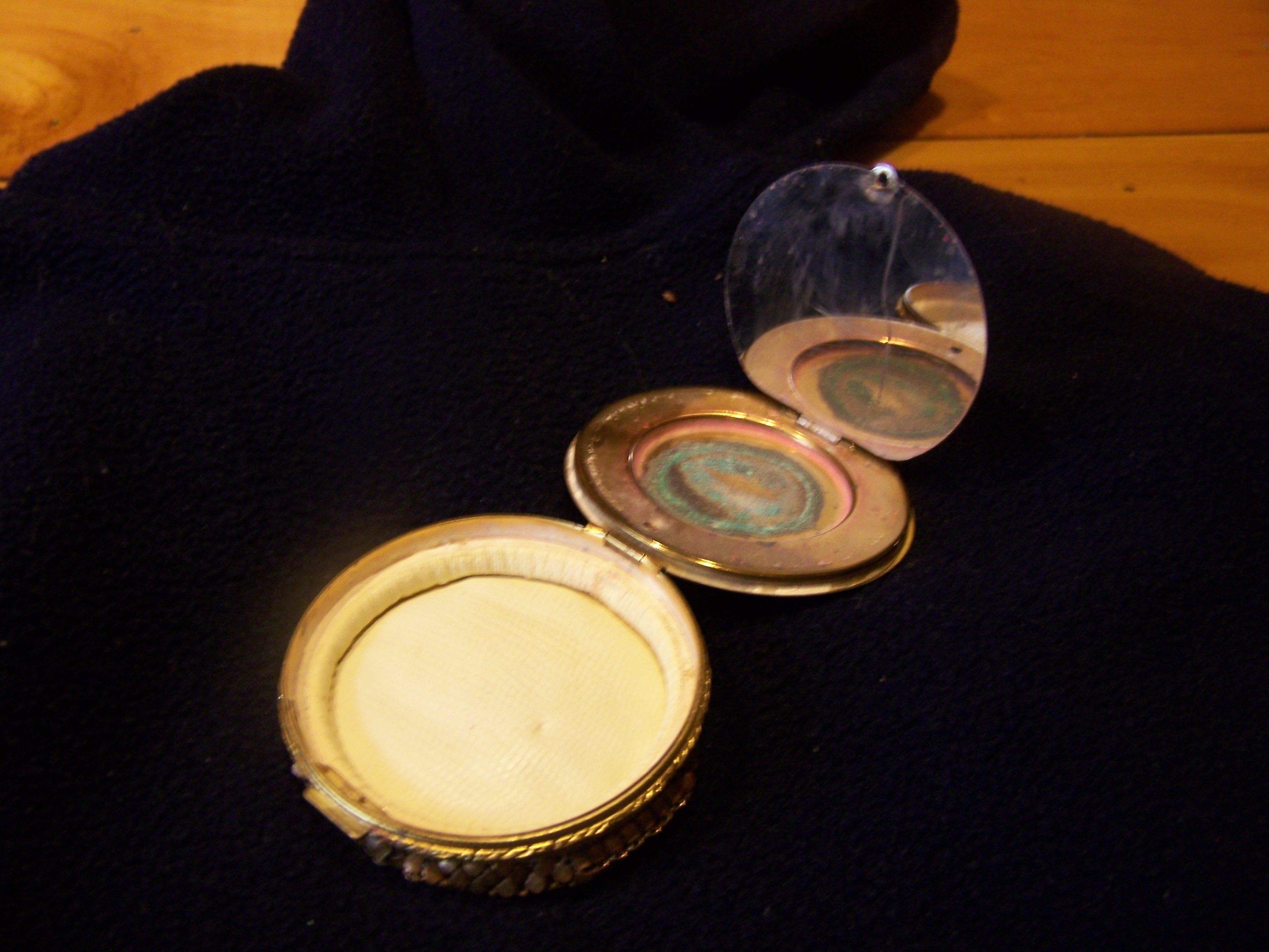 The mirror inside is made of shiney metal, not an actual mirror which is as unusual as the metal mesh flexable backing. Mirror opens up also, which I had just found out, strange!
