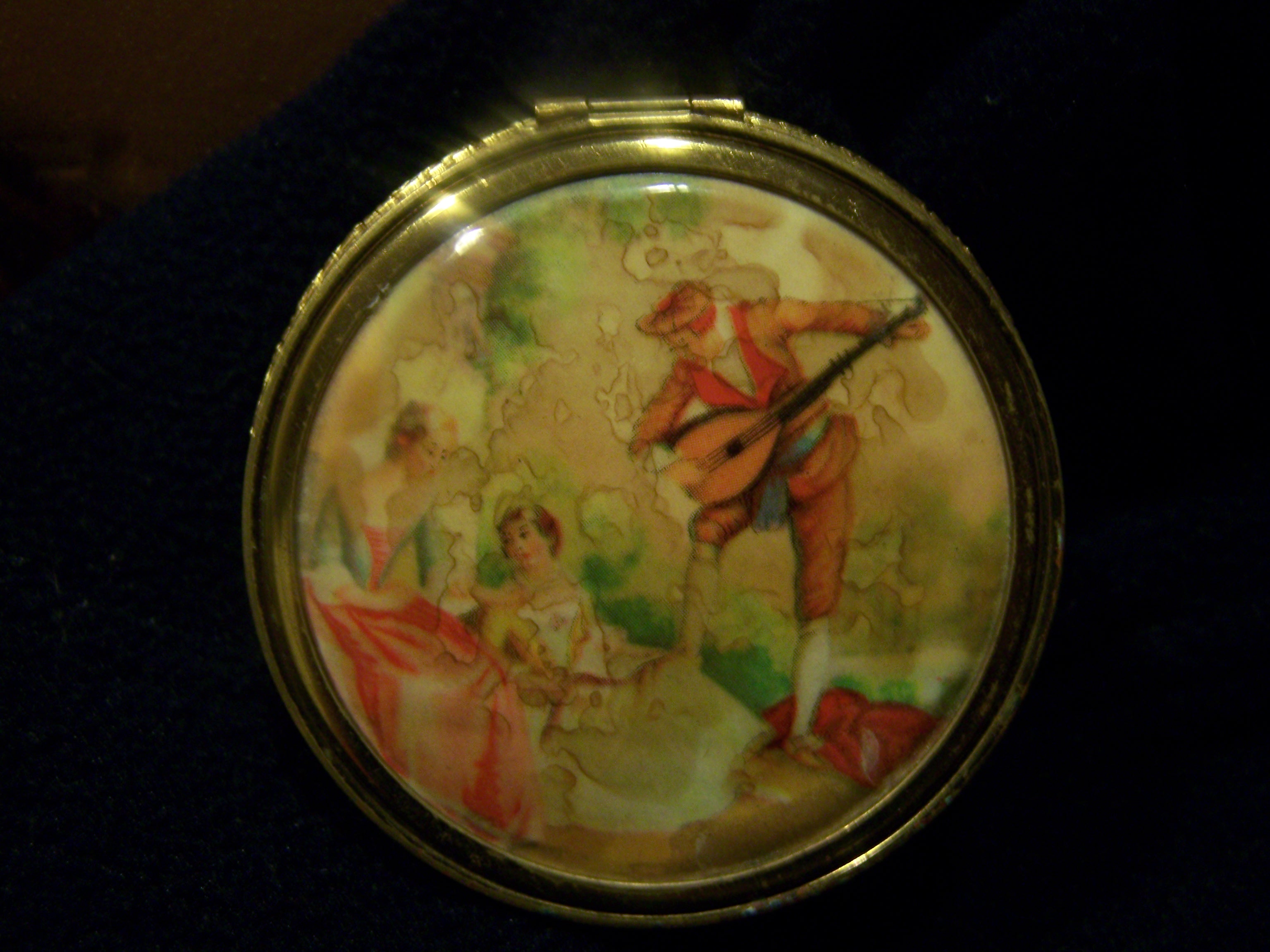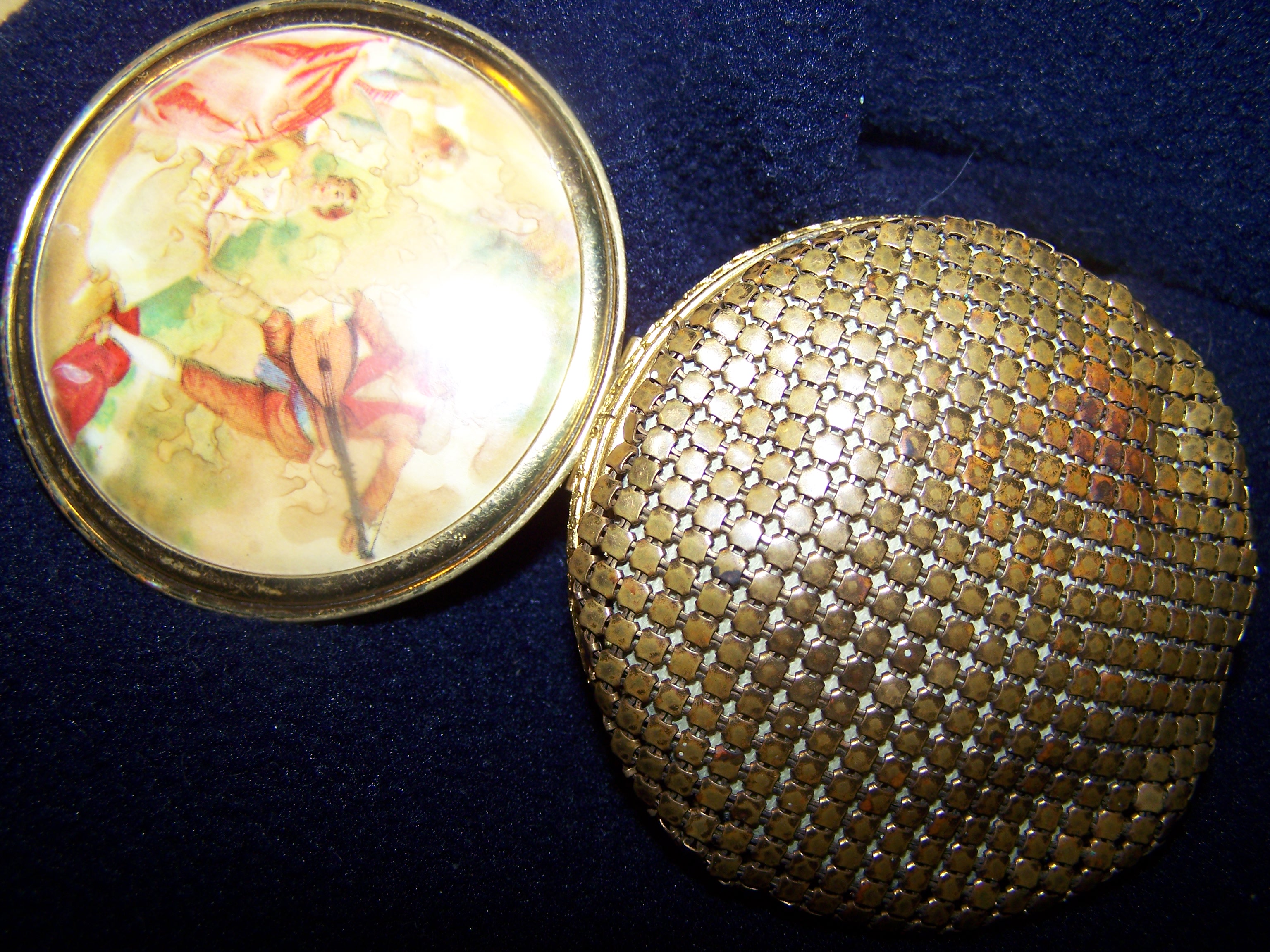 This compact has a pretty picture on the front and the back is a mesh style metal. The interior is some kind of white leather maybe and has an alligator/snake skin texture.