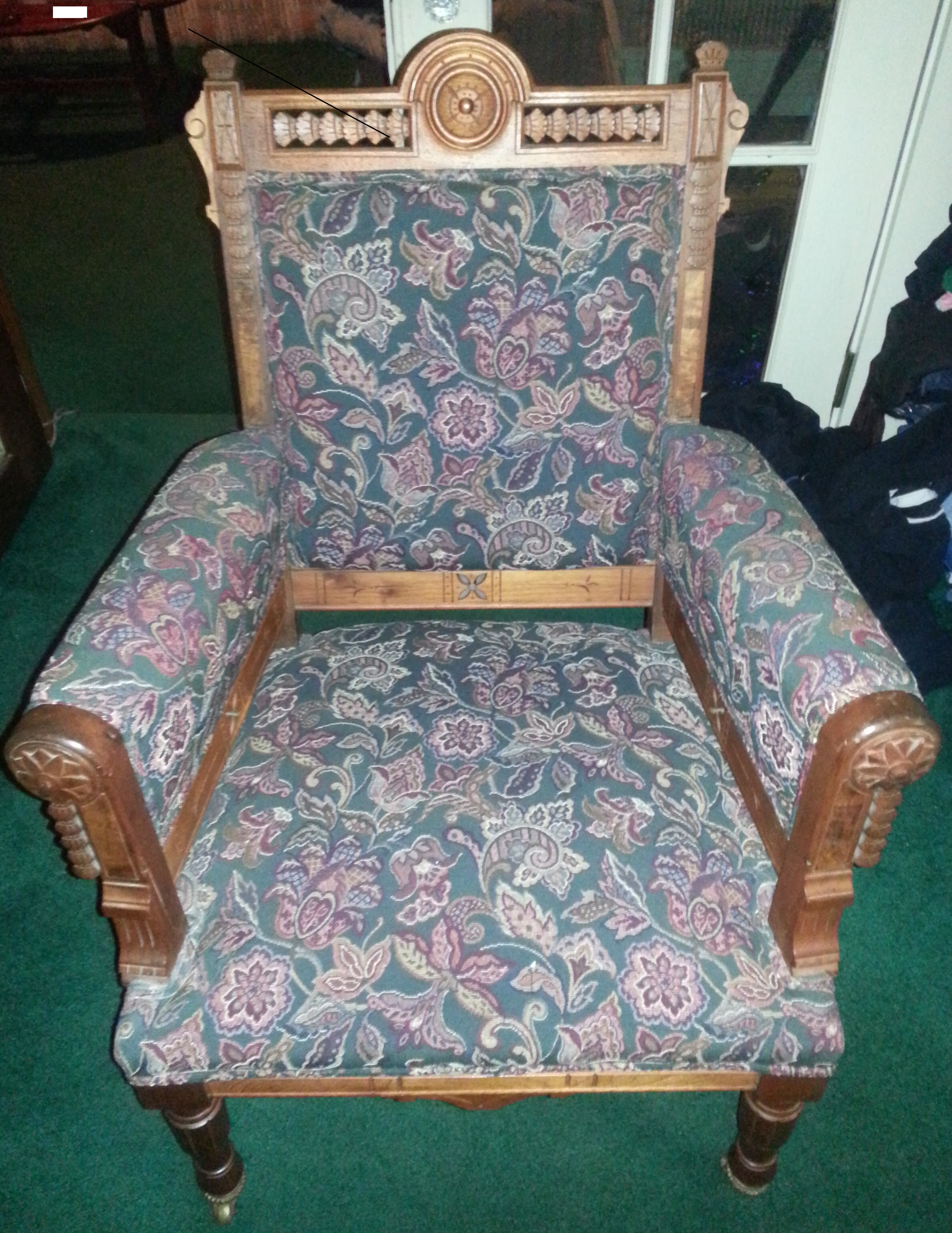 Your chair dates from about 1880, pieces of this type and style are currently way out of vogue and often go at auction for less than $125.00 these days.