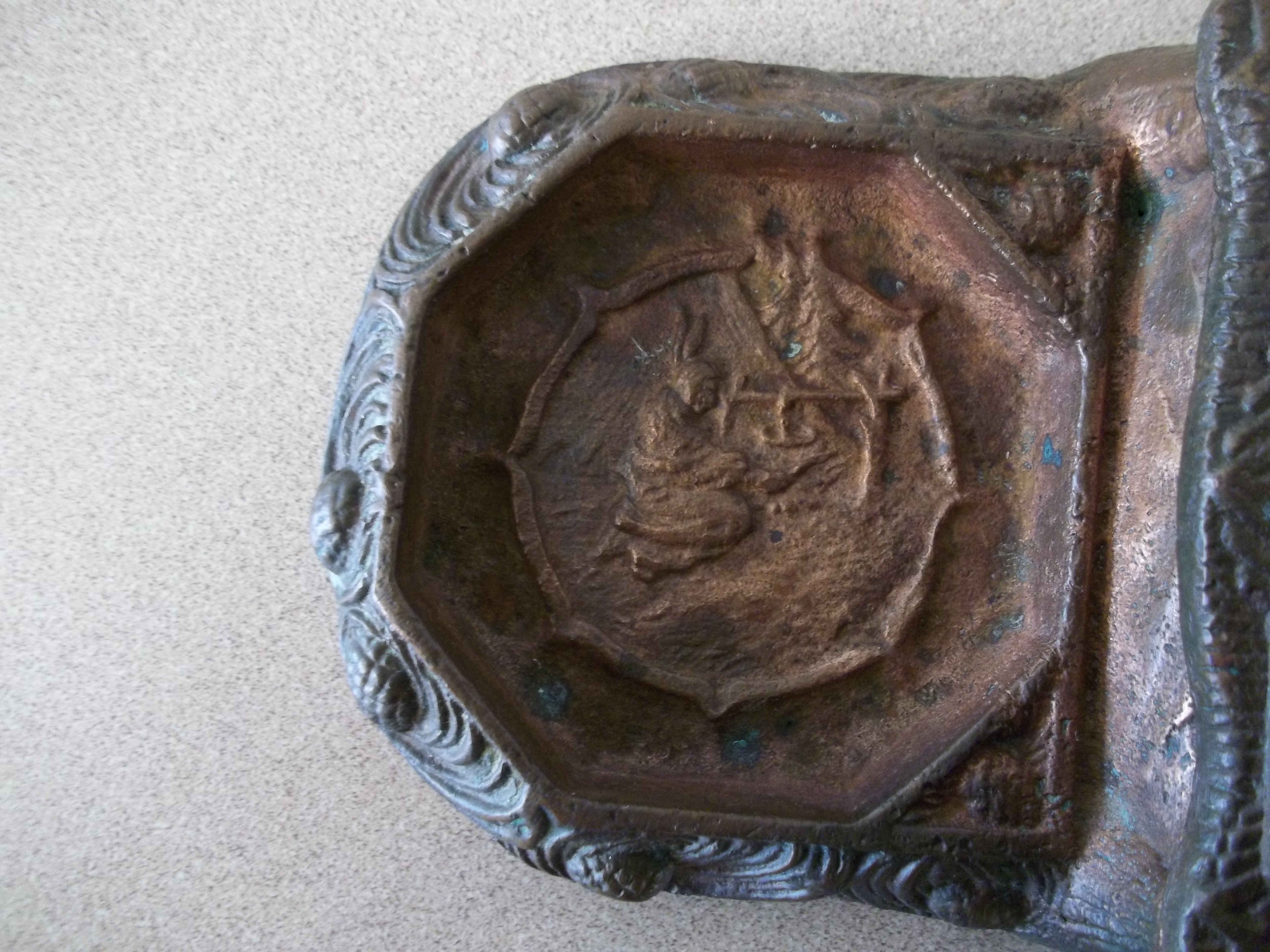 The ashtray was purchased in 1998 by my late brother at an invitation only estate auction in Mountain Brook, Alabama. As information, Mountain Brook AL is one of the wealthiest cities in the United States. The symbol markings on the antique ashtray are unique. There is an Native American chief head & bust on the lid. On the back of the ashtray are two geese in flight. On both sides of the ashtray is a Native American in a canoe on a river. In front of the ashtray there appears to be pine cones with a raised metal design. In the bottom of the ashtray area is a native American cooking over an opened fire . There is a heavy layer of patina and tarnish on the surface area. The condition of the copper ashtray is excellent. No visible signs of wear and tear.