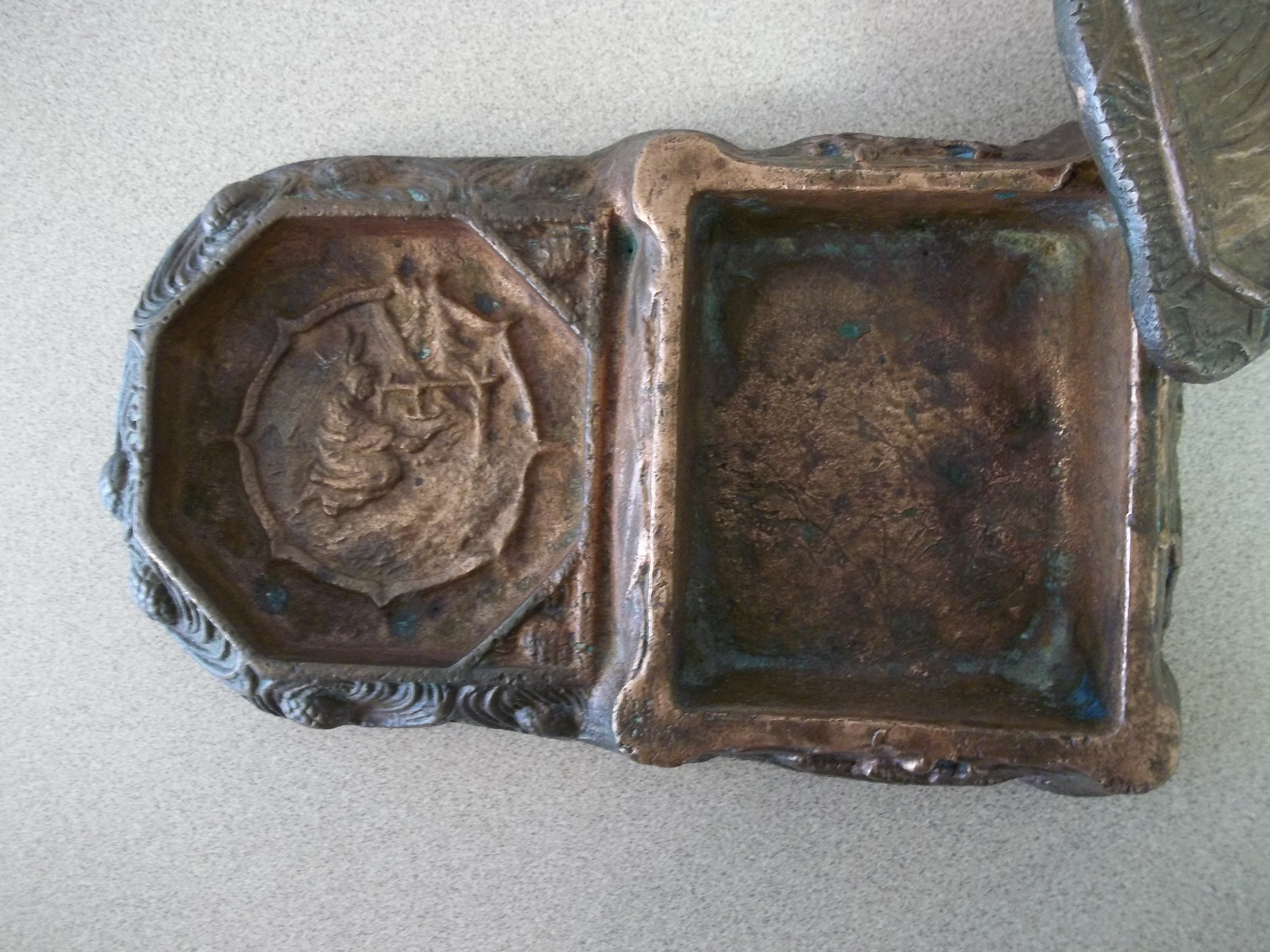 I am assuming that this antique piece is an ashtray with a combination tobacco compartment. There appears to be an ashtray area in front and the lid covered compartment directly behind it. The ashtray weighs 4 pounds. The dimensions of the ashtray is 6- 1/2" (L) x 4" (W) x 1-1/2" (H). The ashtray is made of copper. There are no visible hallmarks or maker's mark on the item. Also as a note, on the back of lid and underneath the ashtray there are visible tool and striation marks. This could possibly indicate that the copper ashtray is hand made.