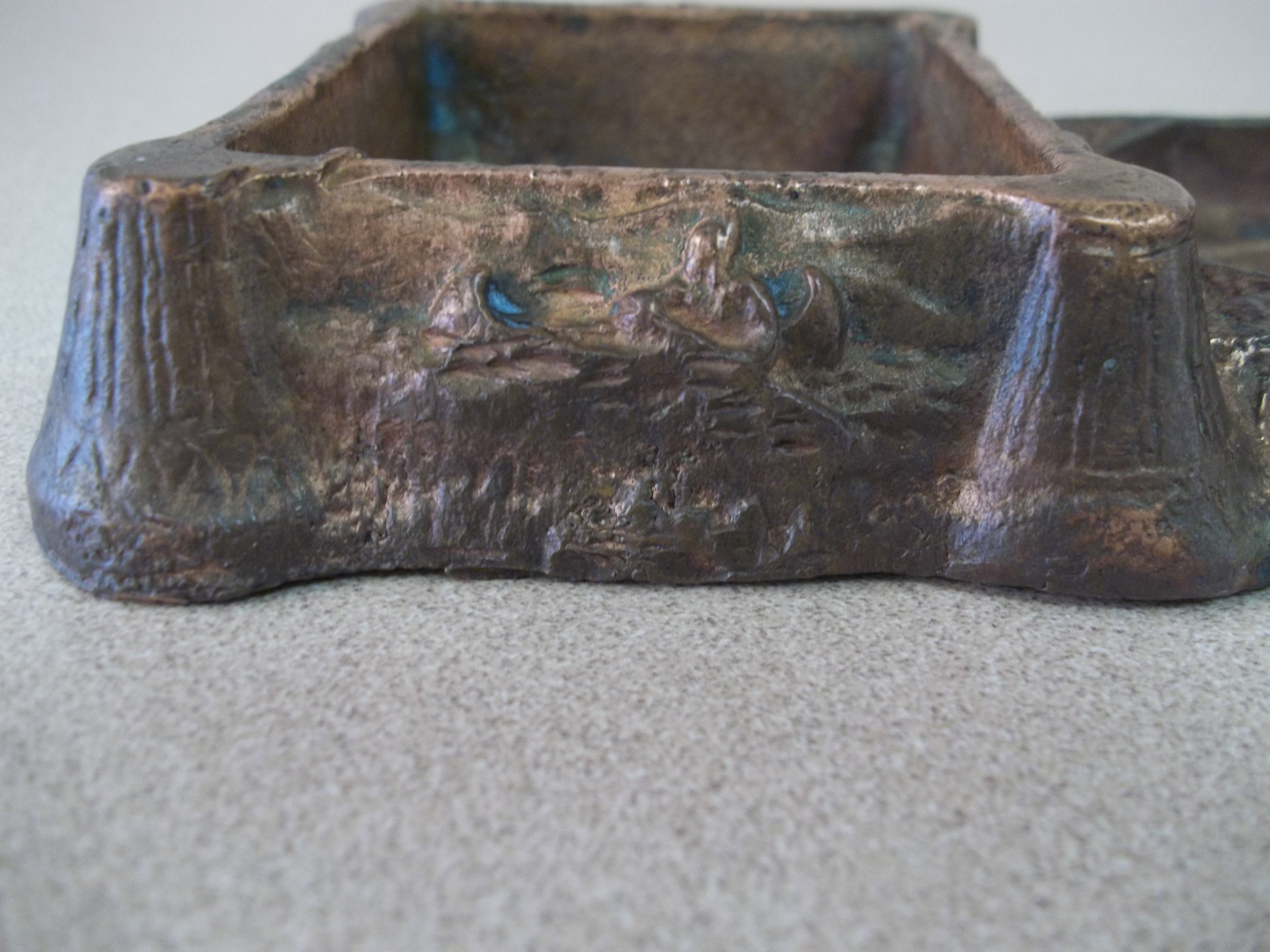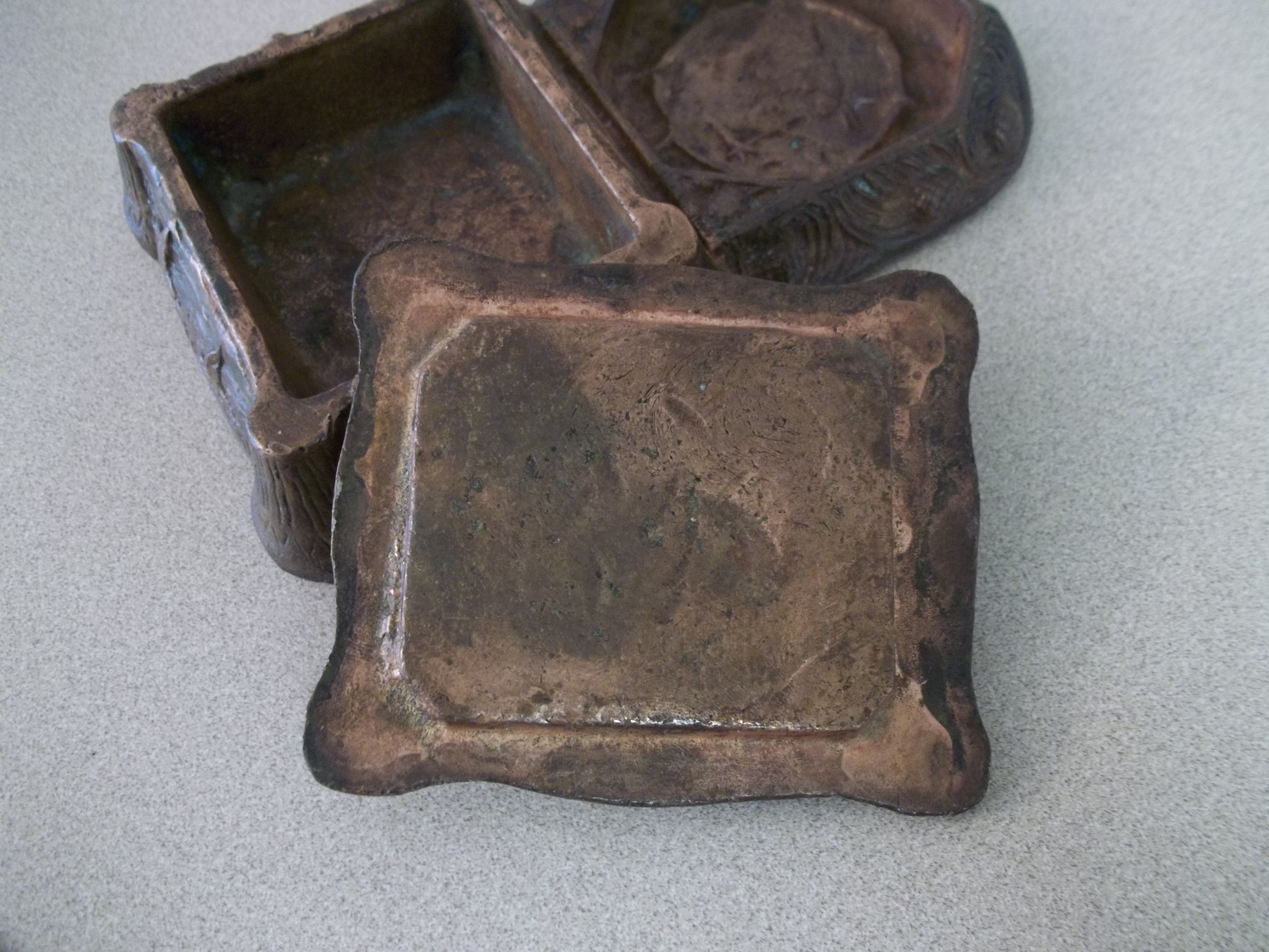 This piece is pure copper and appears to be handmade. It weighs 4 pounds. If you look on the back of the lid and underneath the ashtray you can see some type of instrument markings like a hammer. This antique copper ashtray was purchased by my late brother in 1998 at an invitation only estate auction in Mountain Brook Alabama. Mountain Brook Alabama is one of the most wealthiest cities in the United States. I doubt if they would have a cheap copy of a wood syroco mold ashtray inside a 10 million dollar estate.