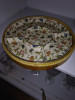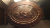 Physical Description: This antique serving tray is crafted from copper, showcasing a warm, reddish-brown hue typical of the material. The tray measures approximately 15 inches in diameter and has a depth of about 1 inch. The edges are slightly raised, providing a functional lip for carrying. The surface exhibits a smooth finish with some visible patina and scratches, indicative of its age and use.