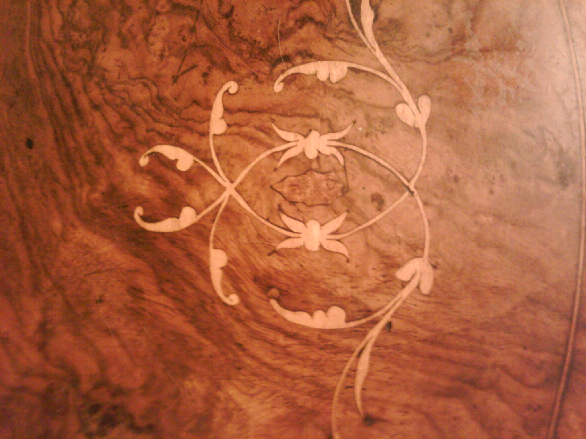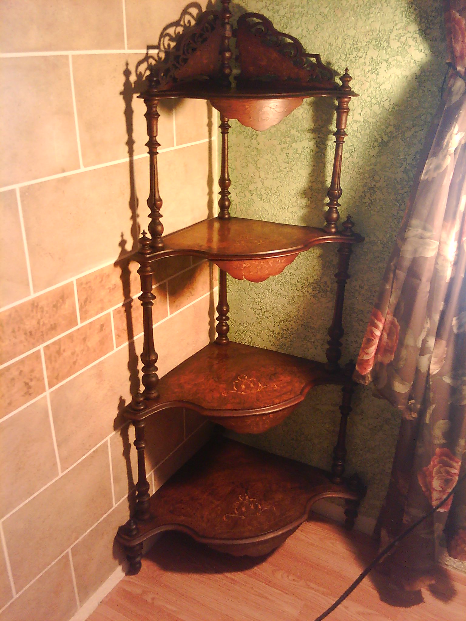 My dad's aunt bought this while she traveled as a concert pianist. She liked French and English with a little Asian in her collection. This is a very nicely crafted shelving unit with fine detailed inlay. I think it may be Mahogany with a burl look and the inlay appears to be sandle wood. I am only shooting in the dark about this because my limited knowledge in researching has led me to this point. I found one similar in England but is wasn't as nice.