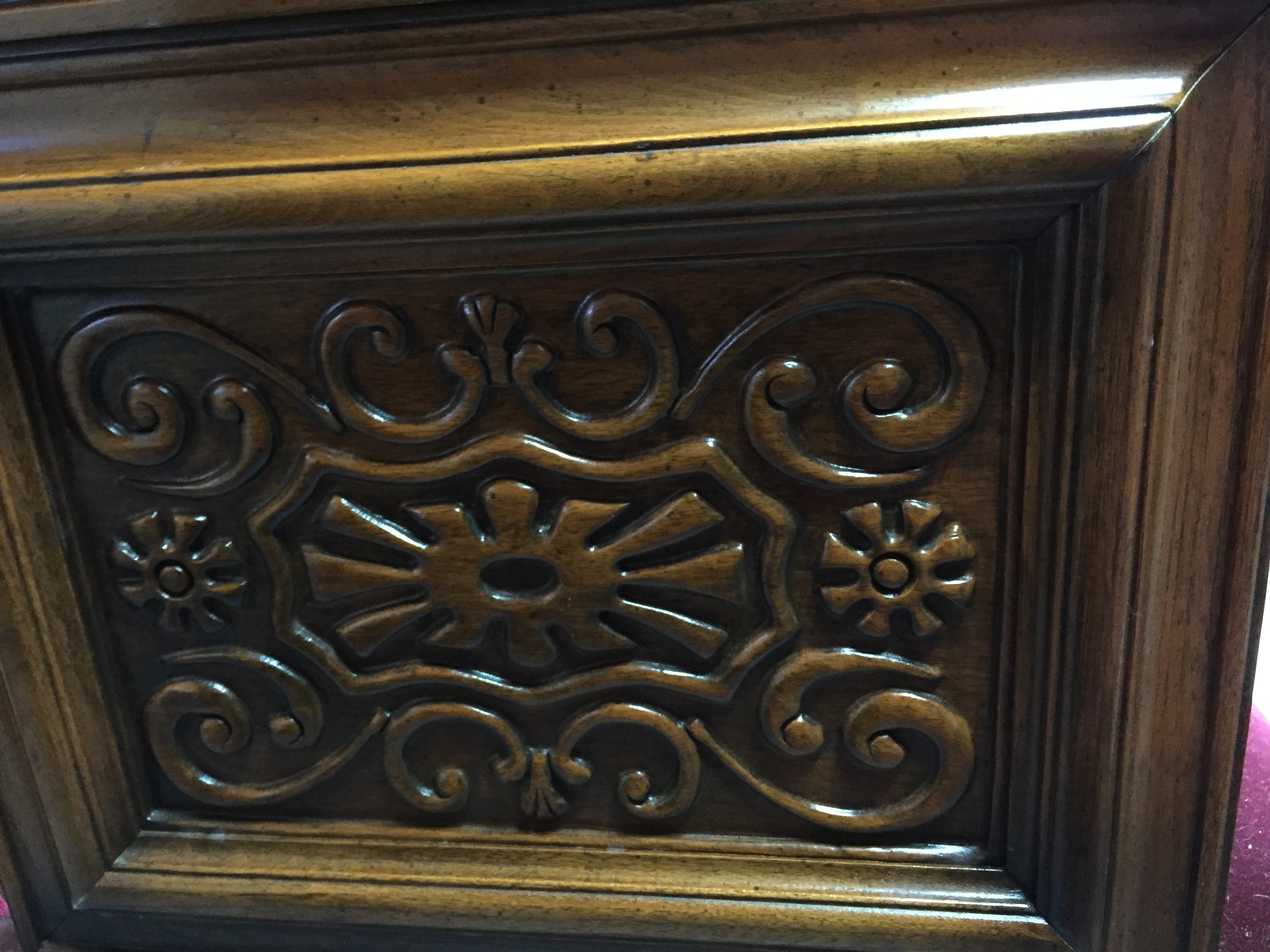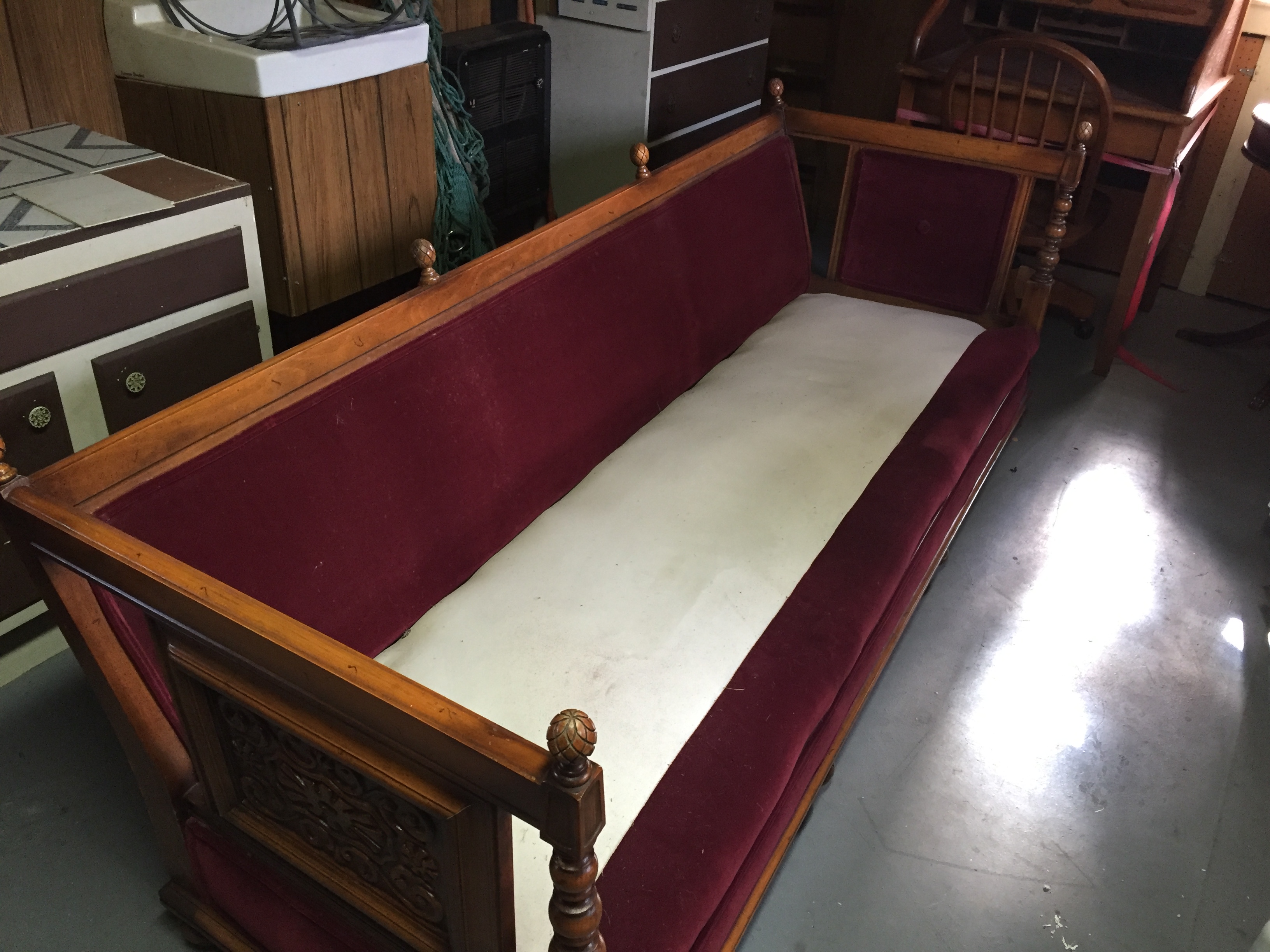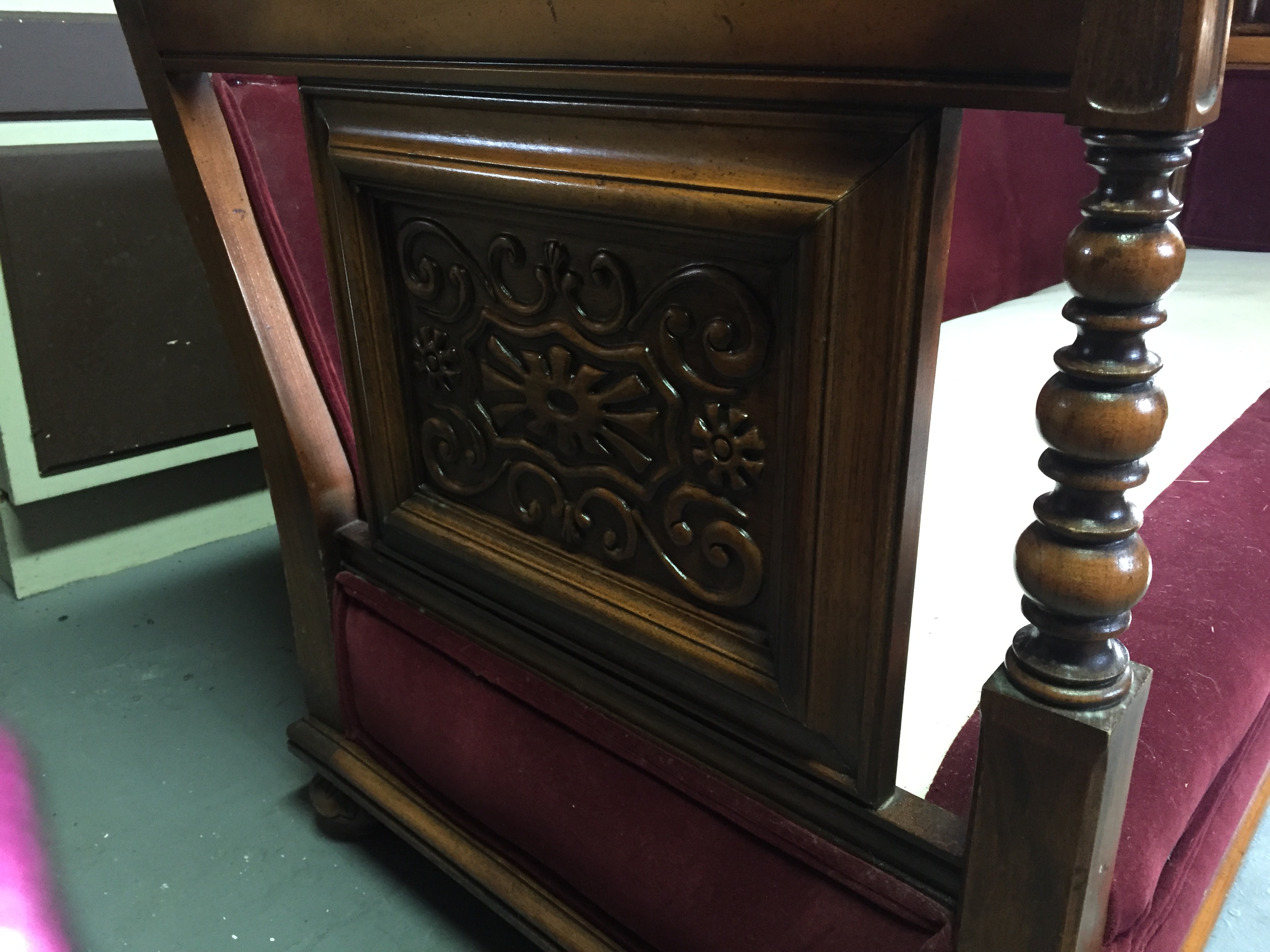 Red velvet with ornate wood carvings. No markings on it anywhere to see who manufactured or any information. Has cover over the bottom so I can't see if any tags or anything on the bottom.  Any help finding the year and manufacturer or any information would help greatly.  I can't find anything like it on the internet and I've looked at thousands of pictures.