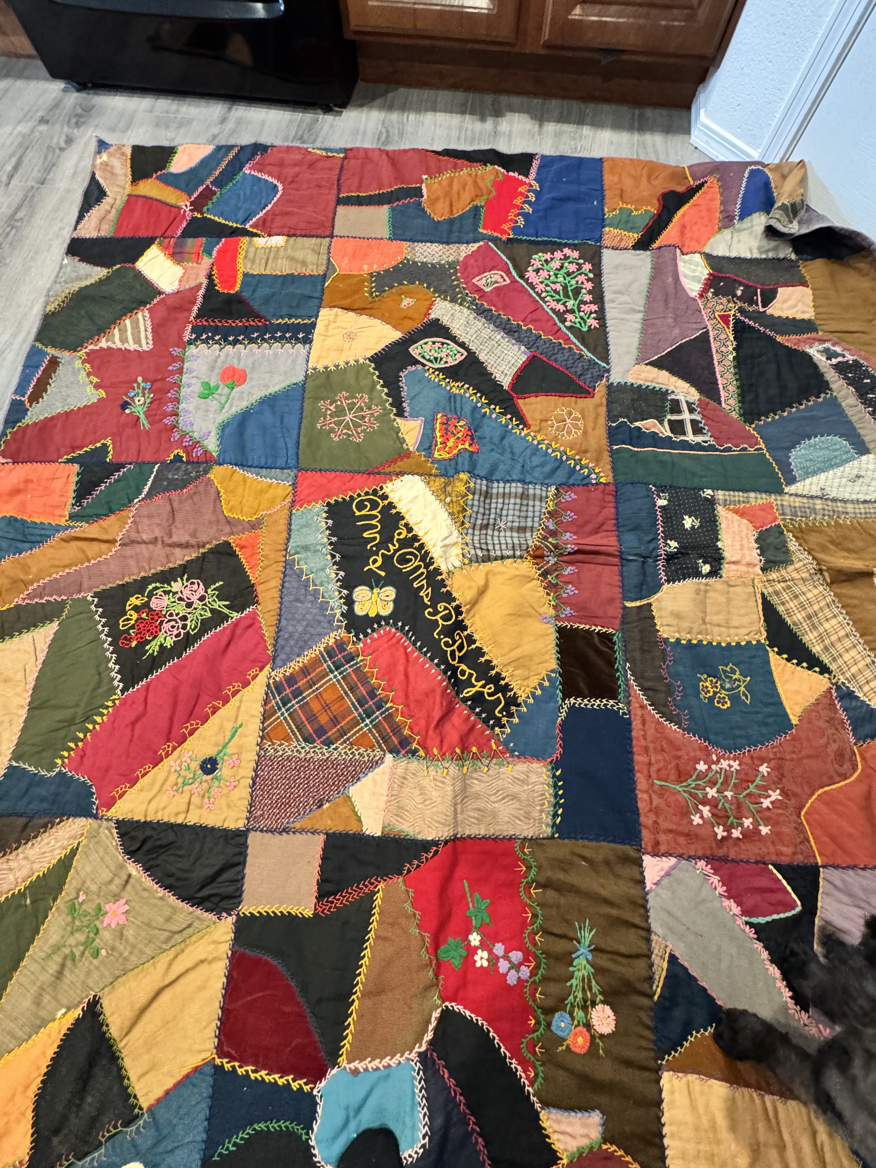 Antique Crazy Quilt by Mrs. E. M. Boyer. Made by Mrs. E. M. Boyer. Dating to Late 19th to early 20th century. Materials: Various fabrics, embroidery thread. Estimated value: $250 – $450. Condition: Very Good. The market for antique quilts is stable, with a moderate demand for well-preserved pieces. Collectors are particularly interested in quilts with identifiable makers.