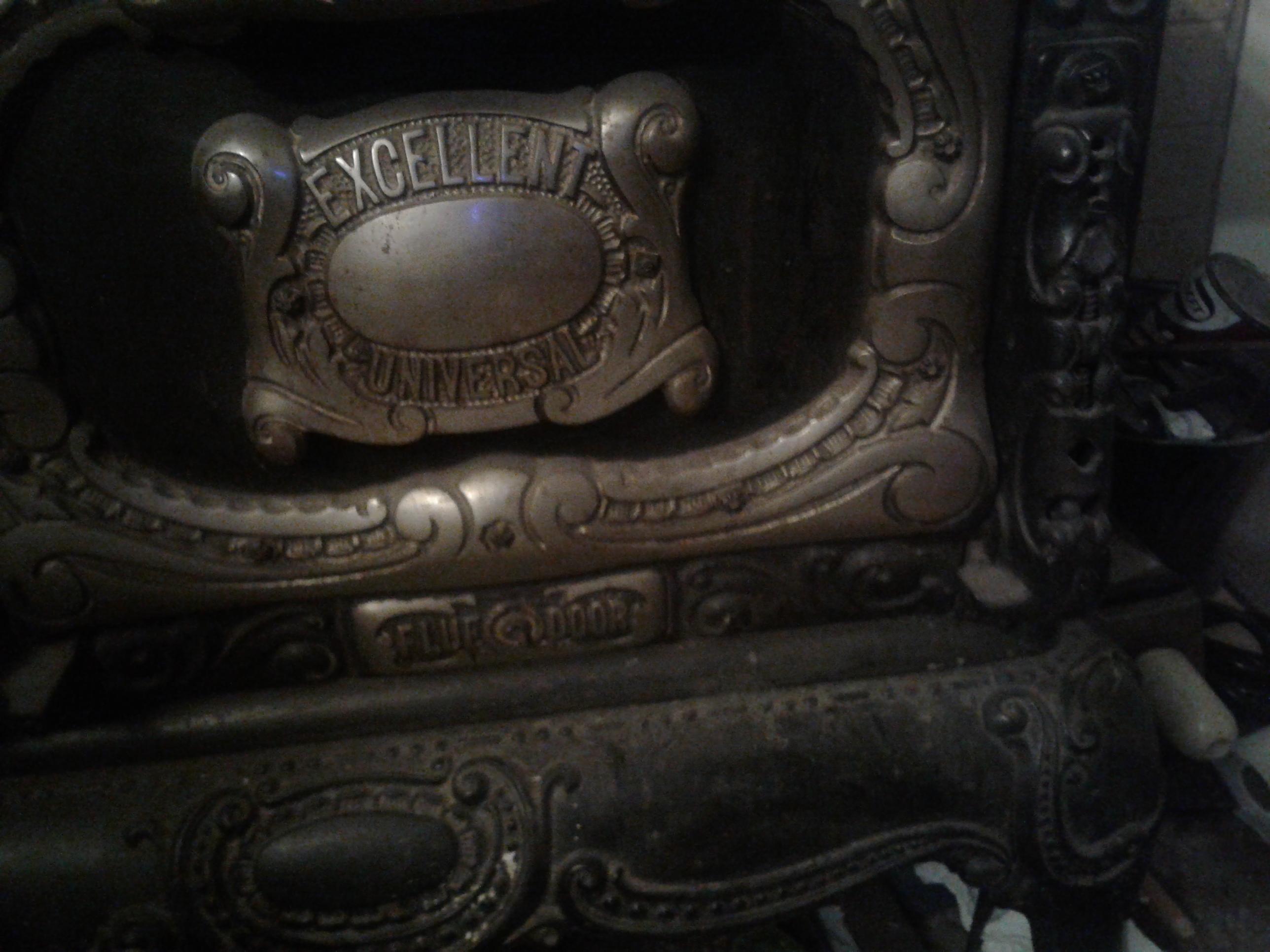 Facing the stove on your right is the Cribben&Sexton logo hailing from Chicago Illinois.On the front of the oven door in beautiful silver chrome are the words "EXCELLENT UNIVERSAL". Fold down the oven door and you see the inside white door with "EVERY UNIVERSAL WARRANTED" inscribed on the inside door, complete with the oven shelf inside the oven. Below the oven door are the words "FLUE DOOR" surrounded by silver chrome.