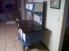 To the left of the oven door are the two smaller doors decorated in beautiful silver chrome where the top door utilizes a handle to crank up the (top container) for easier reach. Bottom drawer is for the wood fire {I suppose} to heat the stove.