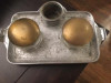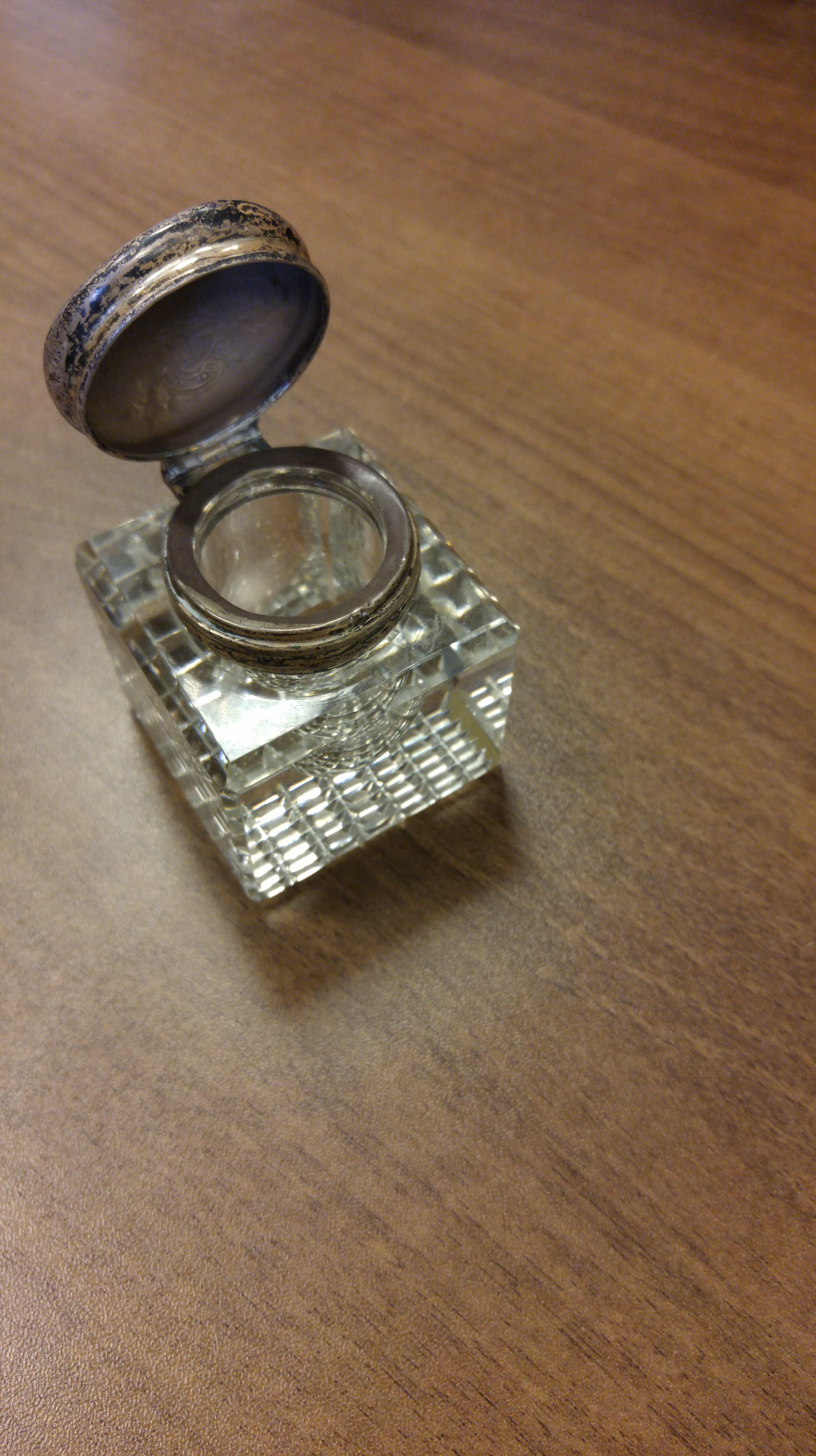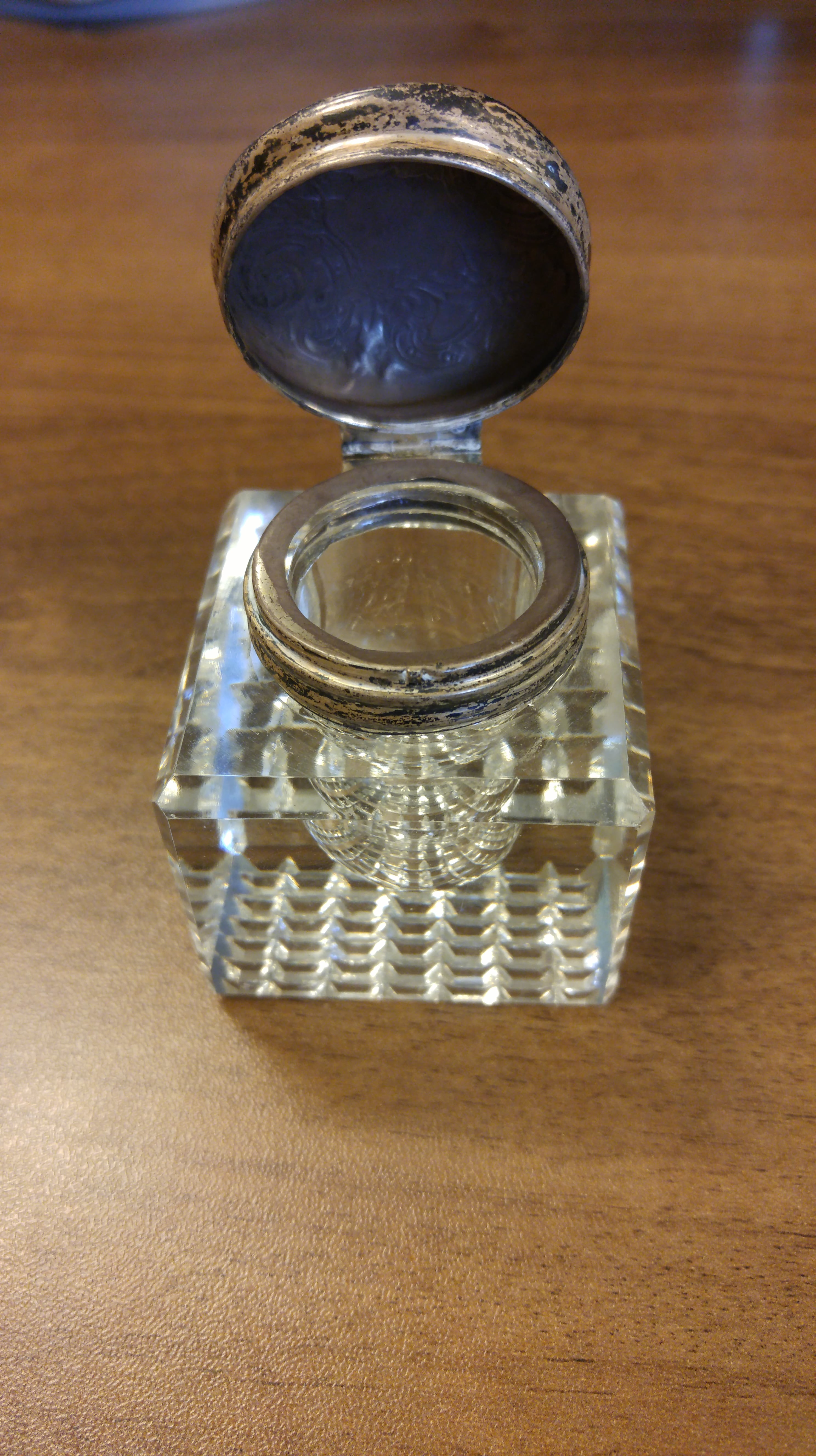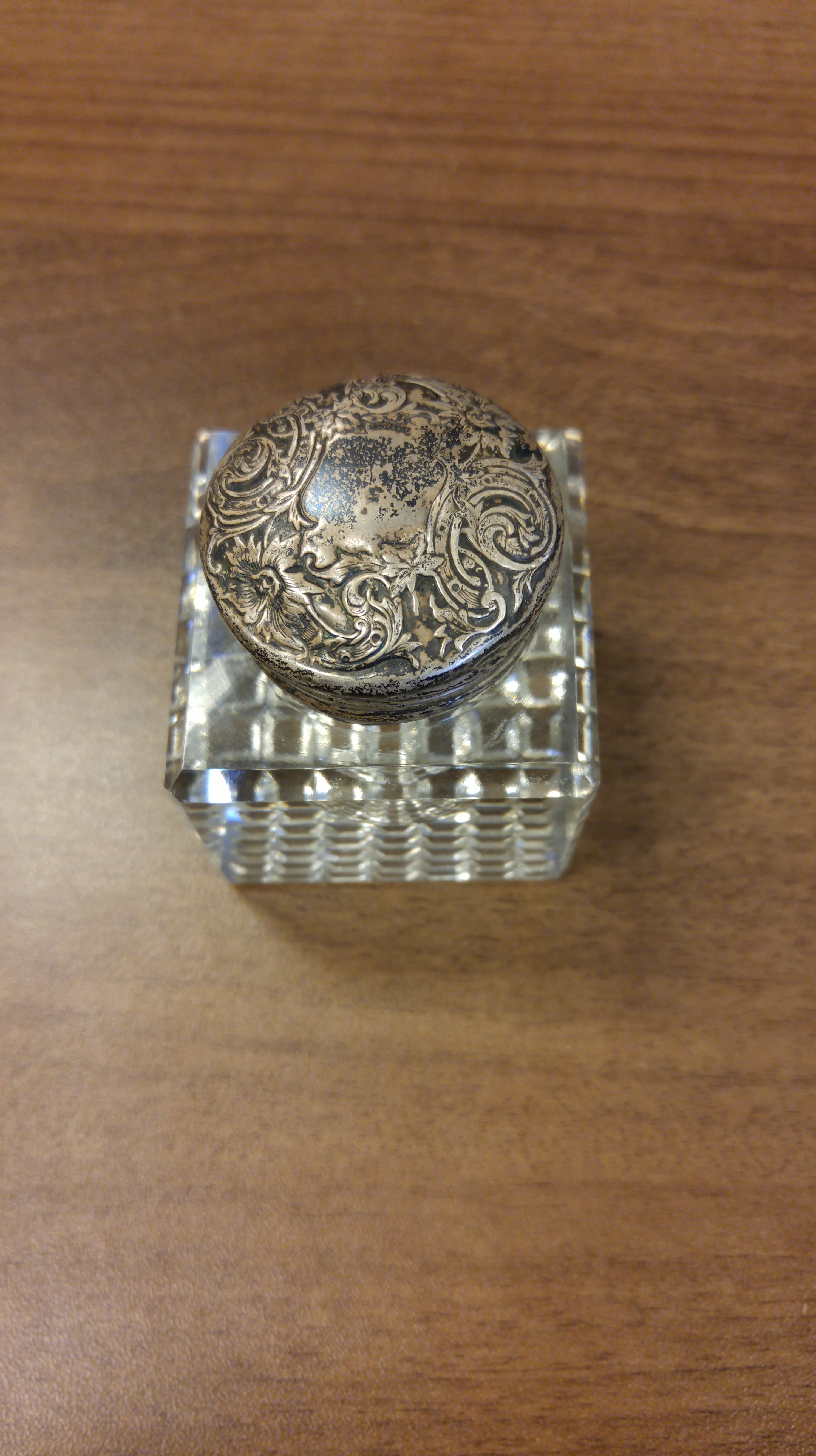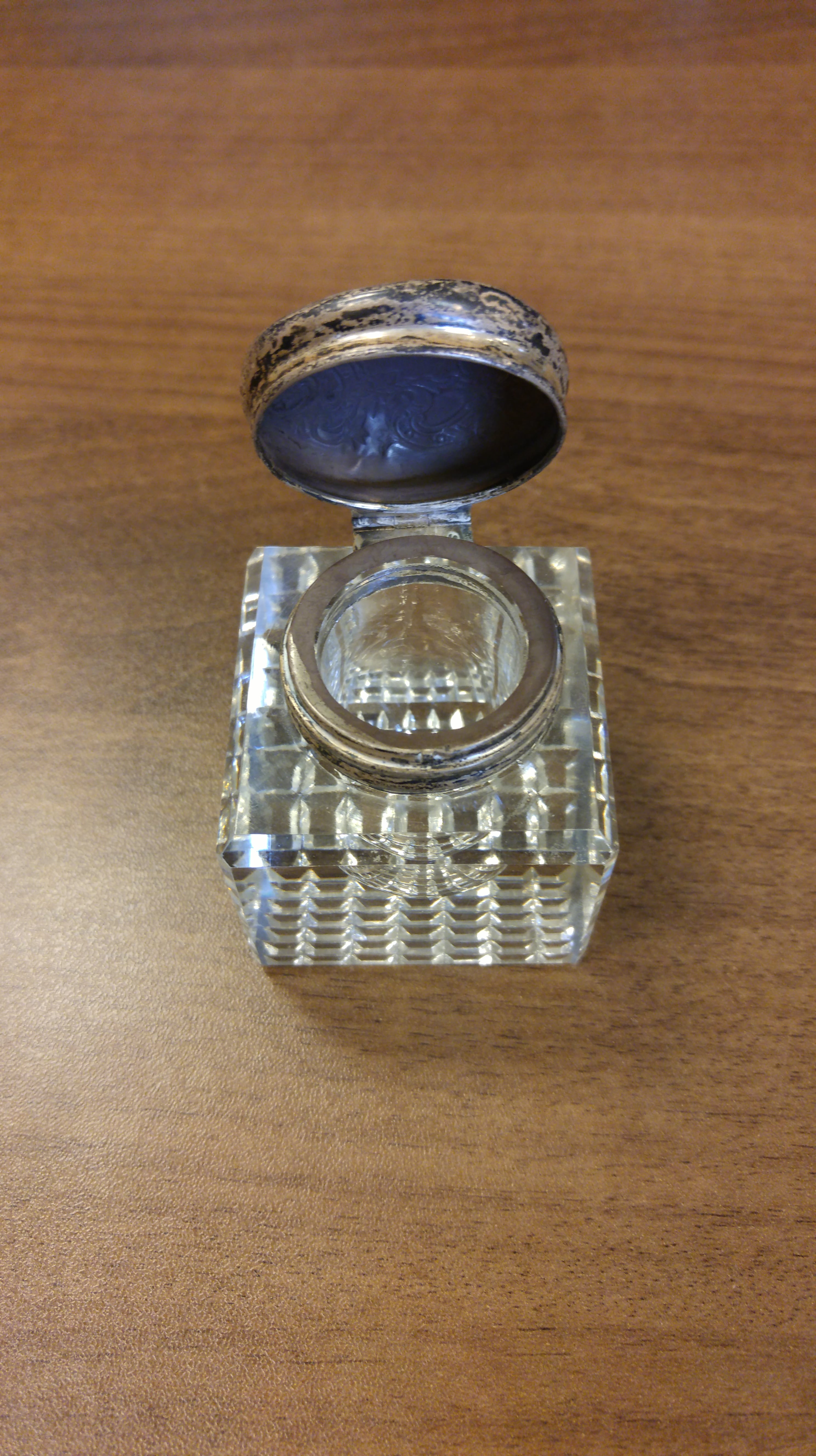 This inkwell is a square 2" deep and stands 2 1/2" tall. The crystal includes hand cut waffle pattern on the bottm. It features an alluminum lid with scrolling design.