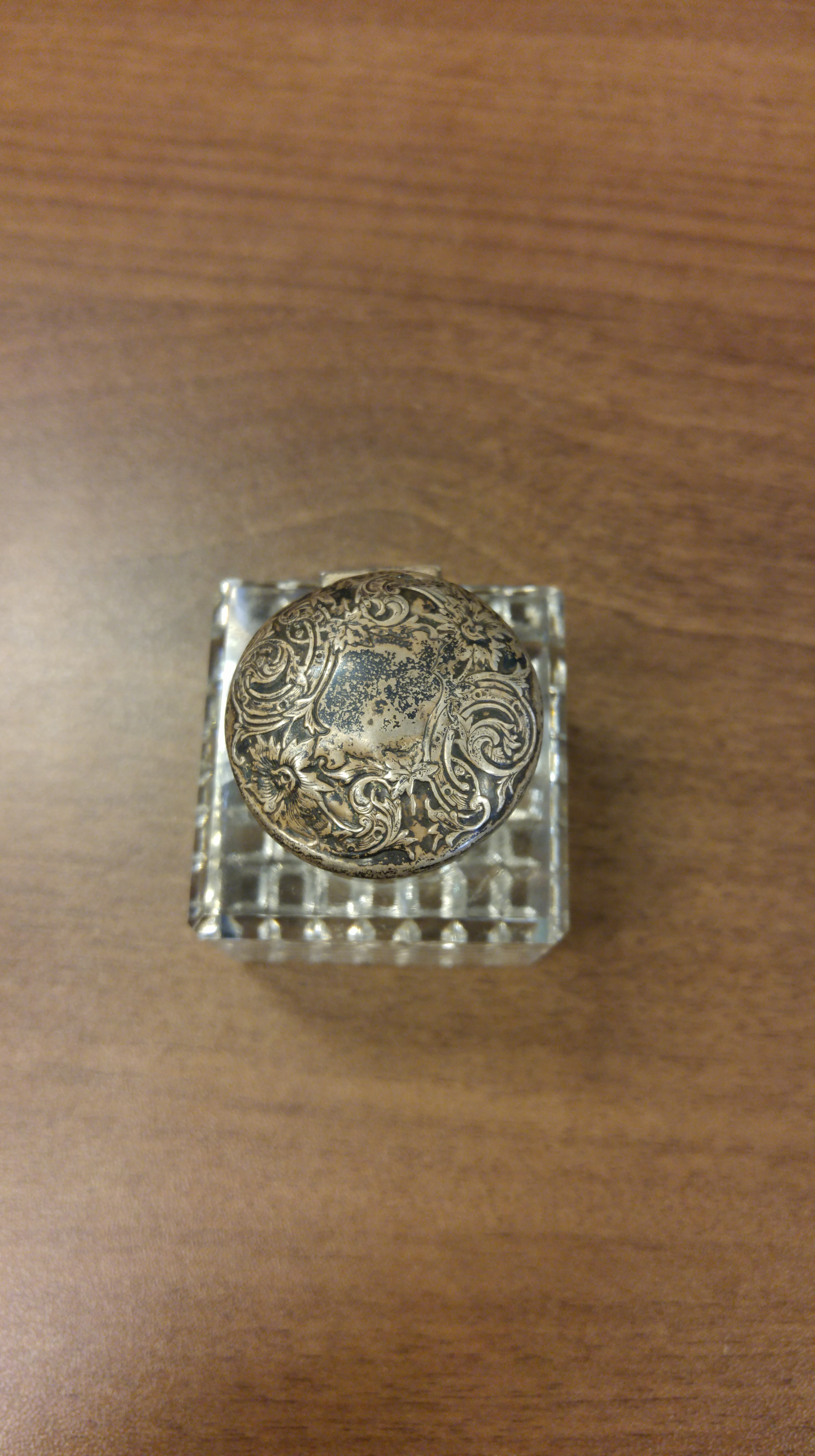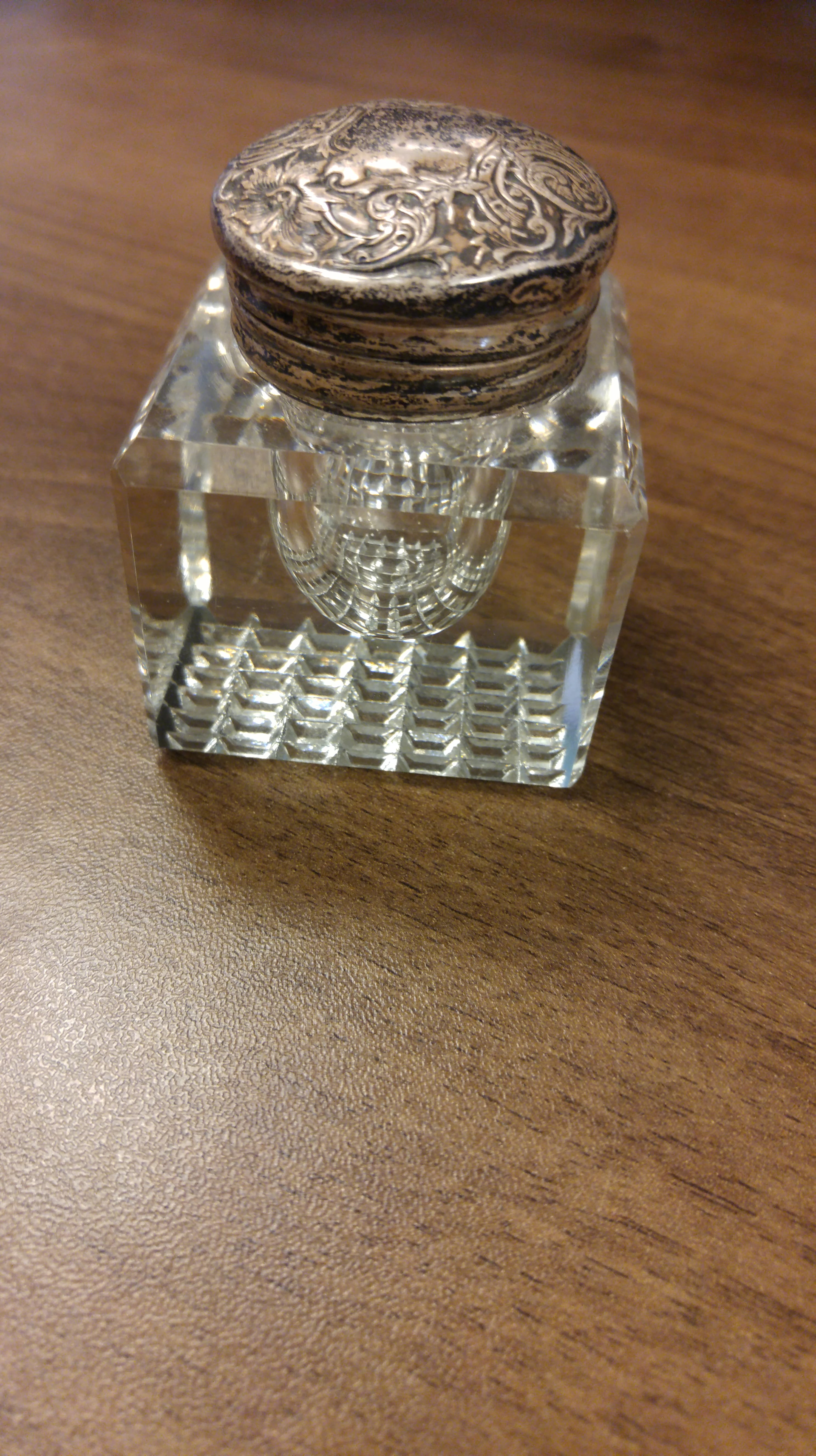 Crystal inkwell with hand carved waffle pattern on bottom. It has a tin lid with a scrolling pattern. It is 2" square and stands 2 1/2" tall.