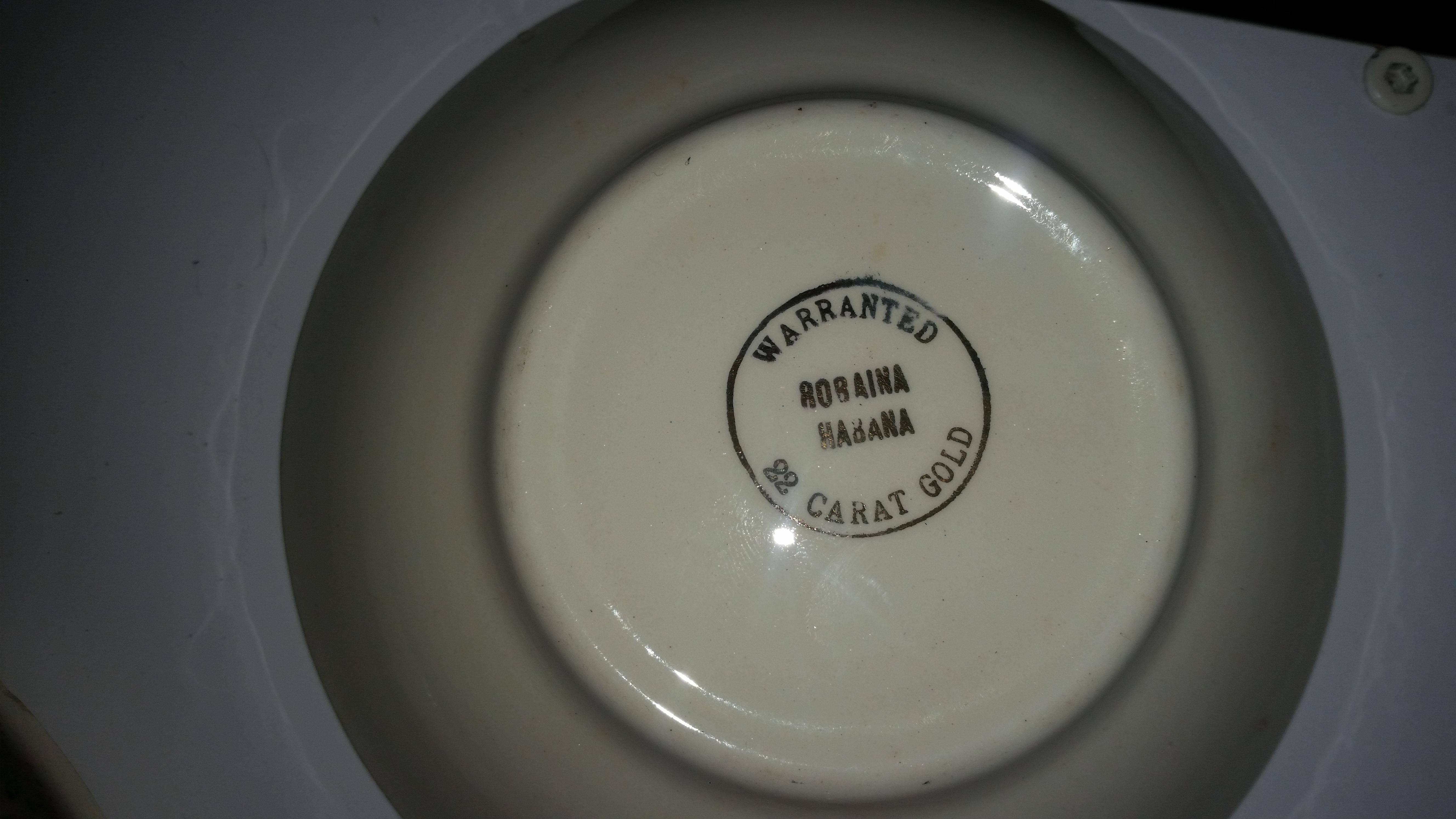 Each of these pieces look like they are painted or stamped with gold leaf designs. Signature on the back says Warranted 22 carat gold Robaina Habana.