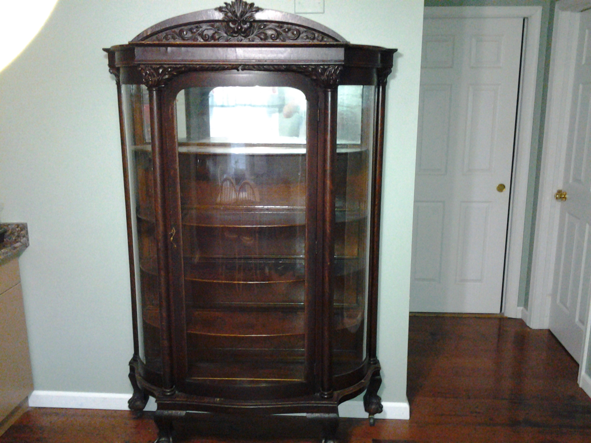 3 sided curved glass ,wheels under eagle claw feet dark stain need help with appraisel early1900?