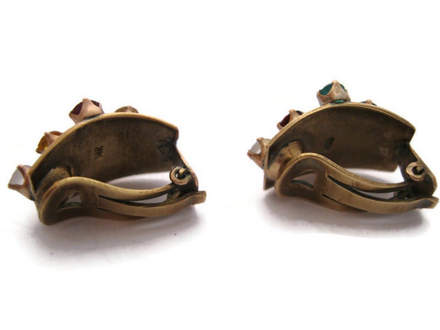 Researched to 1930s-40s? Custom made, only one like them online but these are different type of gemstones, ruby, sapphire, emerald, garnet, citrine, tiger;s eye, opal, clear topaz? One stone not sue of. No diamonds, already tested. Stamped 14K and tested positive for 14K. Need value if known for custom made jewelry from this era.