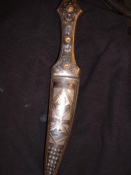 it looks like somebody has put alot of work into it. im pretty sure it is inlayed with gold and i was thinking from the picture on it it may be from the middle east. but i really dont have a clue but i am definitely interested in selling it.