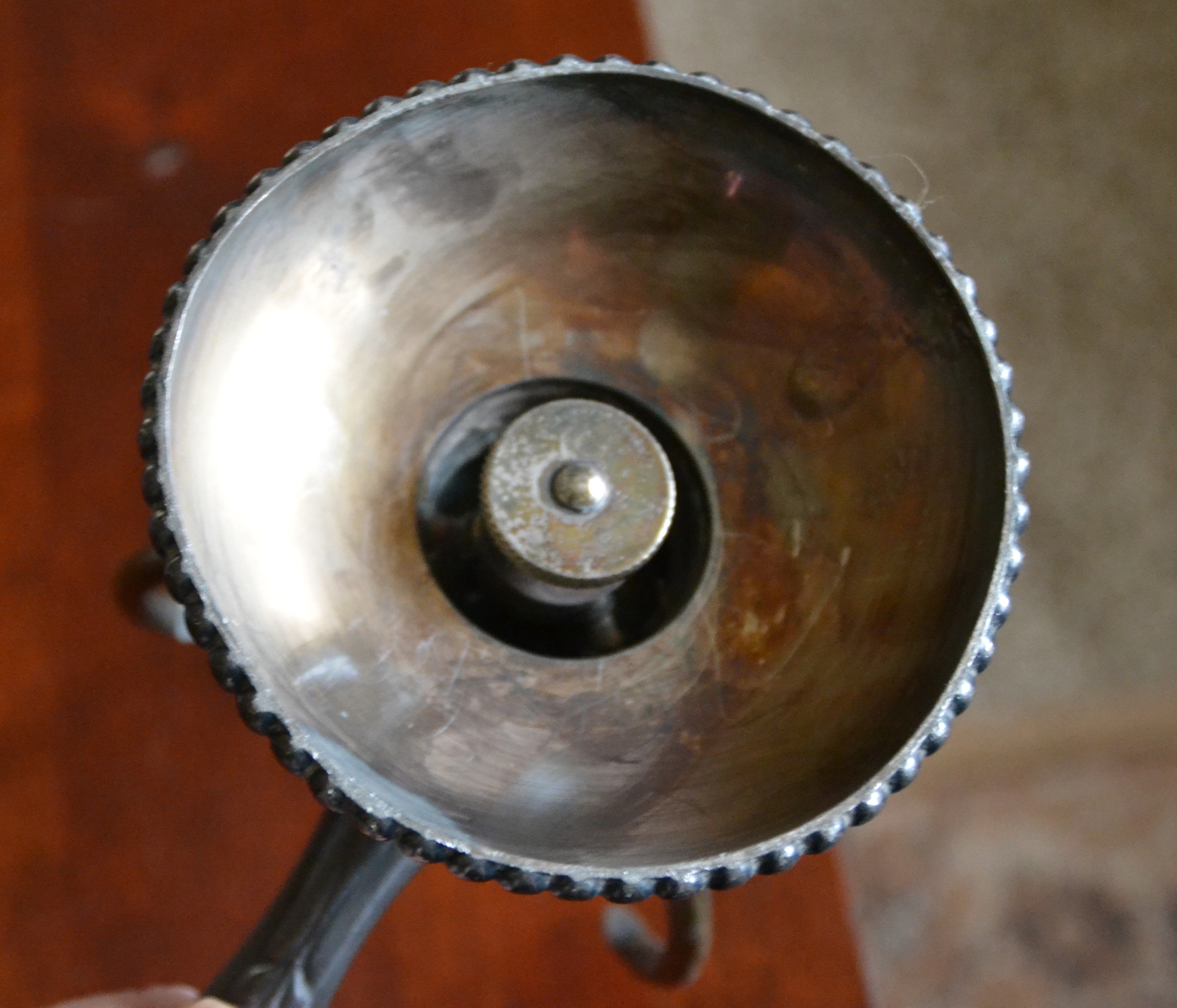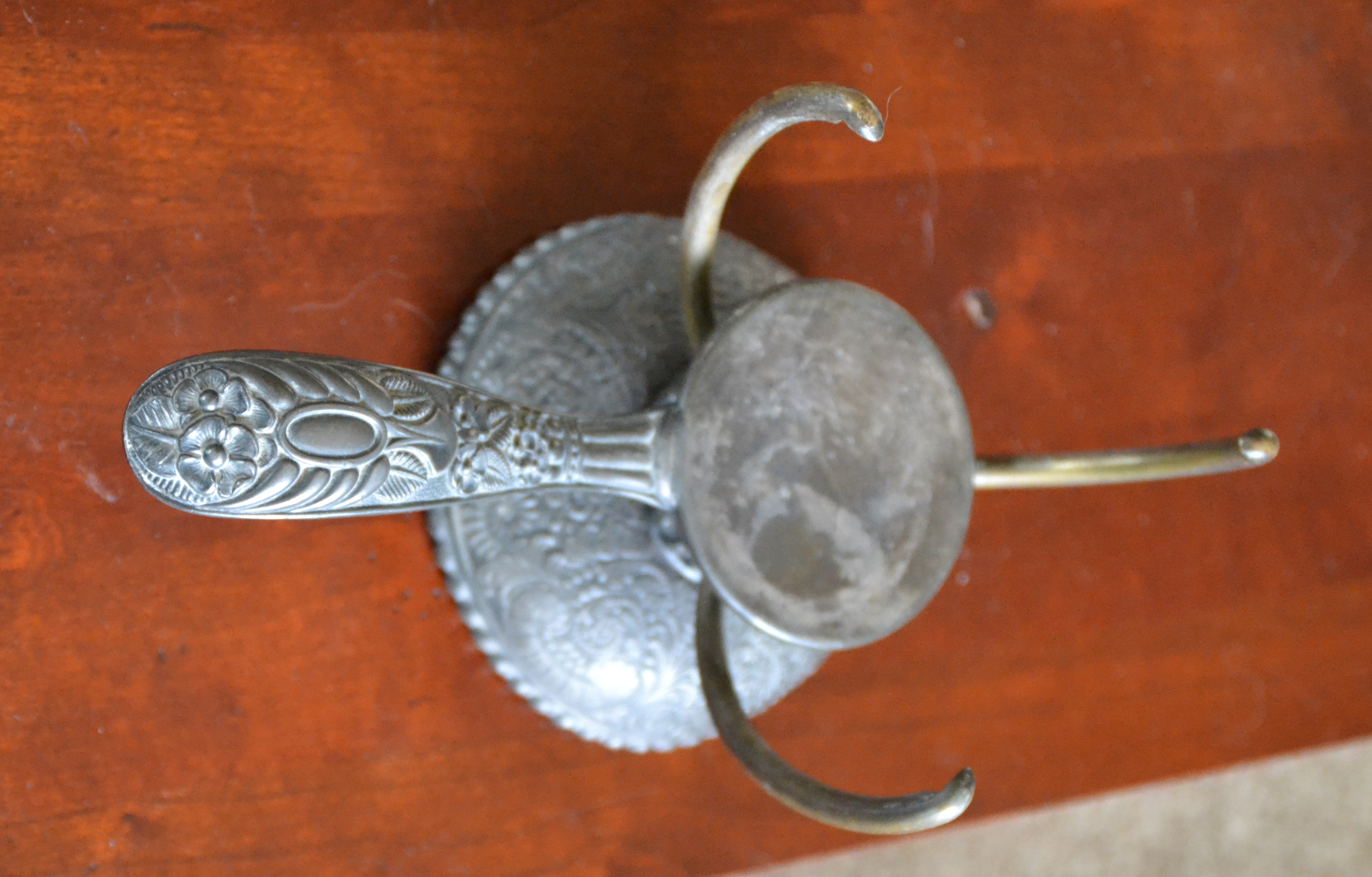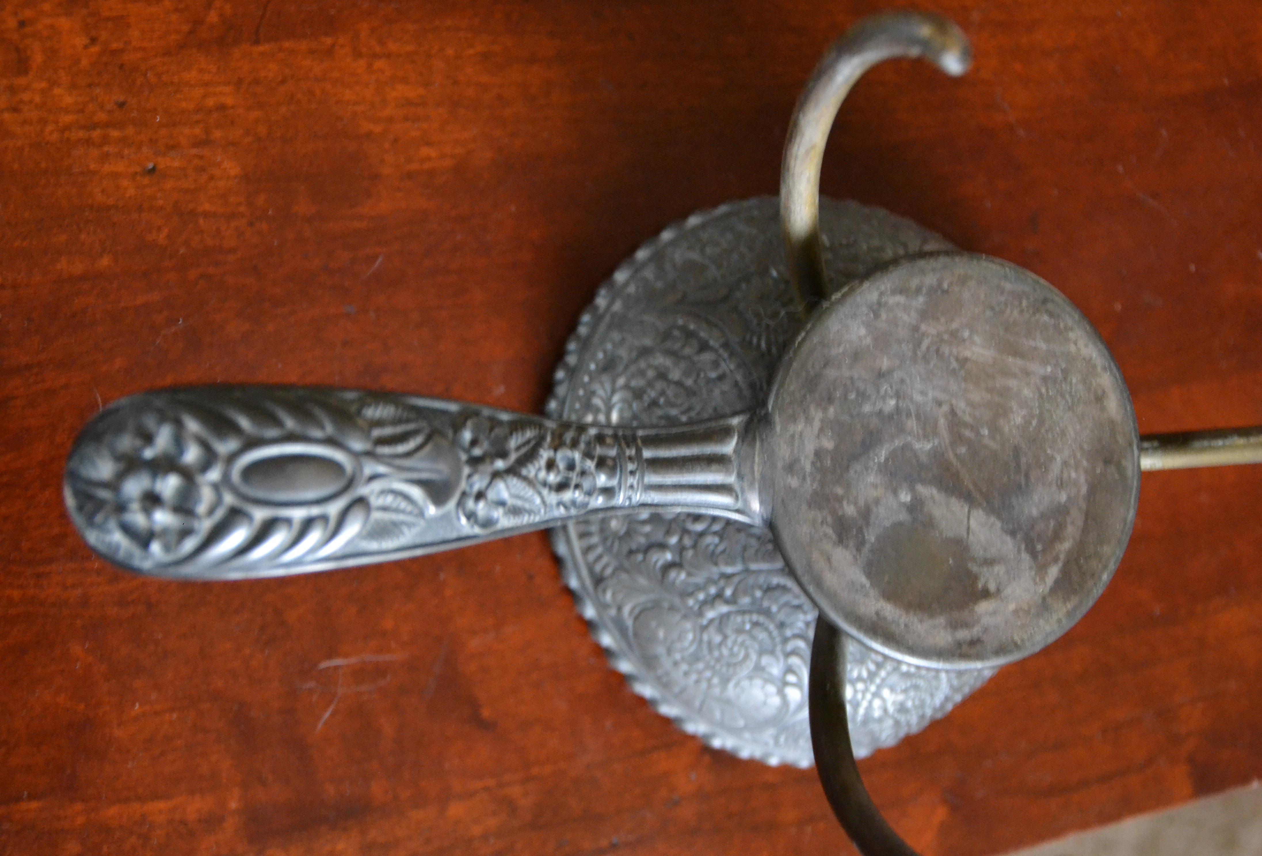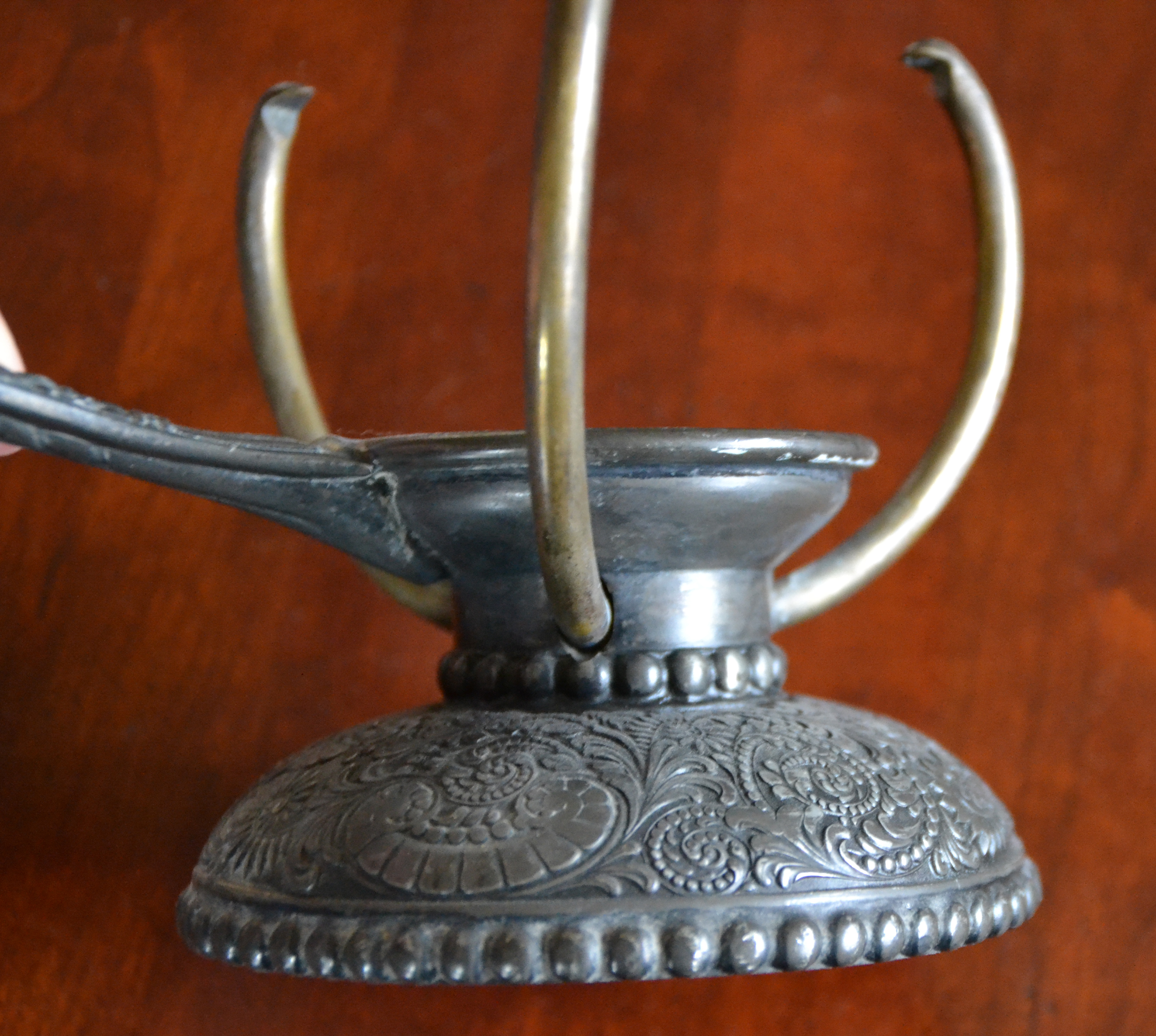 Hello and thank you for looking at my candle holder that I purchased in CT approximately 20 years ago. The button on the bottom adjusts the arms on the top of the holder. No hallmark. Very decorative. I don't know what type of metal it is. I would appreciate any information and an approximate appraisal price for this.