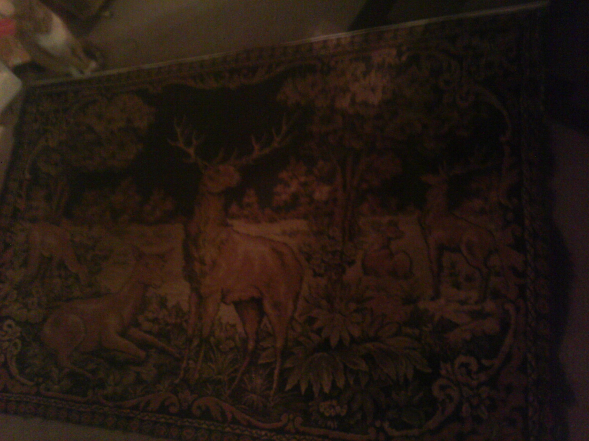 this is a tapestry that I got from my mom when she passed away. I do remember her telling me she got it while in germany when my biological father was stationed there. I believe she said it was from a castle but hard to tell. The fringework around the edges is damaged a little but the tapestry itself is in pretty good shape. Just looking to find out how much it could be worth or any history on it at all. thanks for any and all help.