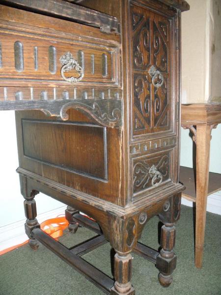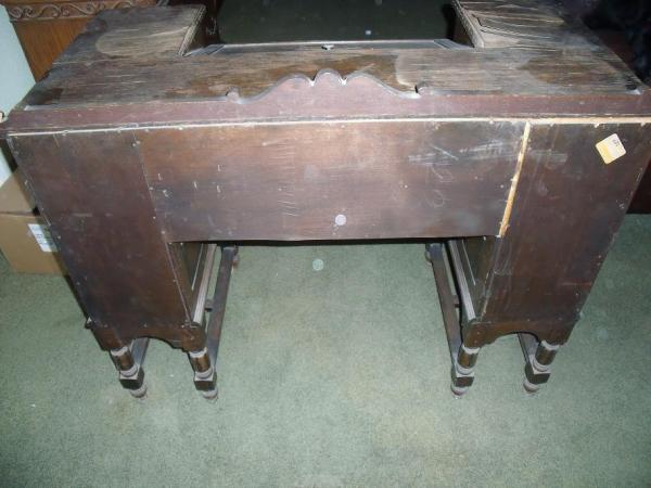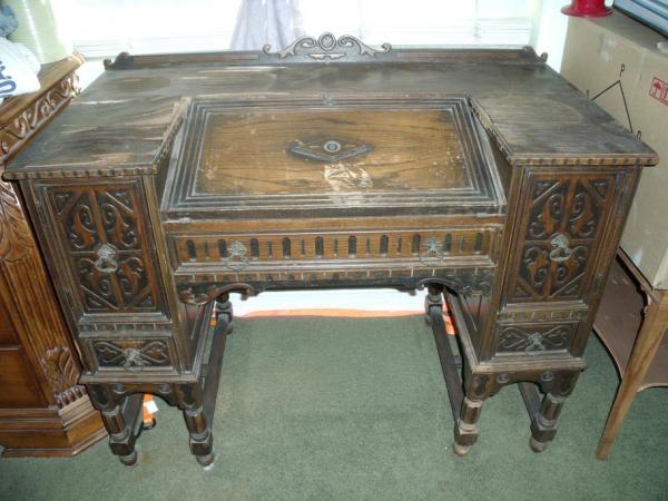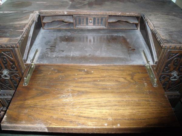 Description Desk I would believe to be in poor condition. It had been sitting in a garage that leaked and caused water damage to the top, which made the wood buckle. As far as the rest of the desk it seems to be in fair condtion. I dont not know much about it and have searched on line and have not found anything to compare. I went to a yard sale and this desk was sitting in the garage. It was not out for sale but I was looking at in the garage. An older lady came to me and told me a brief story (mentioned above) and said if I liked it I could have it.