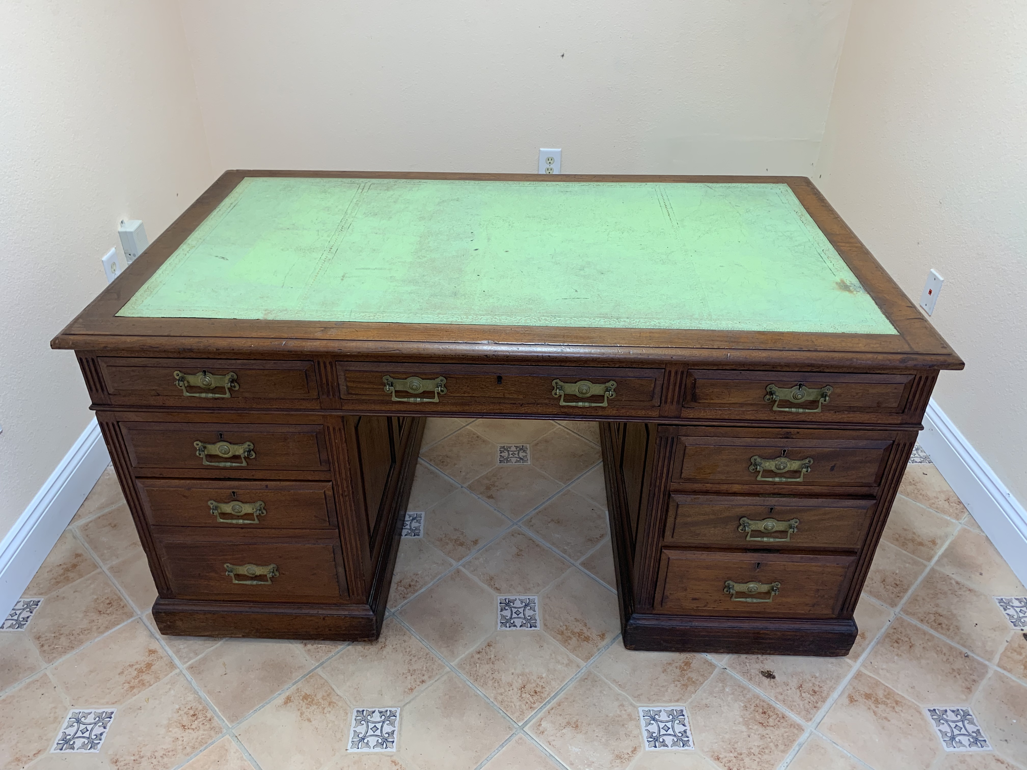 Solid wood desk with green leather top. Top is removable from 2 pedestals.