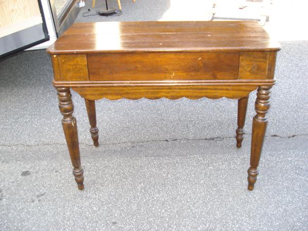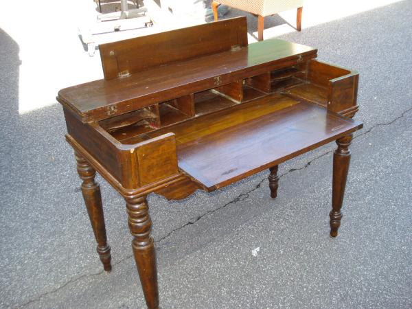 This is what's called a " Spinet Desk", after it's resemblance to Spinet Pianos made during the 1840's. Most desks like this one date from the 1920's onward and sell in the $300.00- $500.00 range.