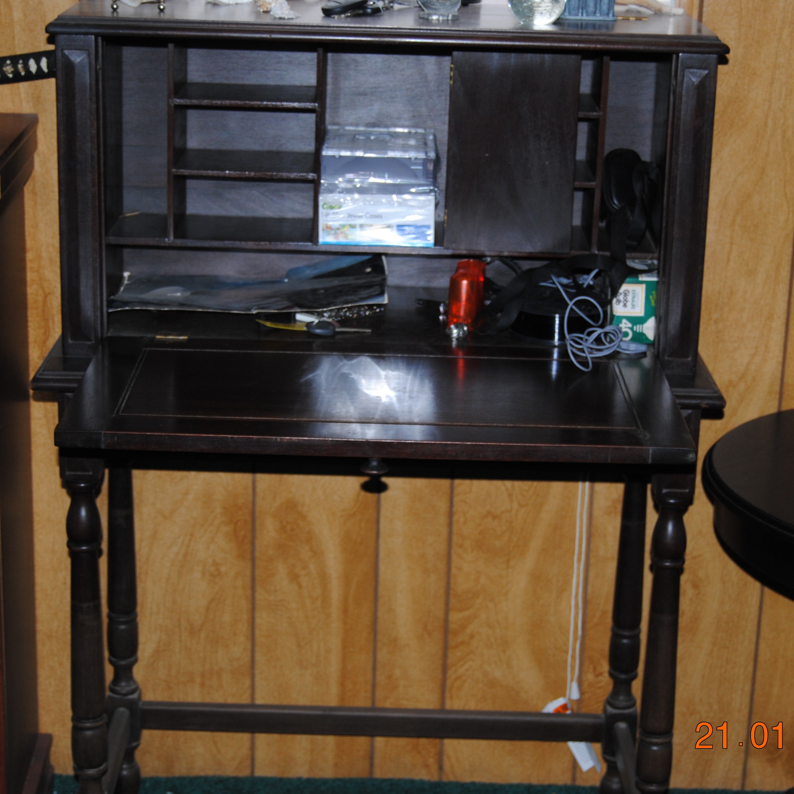 antique secretary, top portion flips up, door drops down for secretary. age unknown. would like help identifying item.