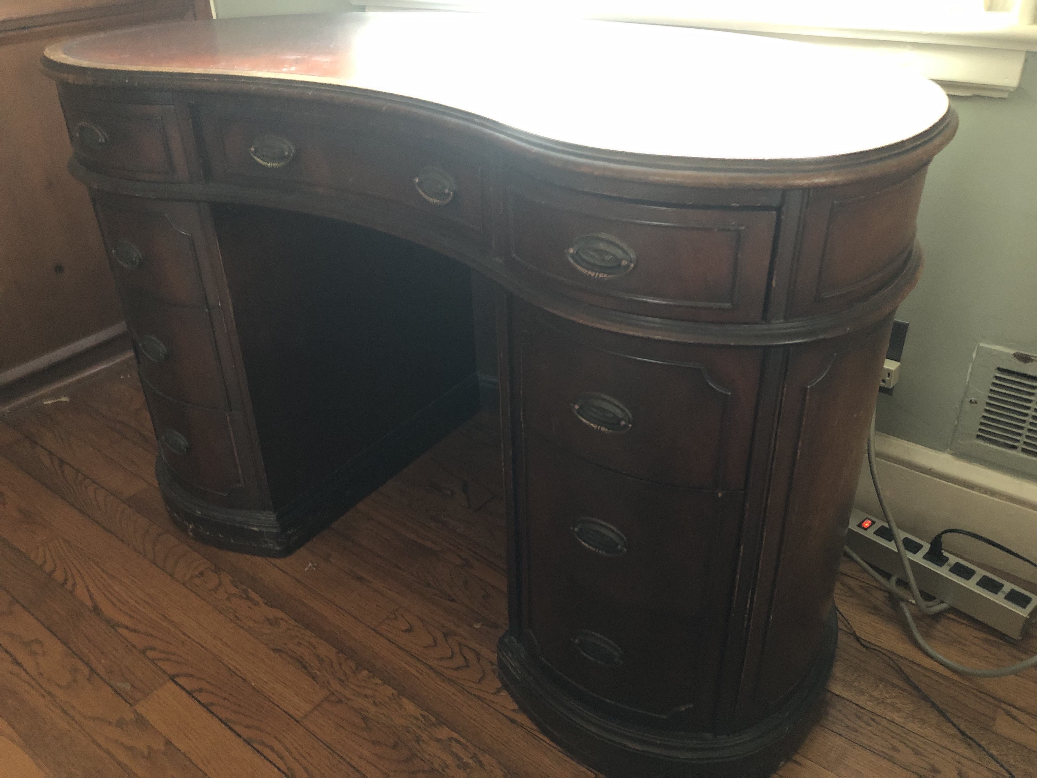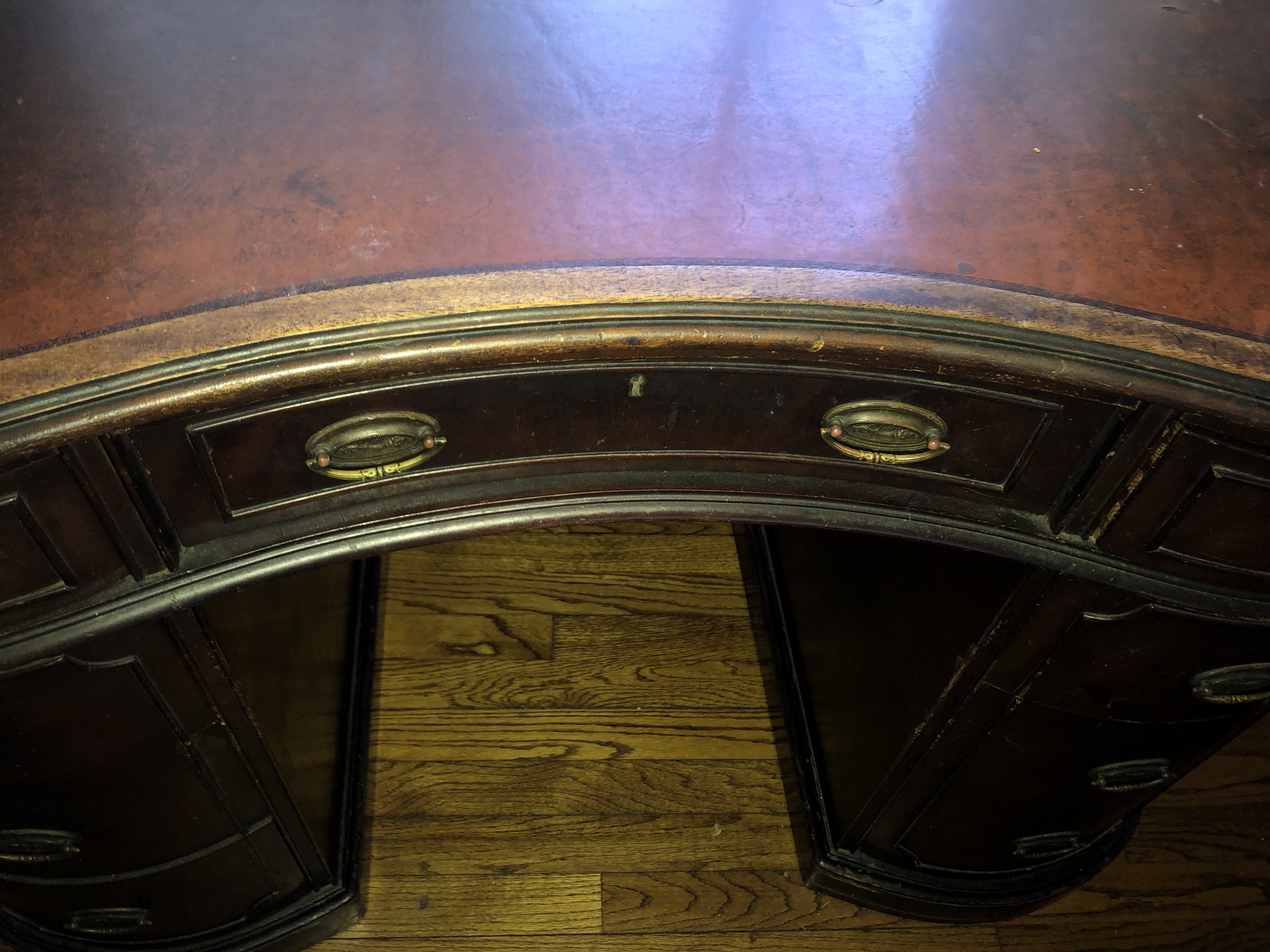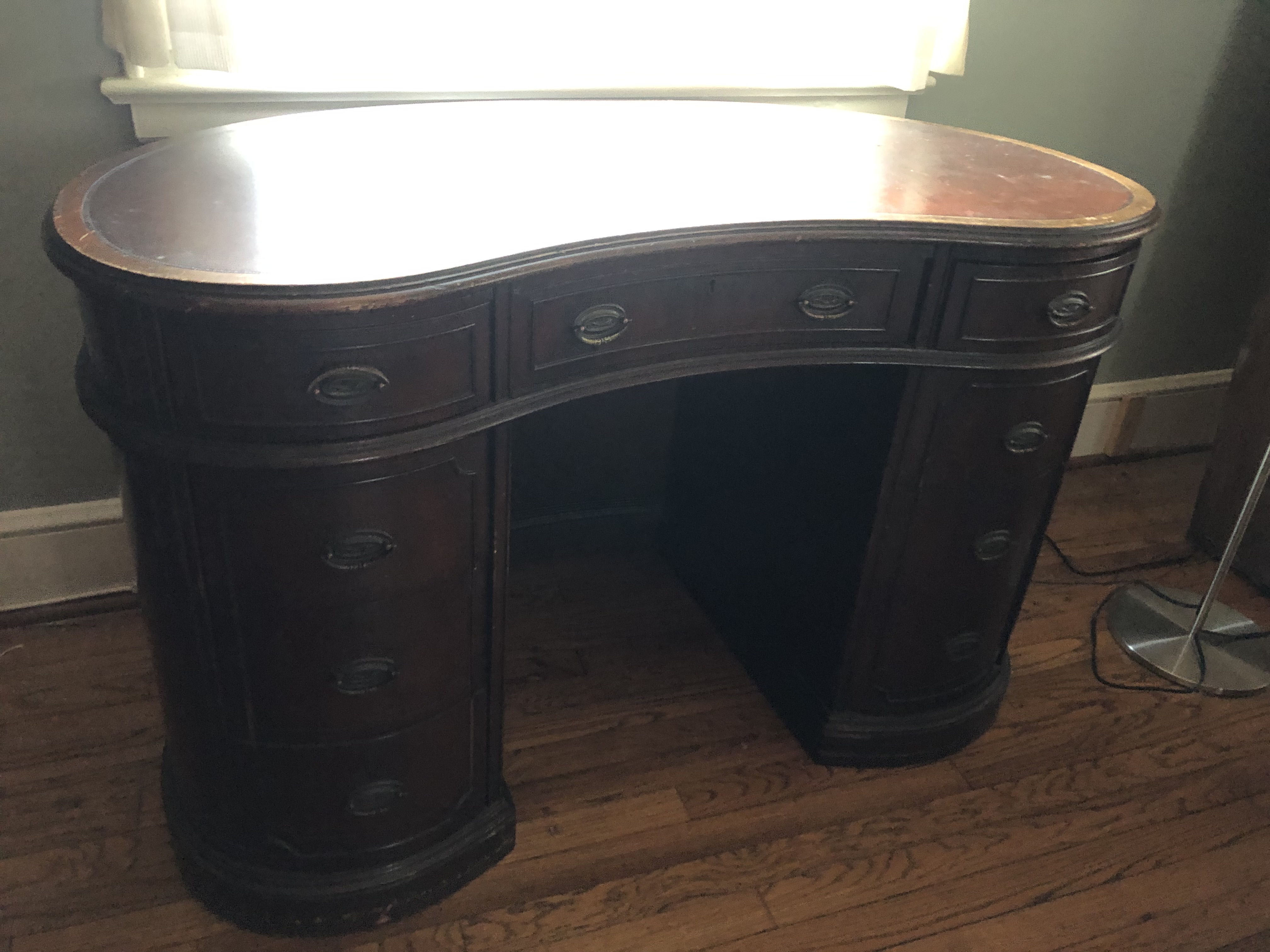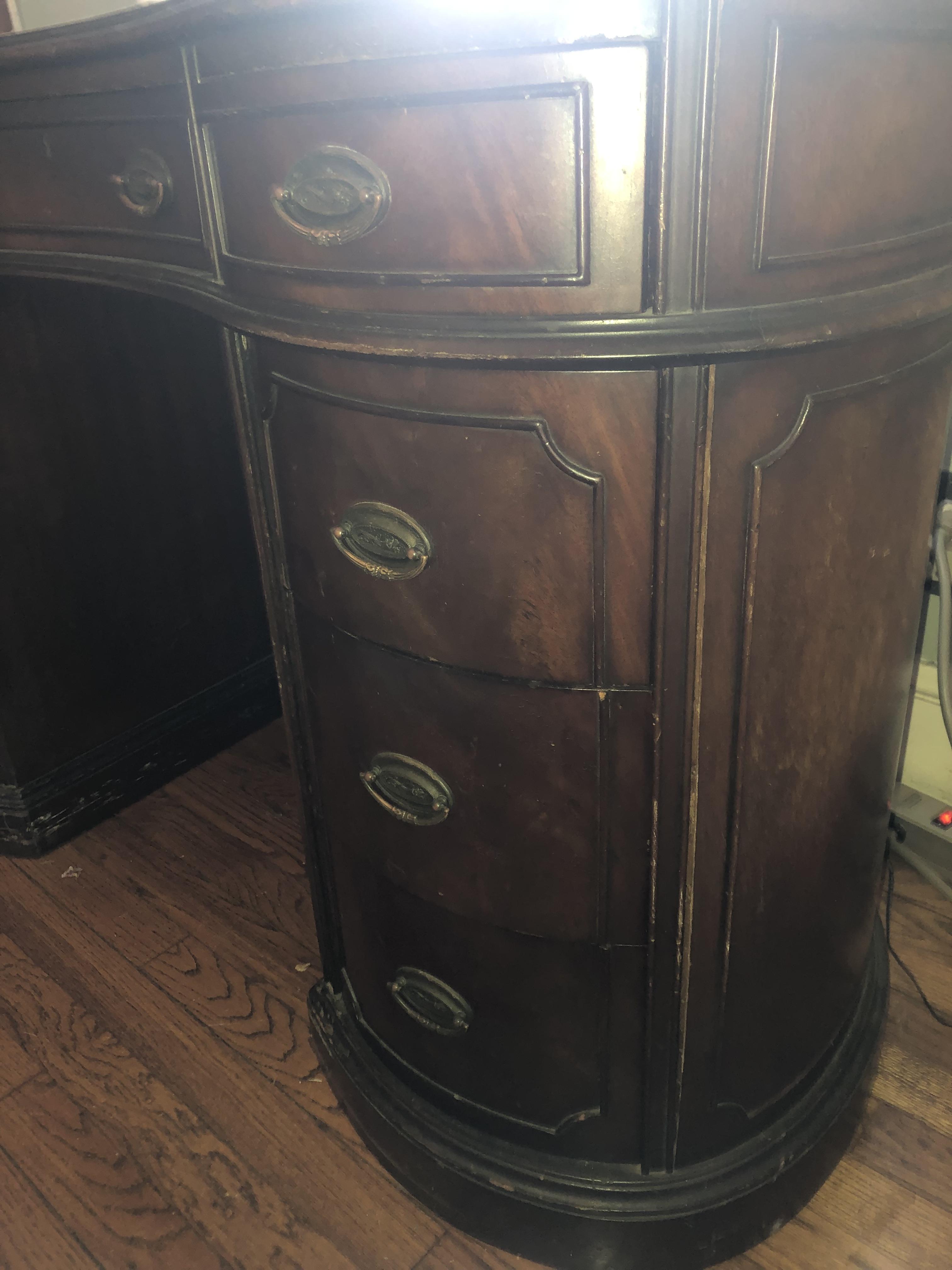 Solid wood desk with curved top and 9 drawers. Original finish and hardware. Leather desktop. some wear on top. 31"H x 47"W x 25"D.