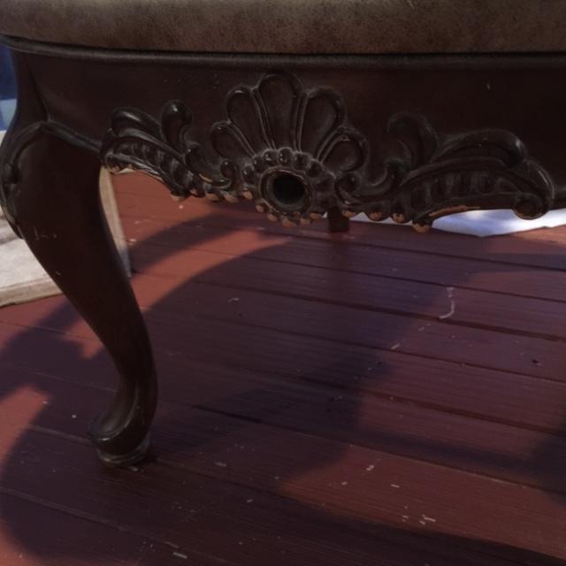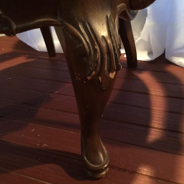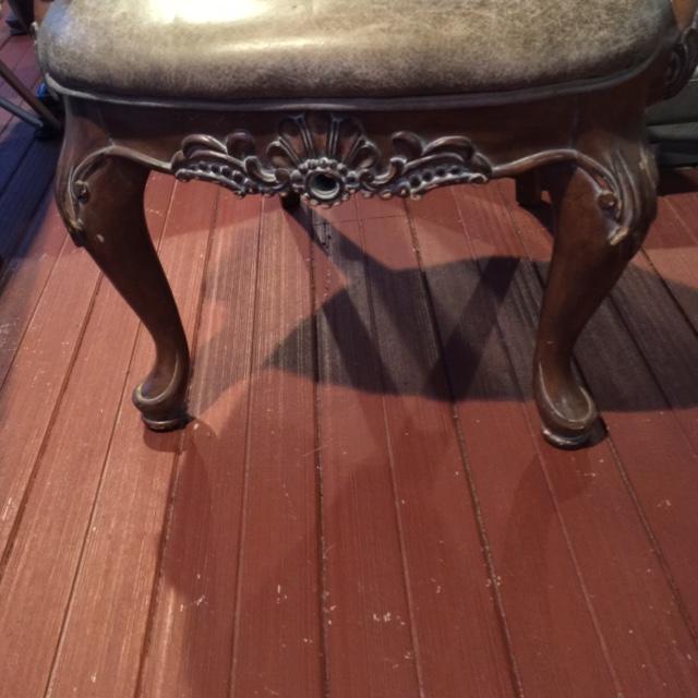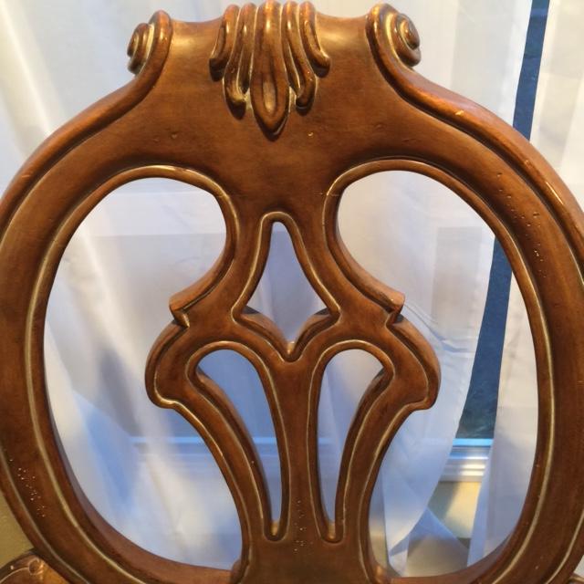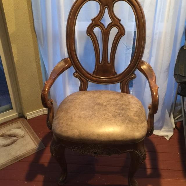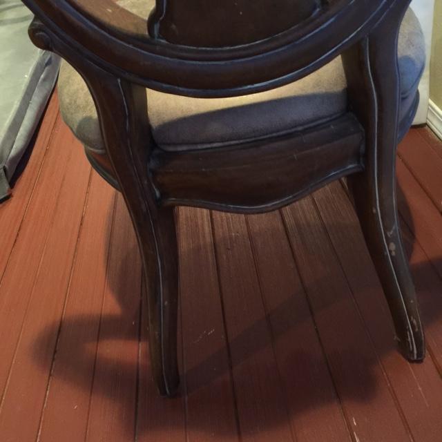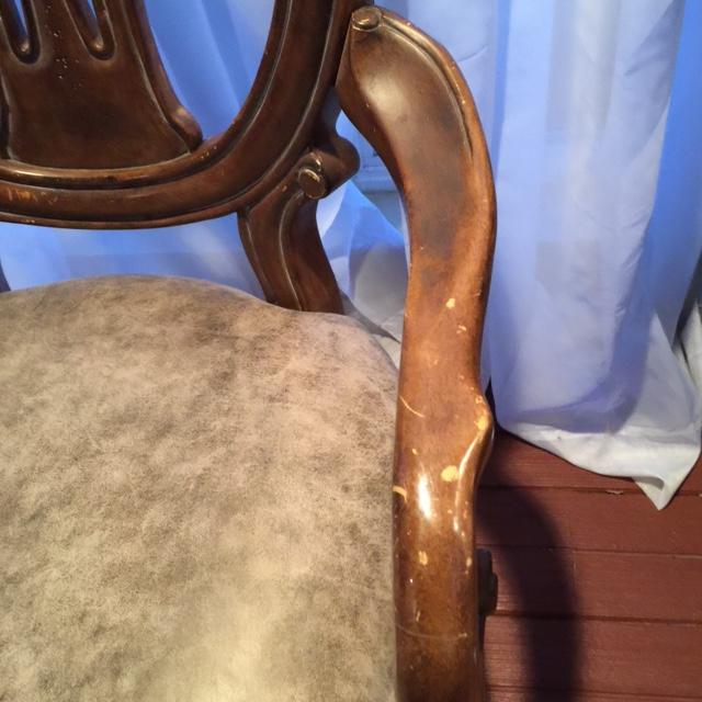 Two of the chairs have arm rest, the remaining two are without arm rest. The chairs are sturdy but not to heavy. I'm not sure the type wood because the chairs look to be varnished. The seat area looks like they have been upholstered.They look to have Queen Anne legs and feet. I hope someone will have info on these chairs. Thank you.