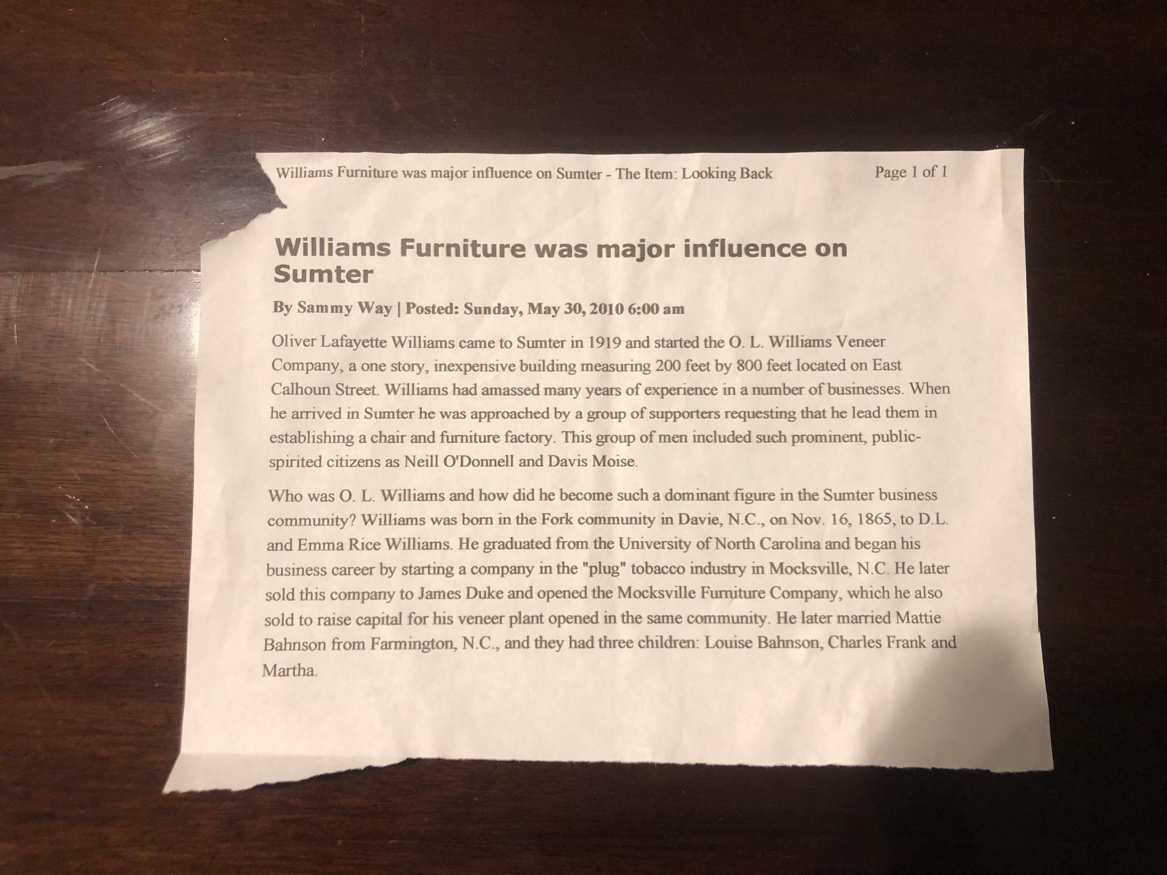 i have a beautiful dining hutch from the 1900s in good shape, from what I know it’s from Williams furniture in South Carolina and I have attached the pictured documentation that came with it as well. Please let me know what you think.