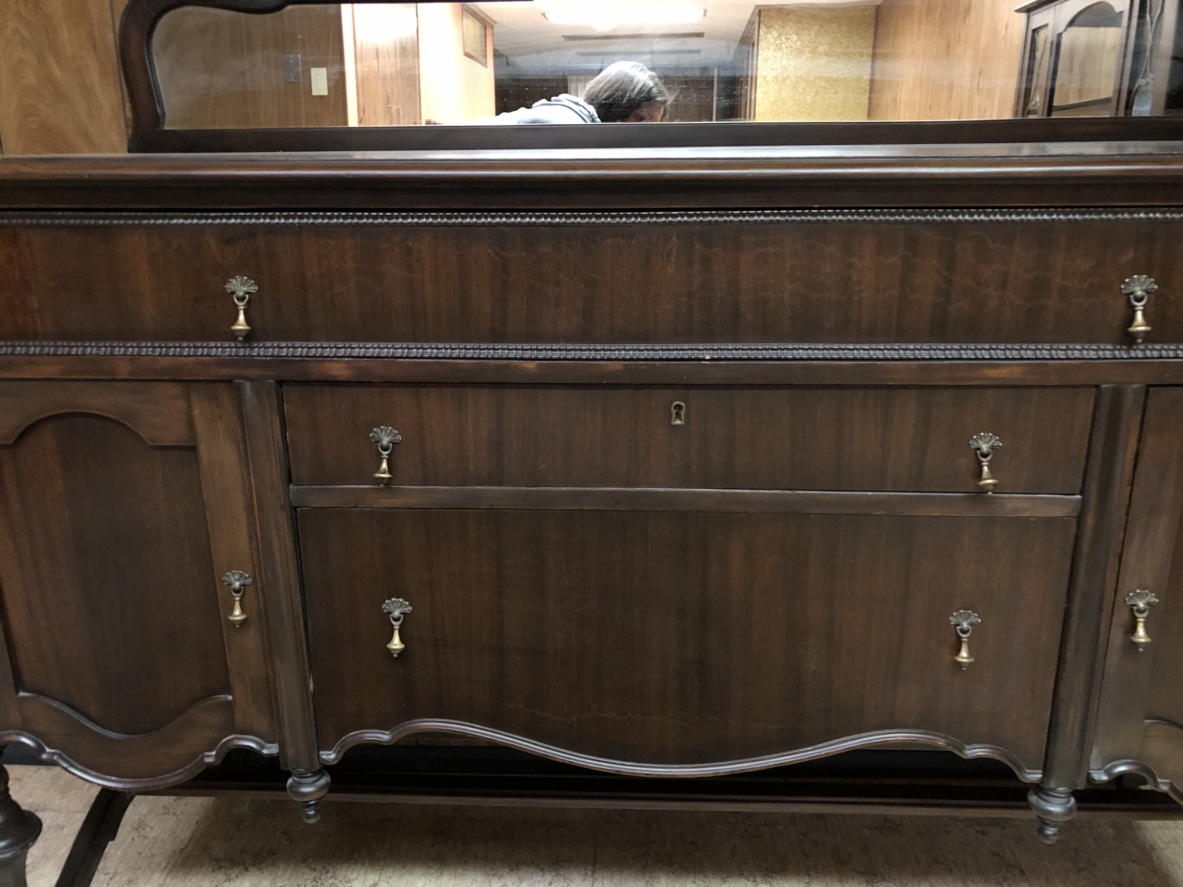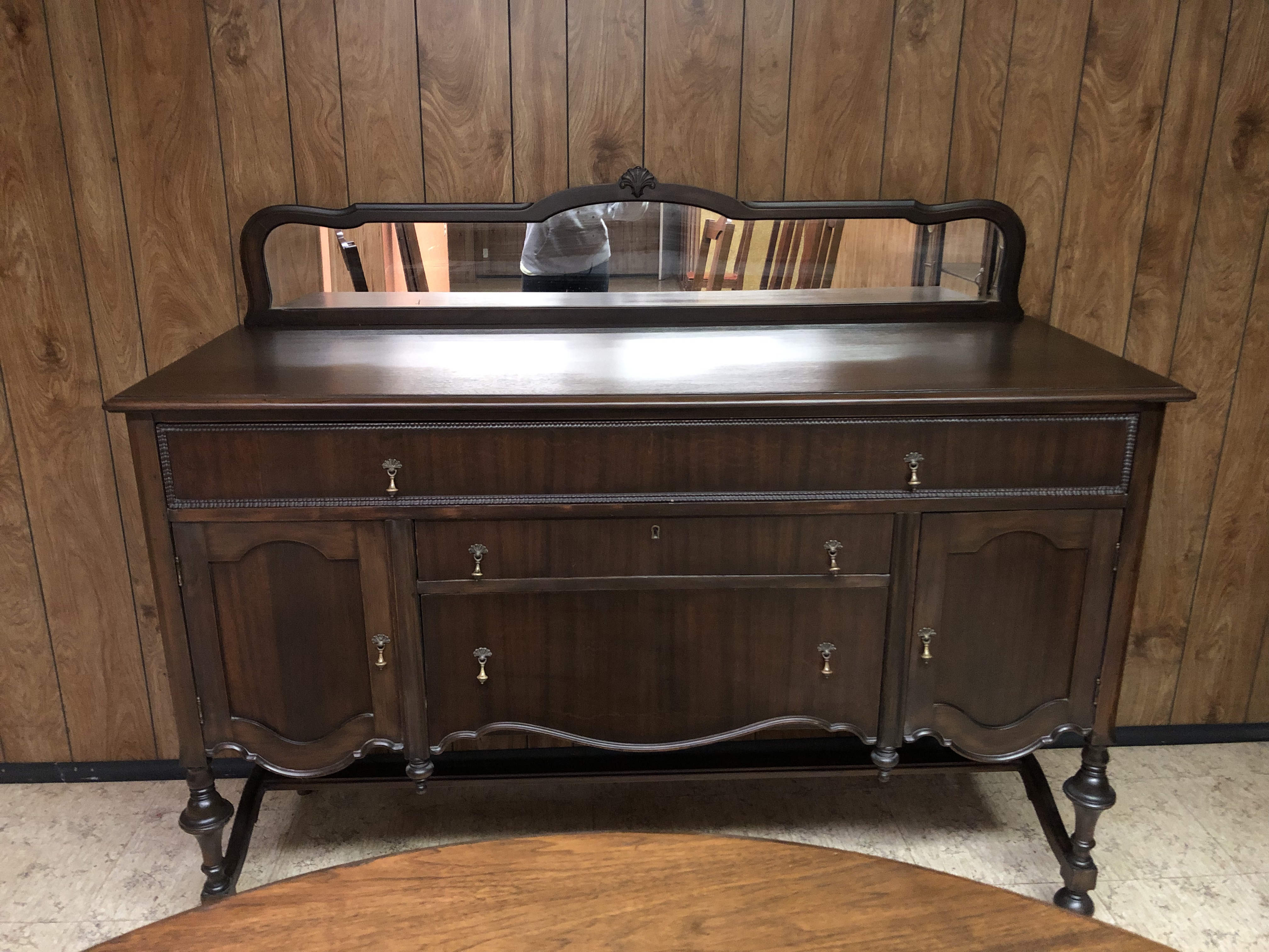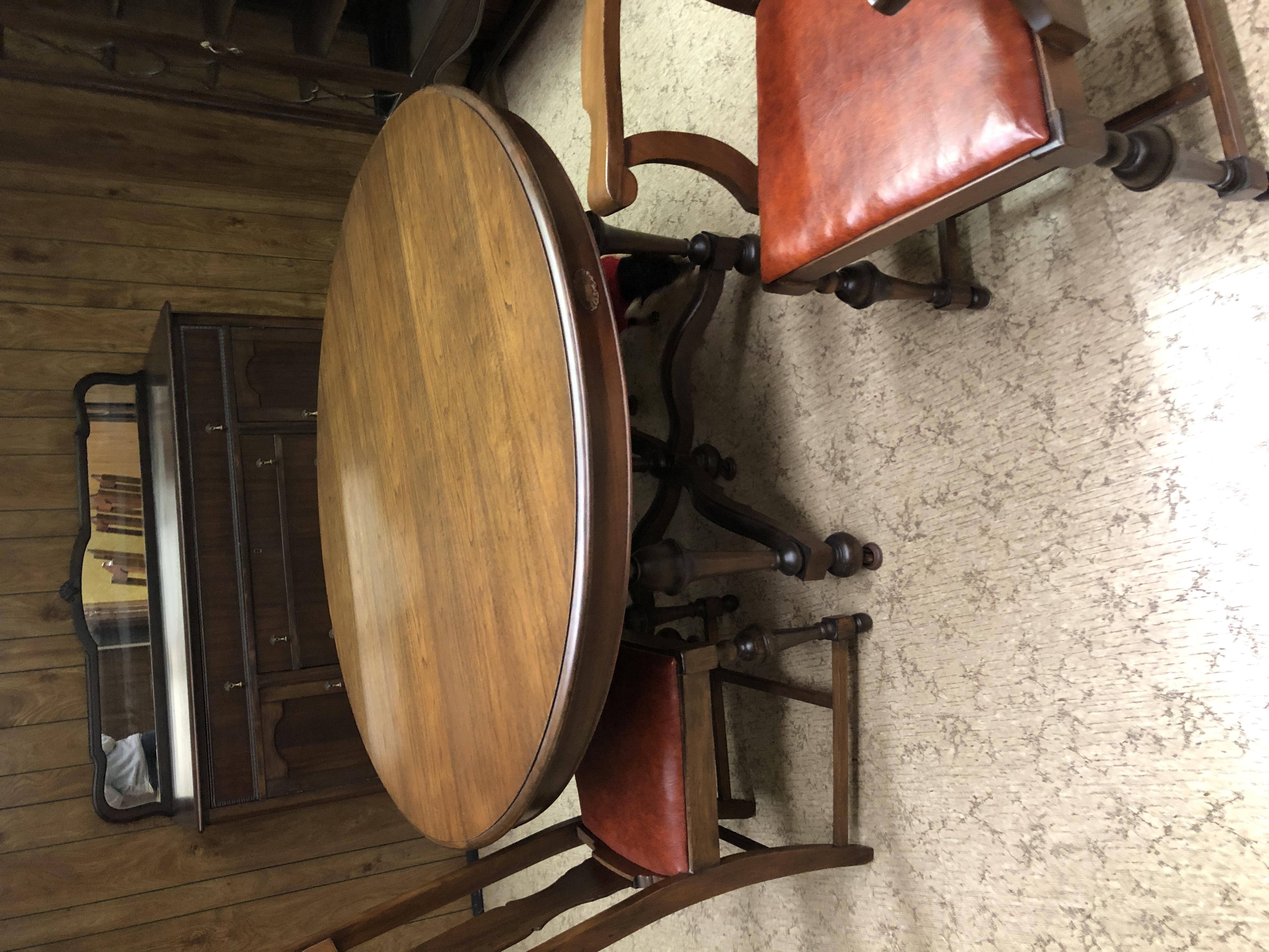 Antique dining room set including a buffet with a mirror and lock, a chirp cabinet with glass sides and a dining room table with 3 leafs and 6 chairs ( two with arms). The set is from Roesch furniture from St. Louis Mo from the early 1900’s.