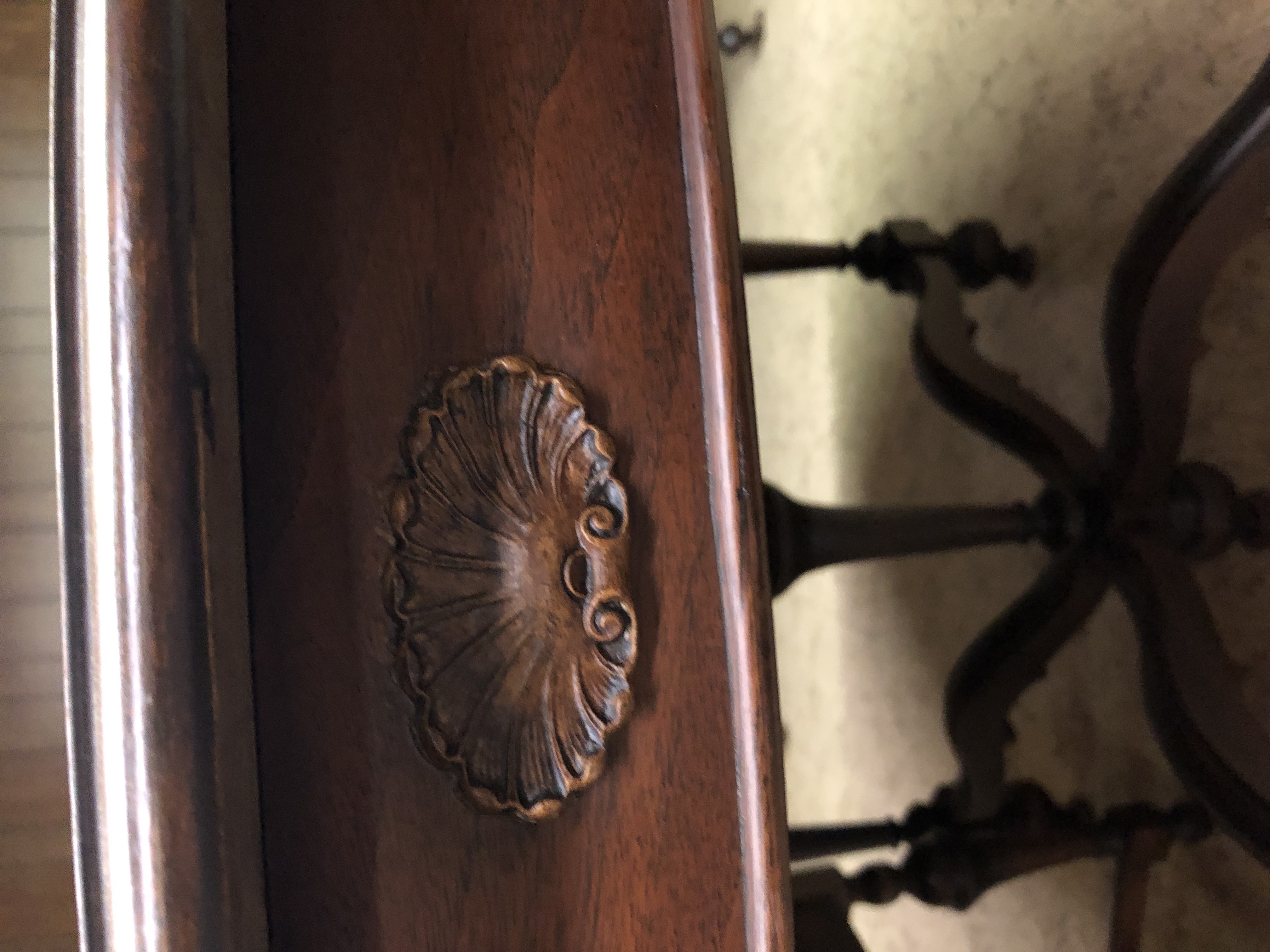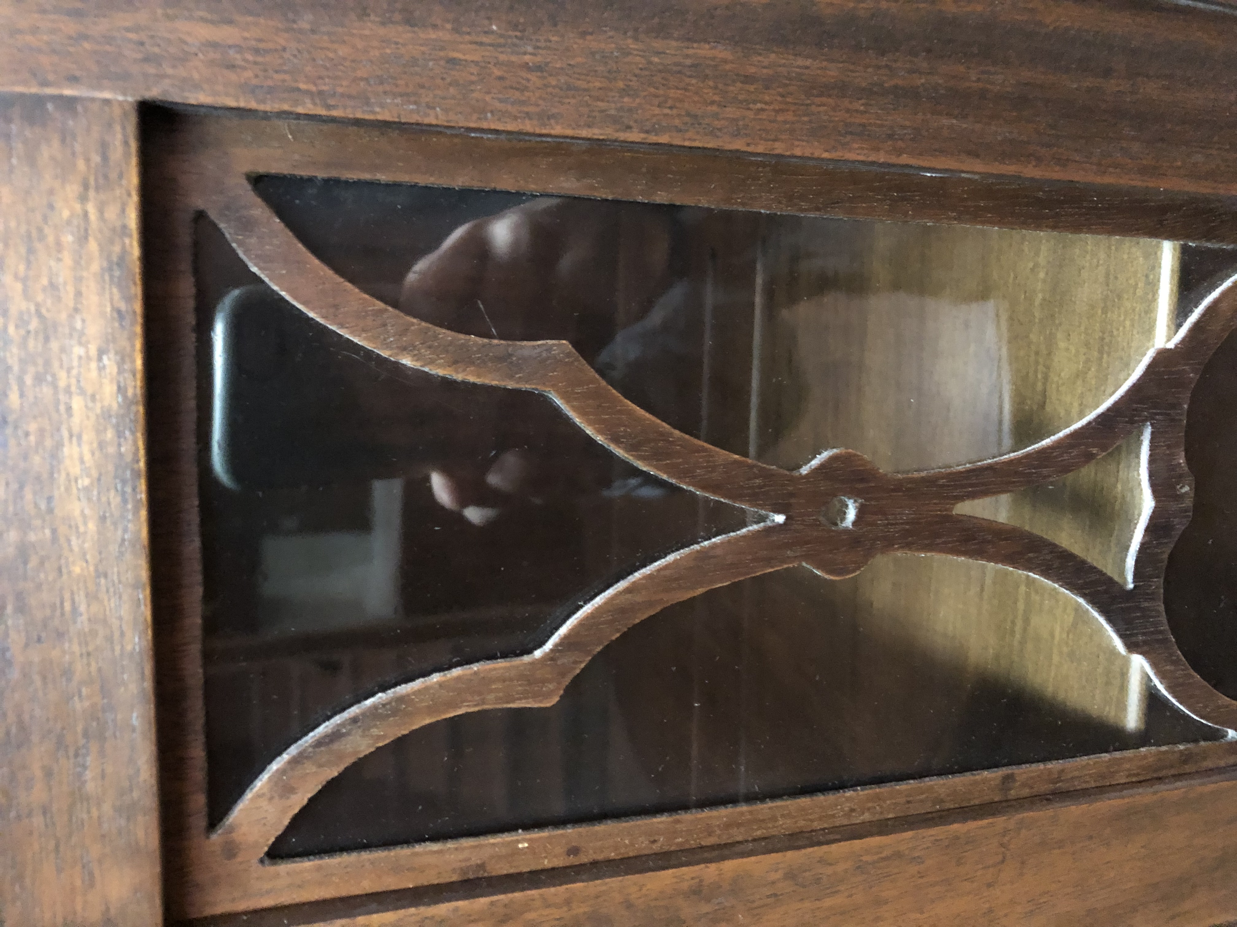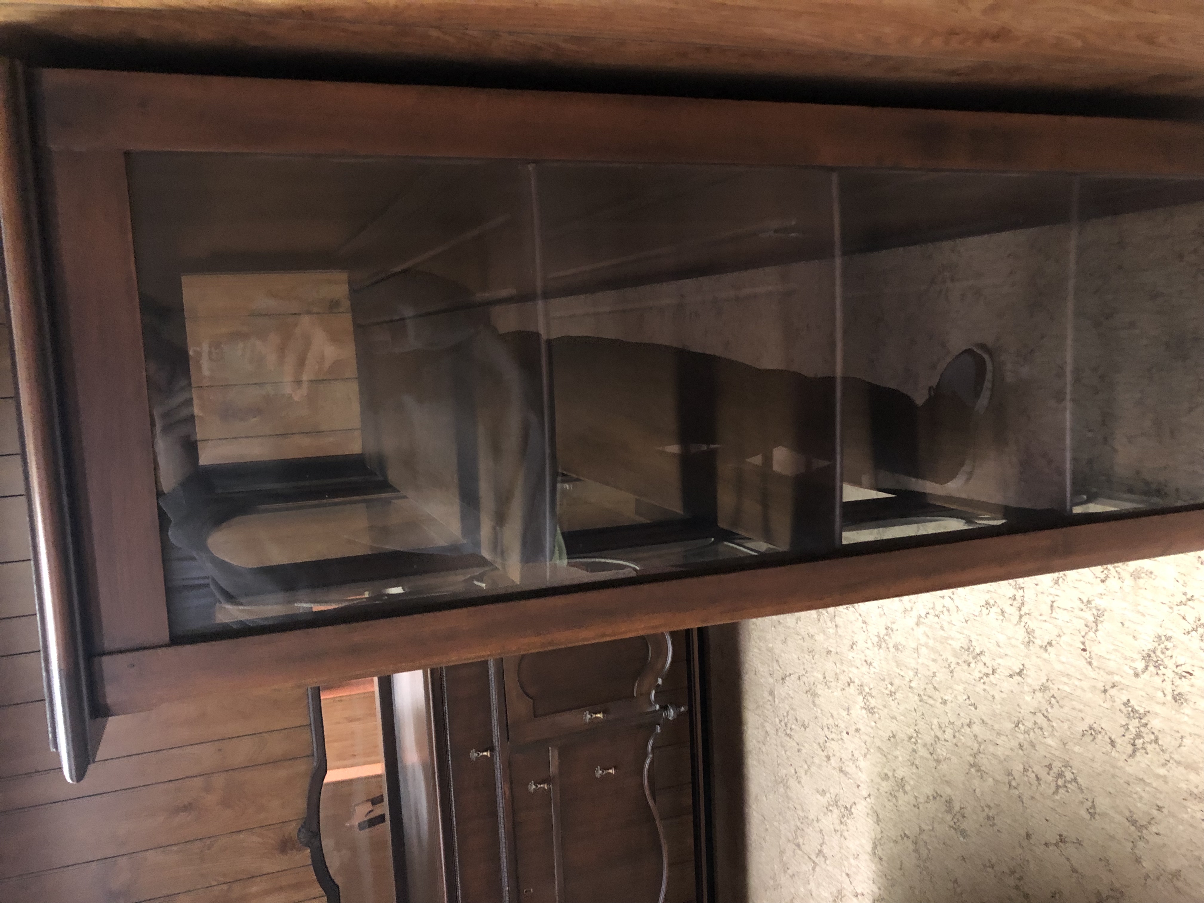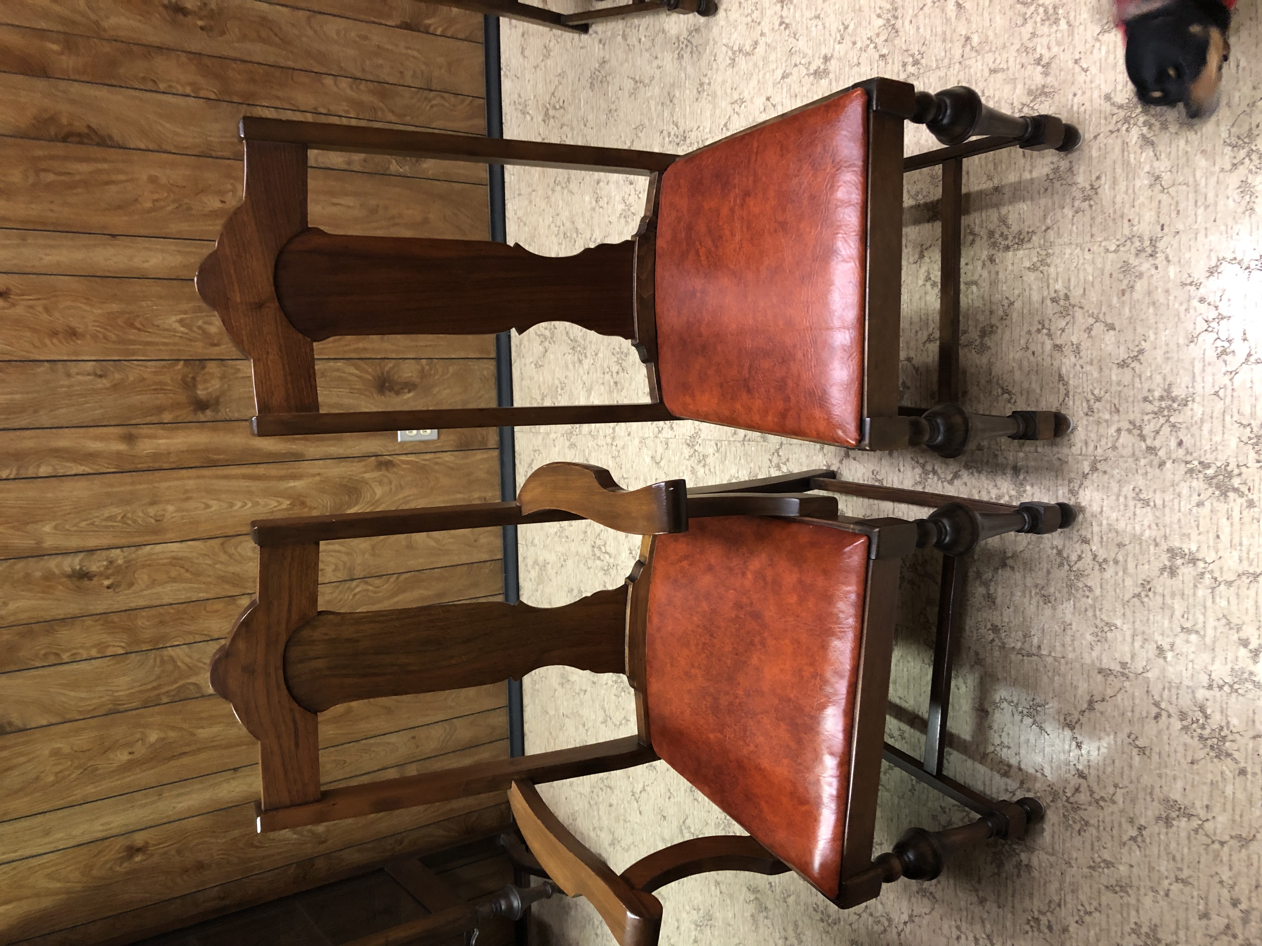 Antique dining room set including a buffet with a mirror and lock, a chirp cabinet with glass sides and a dining room table with 3 leafs and 6 chairs ( two with arms). The set is from Roesch furniture from St. Louis Mo from the early 1900’s.