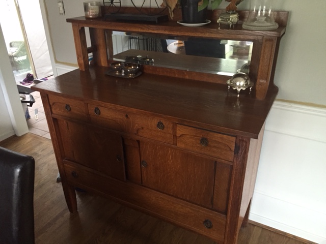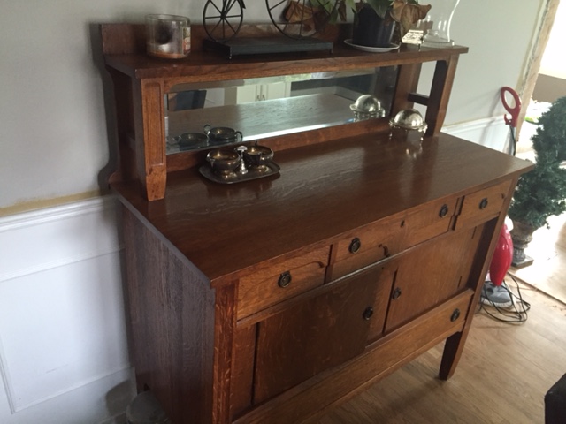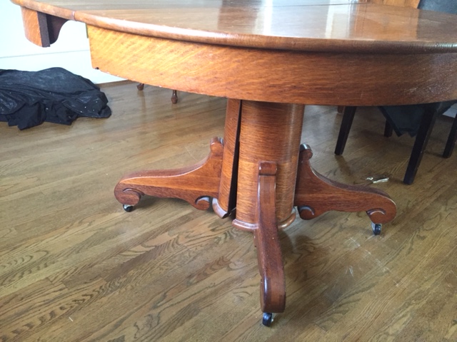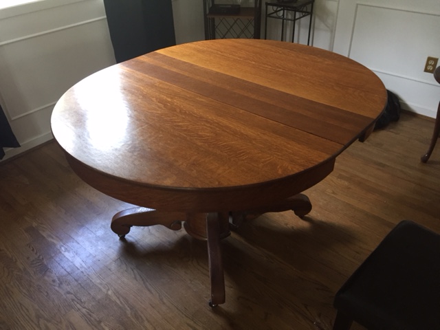 Good Day, I have an oak antique table, chairs and side board set. I'm not sure of the age or manufacturing details. The table is a split pedestal with 4 leaves and I have the original wood casters. There are 6 chairs including the head table chair all in immaculate condition. The side board has1 large drawer on the bottom and 3 drawers on the top with double cupboard doors in the center. The center drawer has a sliding cutlery shelf. The top has a beveled glass mirror running the length. All items have been refinished in their lifetime and are currently in excellent condition. I believe the set to be over 100 years old but am not 100% sure of the era or origin. I am thinking of parting with it but am not sure of its value.