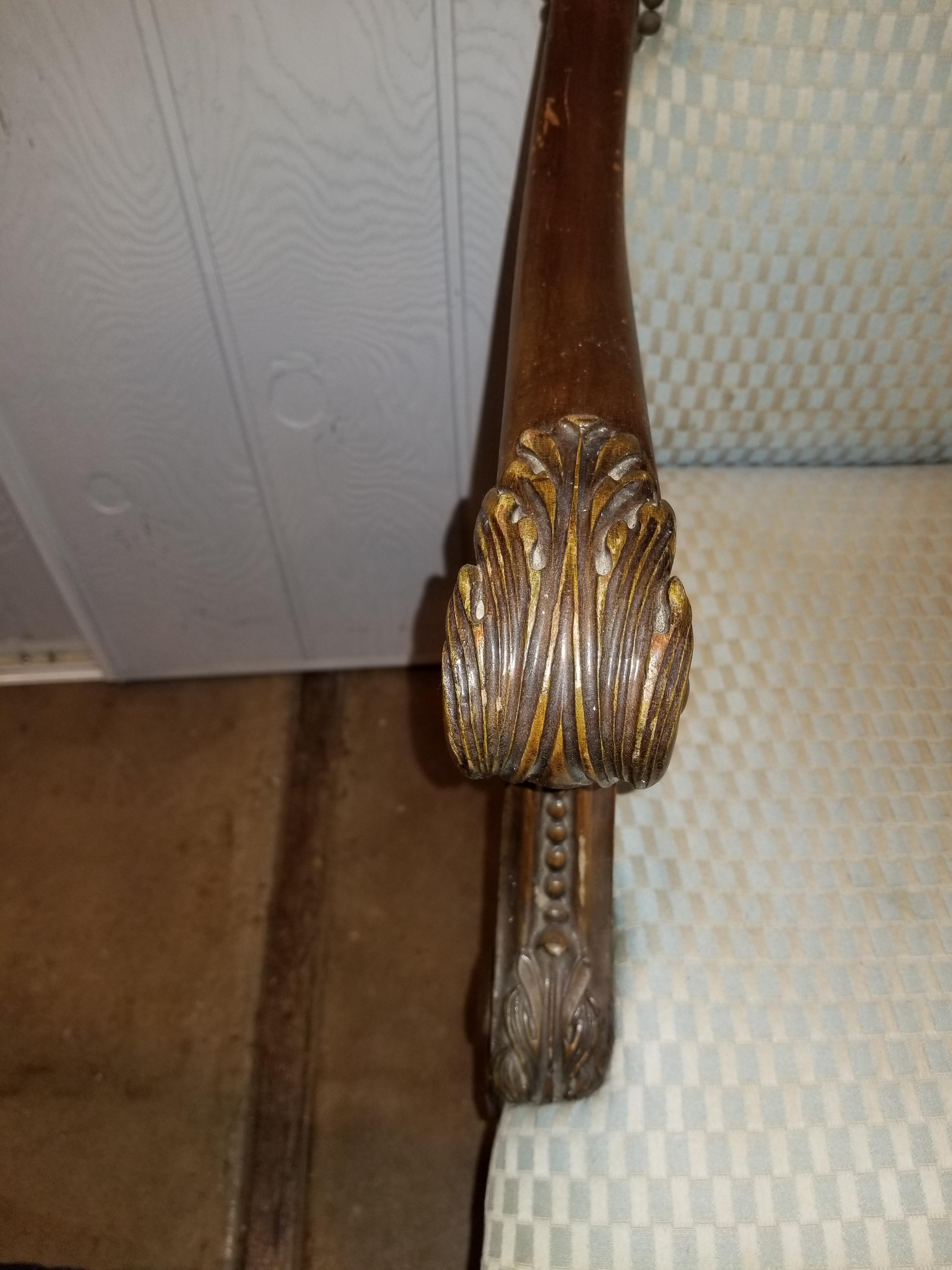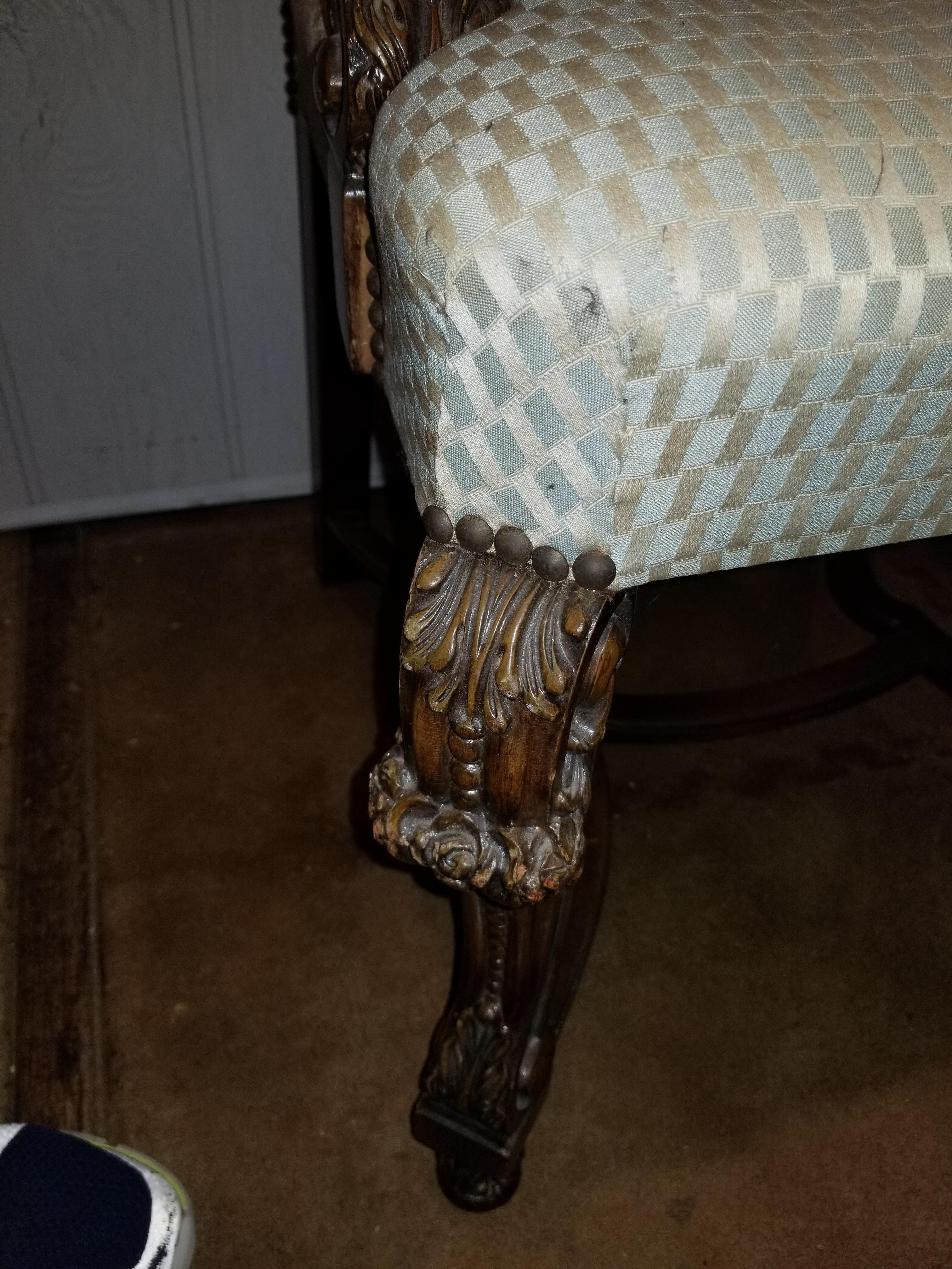 Carved ornate apron, carving underneath table support. 5 extra leaves with a built box included. 8 chairs ornate and upholstered. 2 captians chairs.