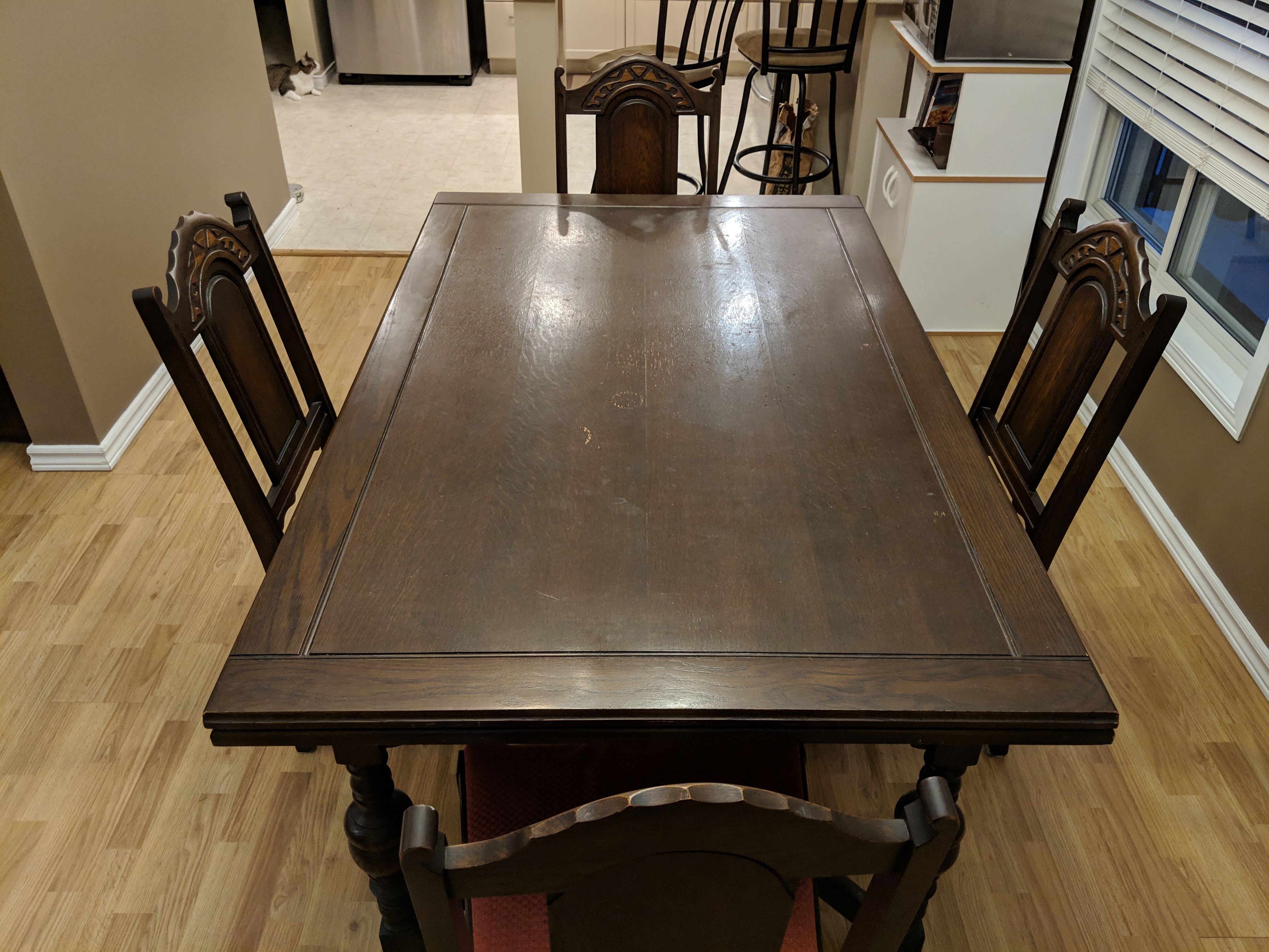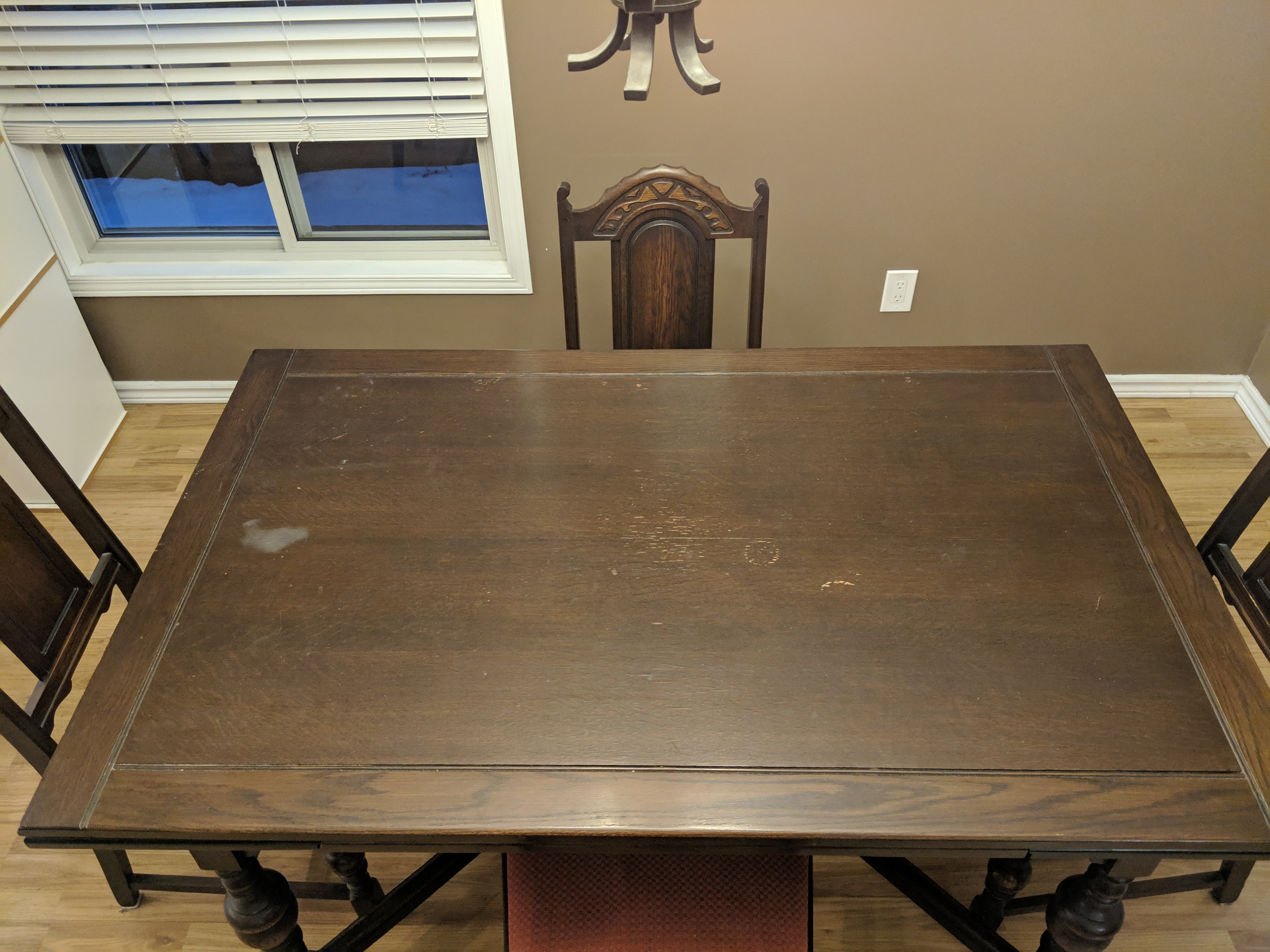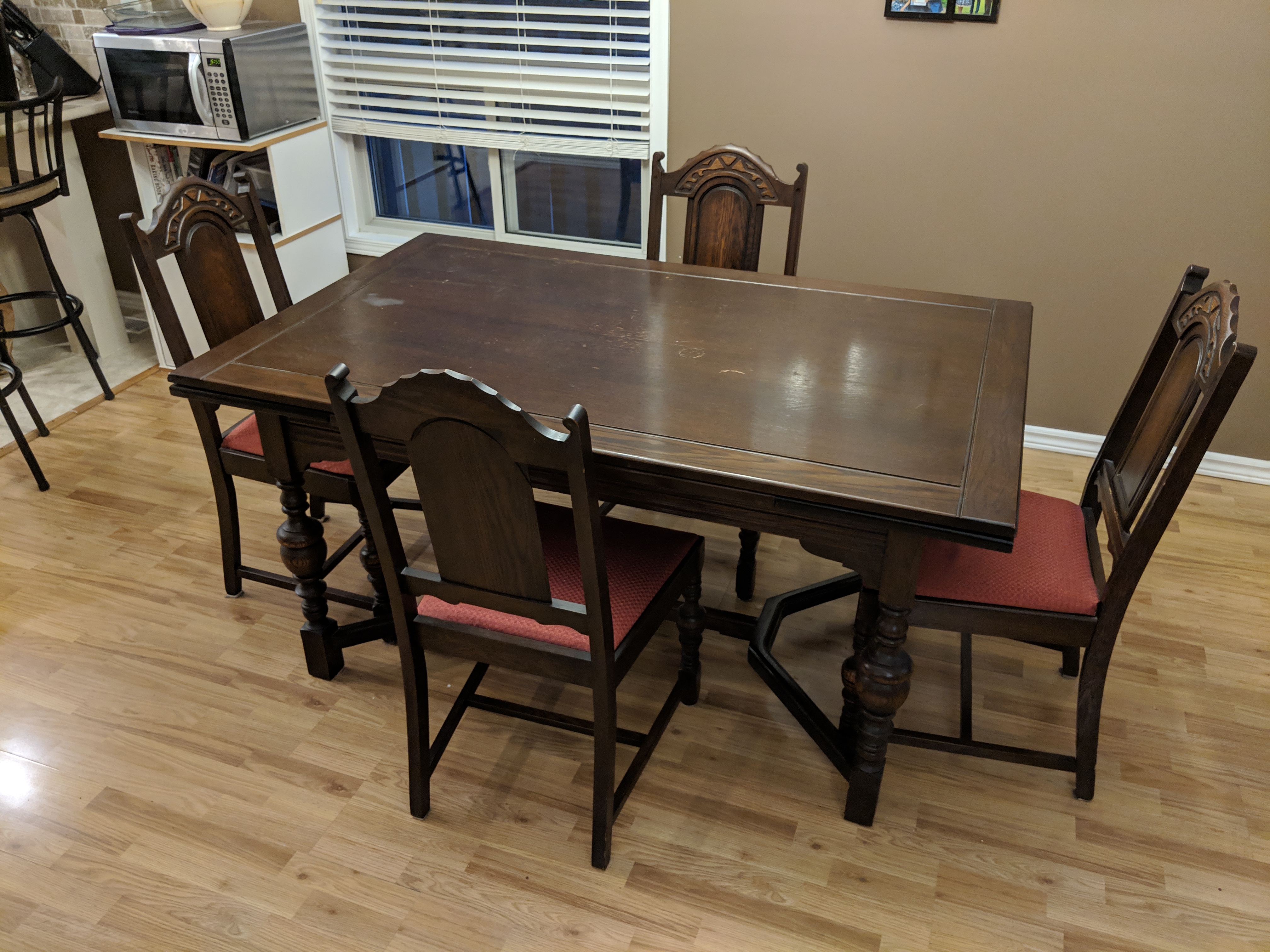 This is a Middlesex Furniture Company Ltd. dining room table with 4 chairs. We estimate the table to be from the 1920s-- has been passed down to family members over the years.