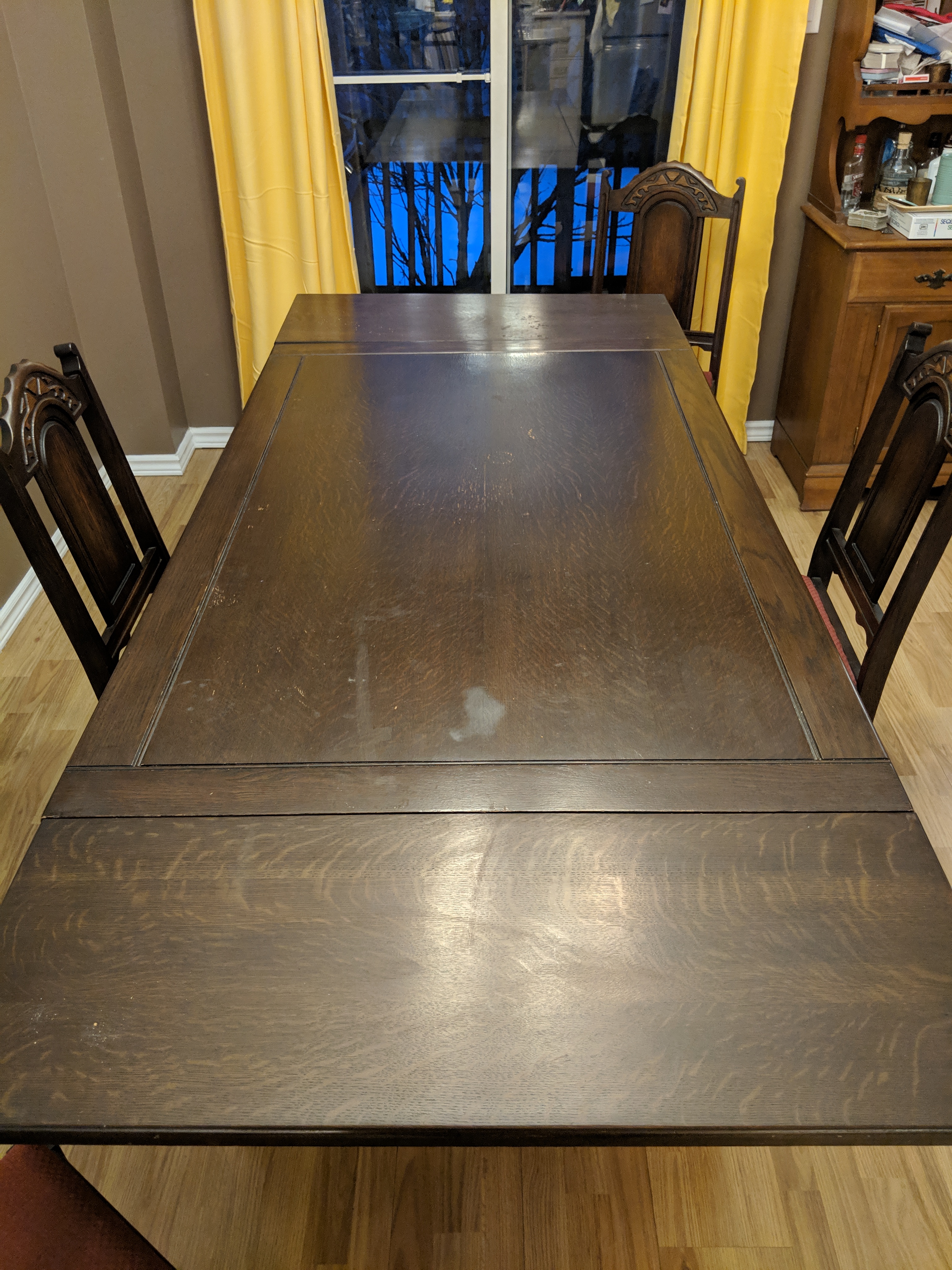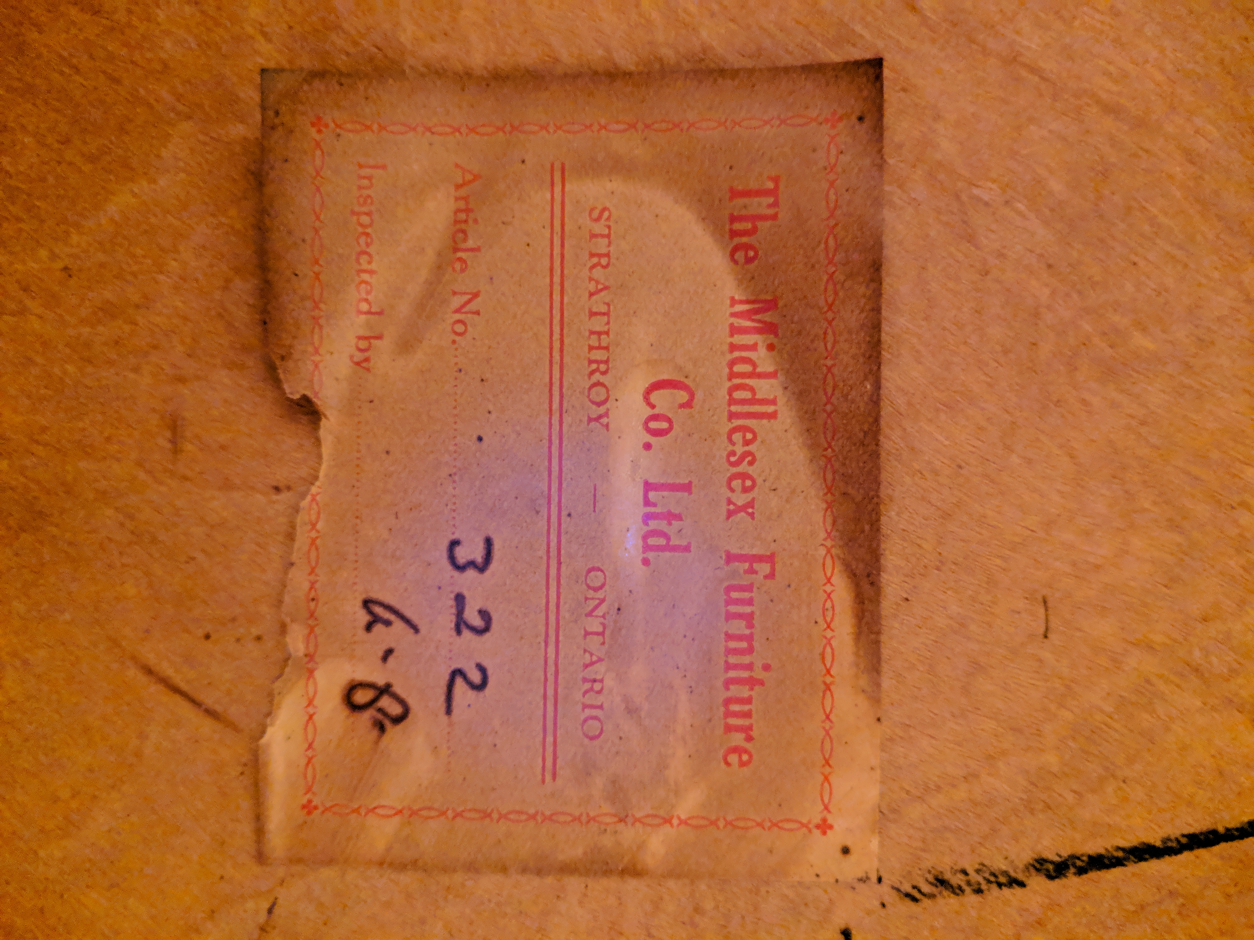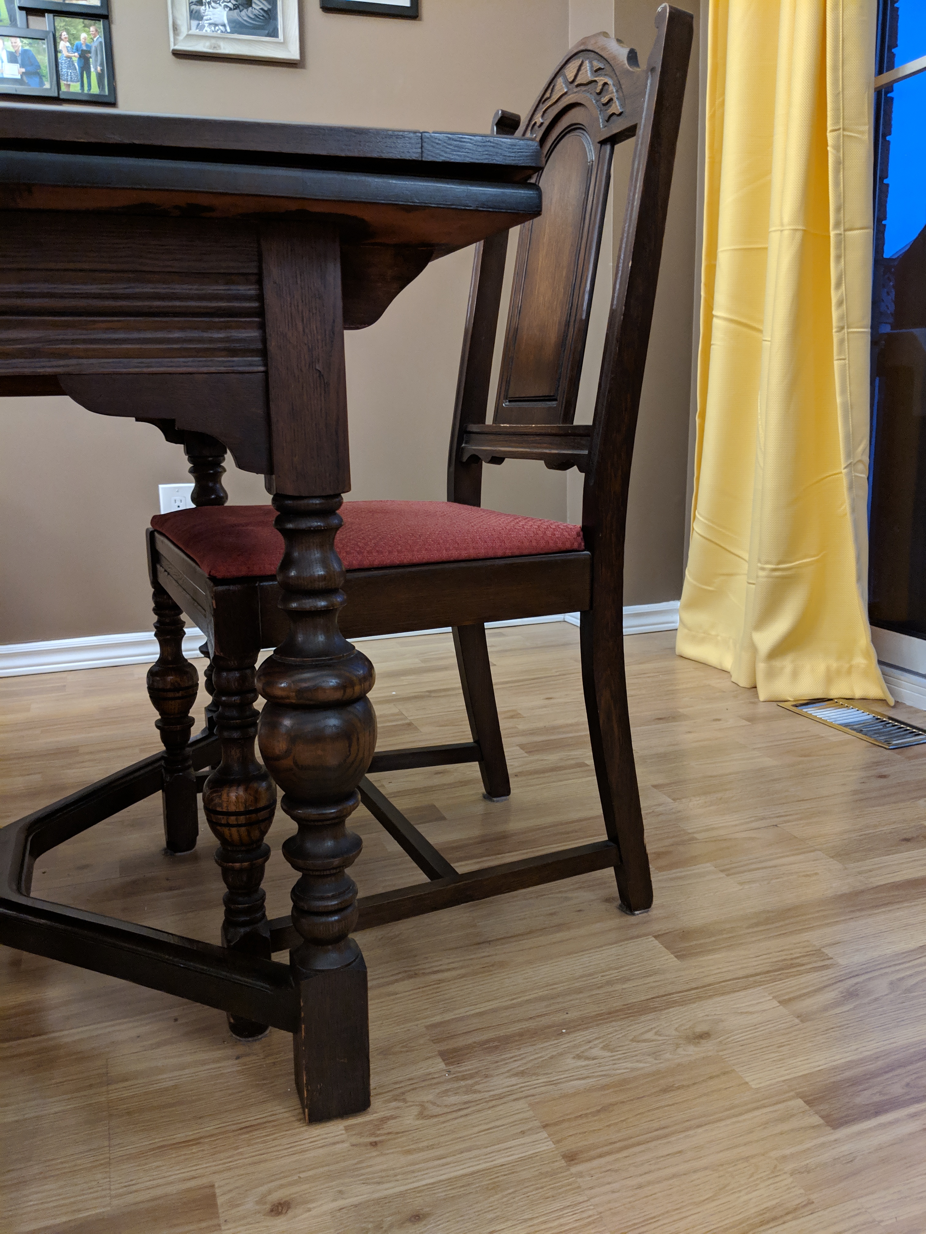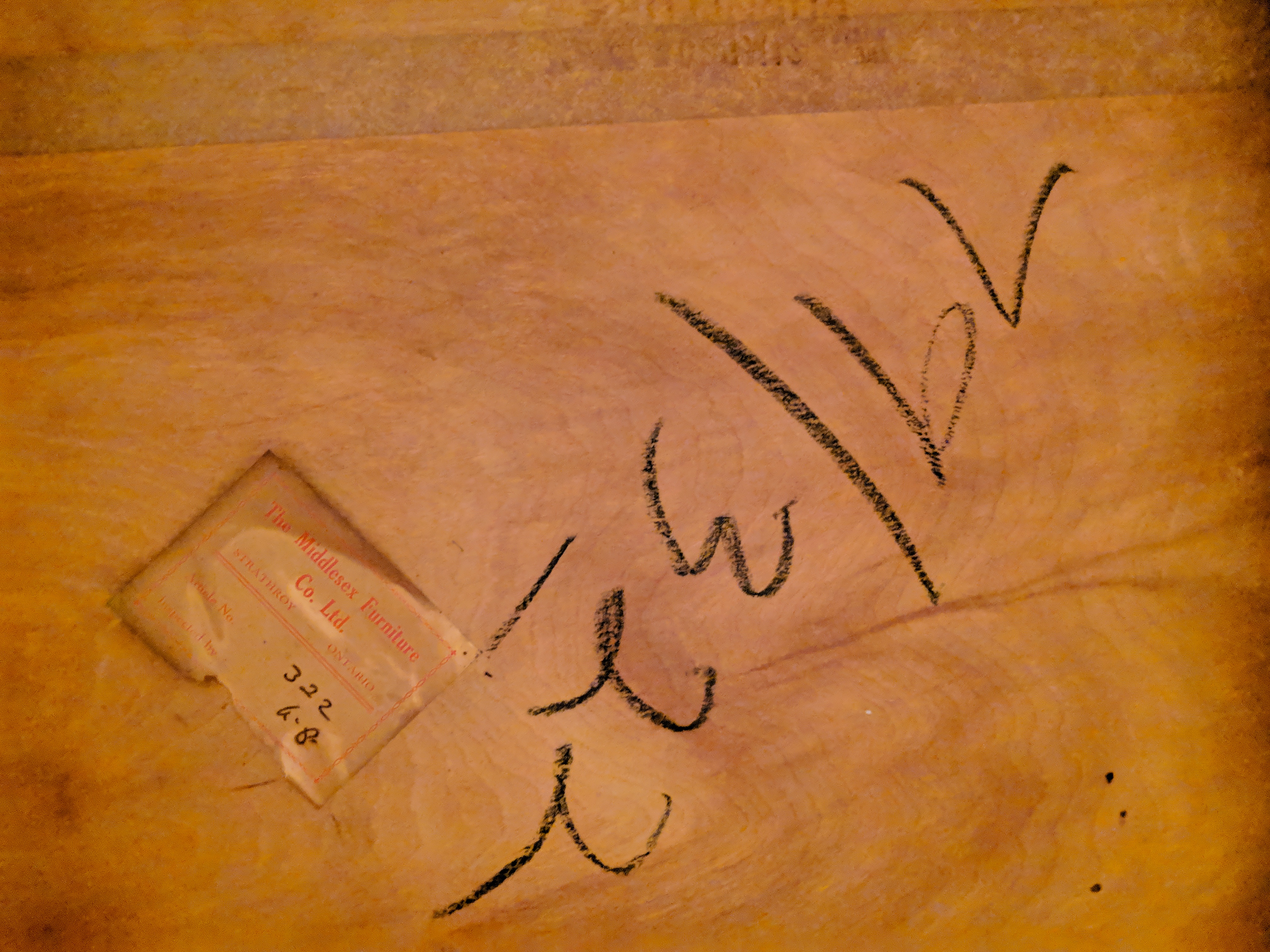 This is a Middlesex Furniture Company Ltd. dining room table with 4 chairs. We estimate the table to be from the 1920s-- has been passed down to family members over the years.