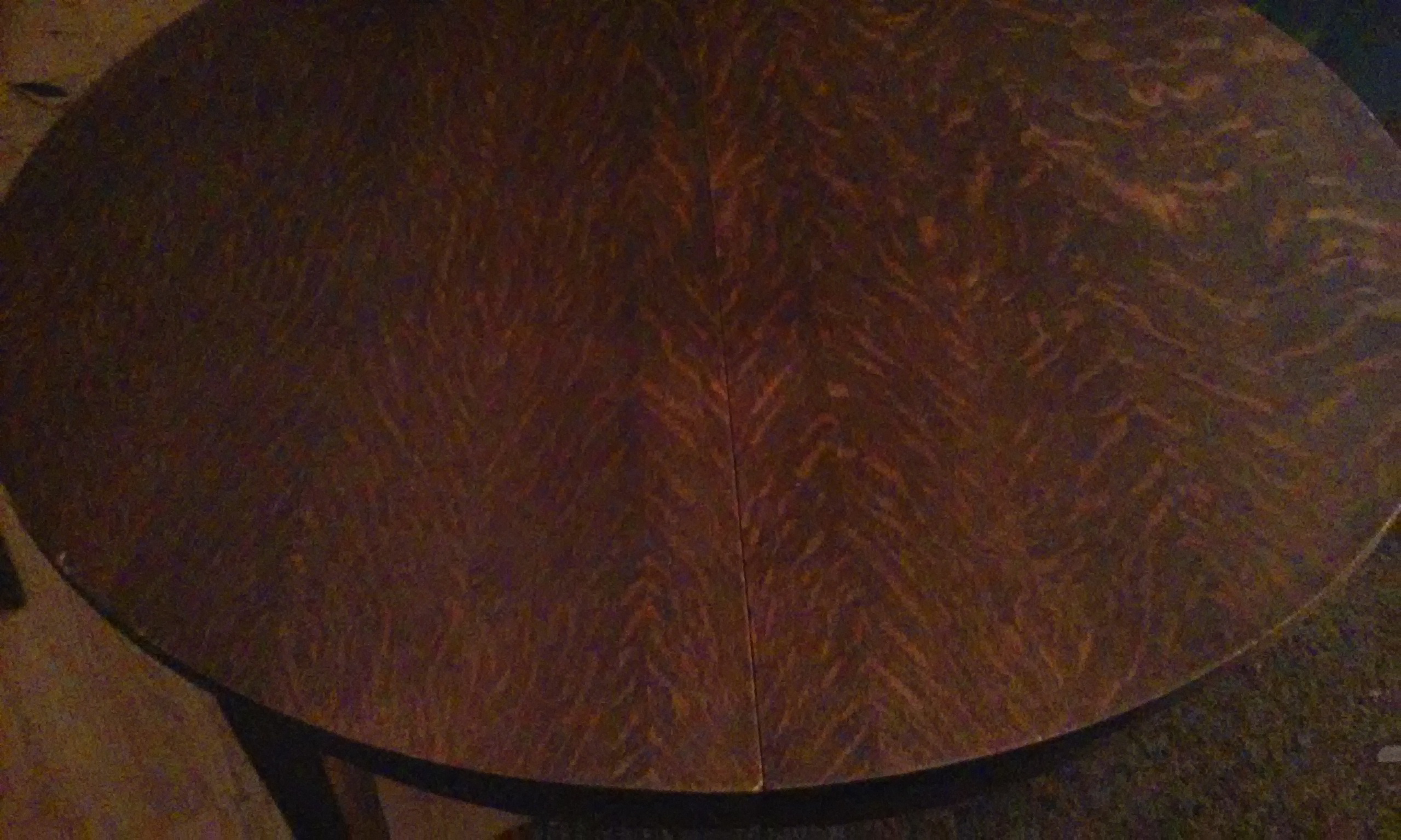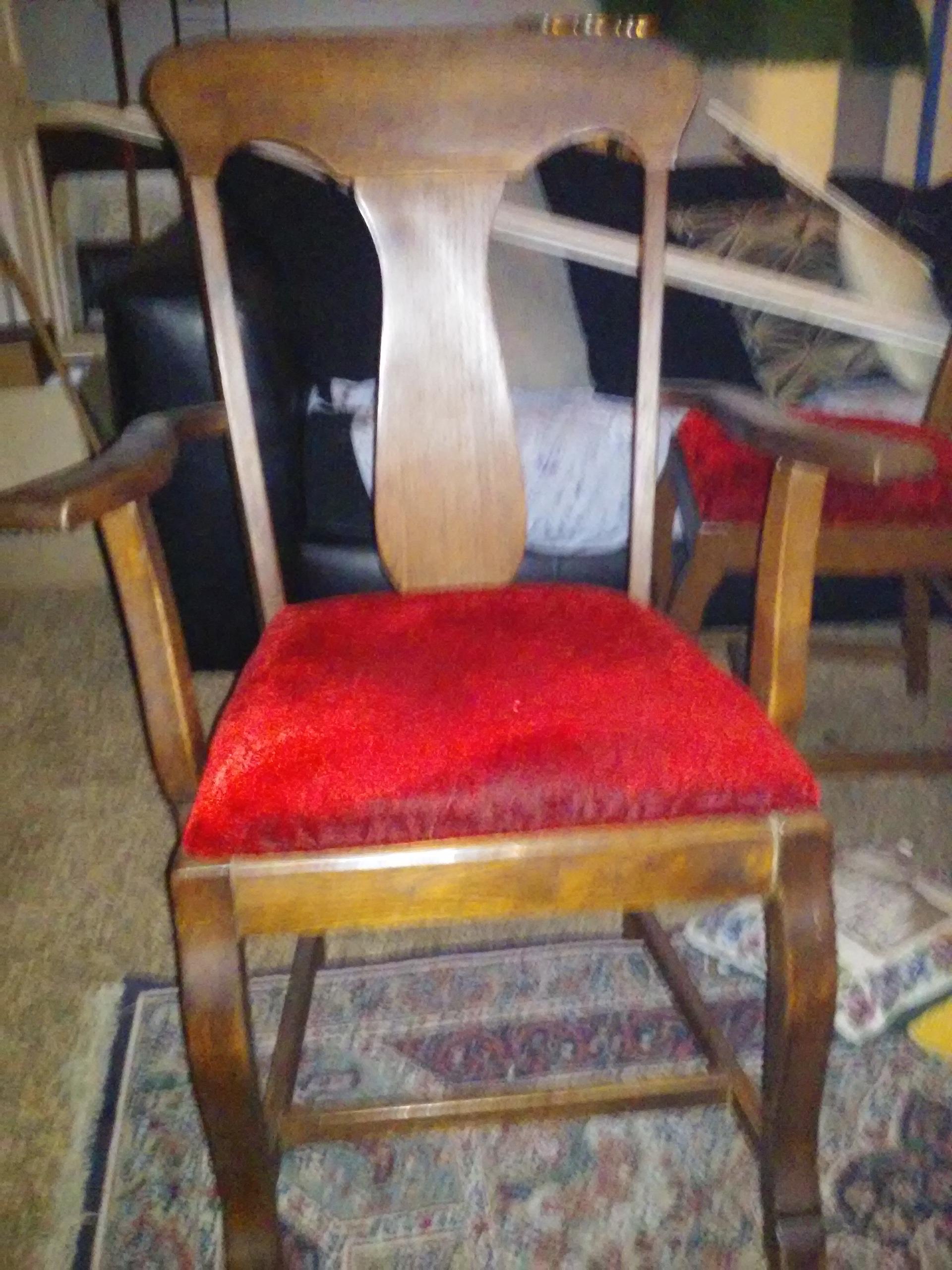 Table has three leafs with it. It has a total of 6 chairs, one captain style and five regular. All chairs are upholstered with deep red camel hair.