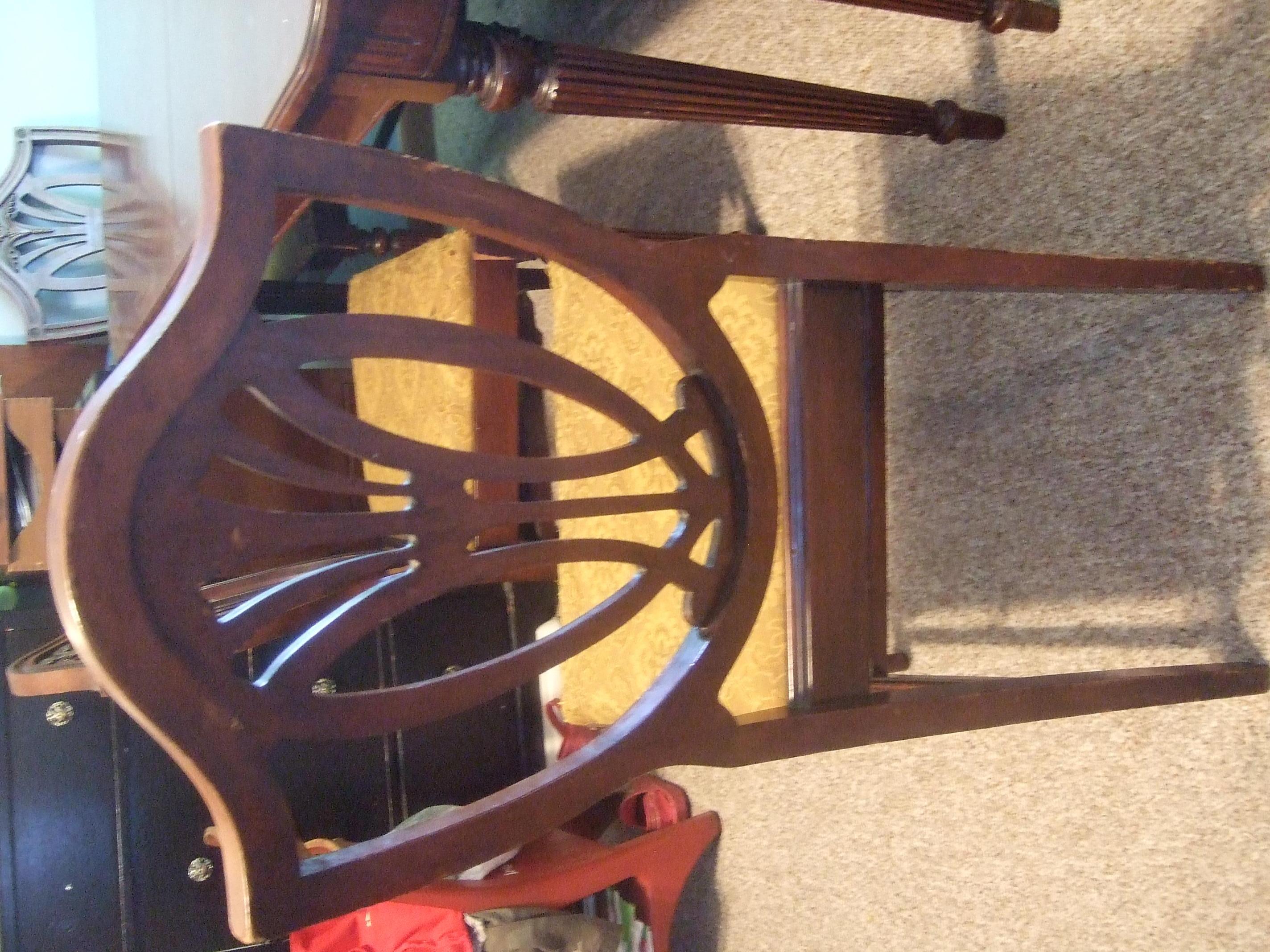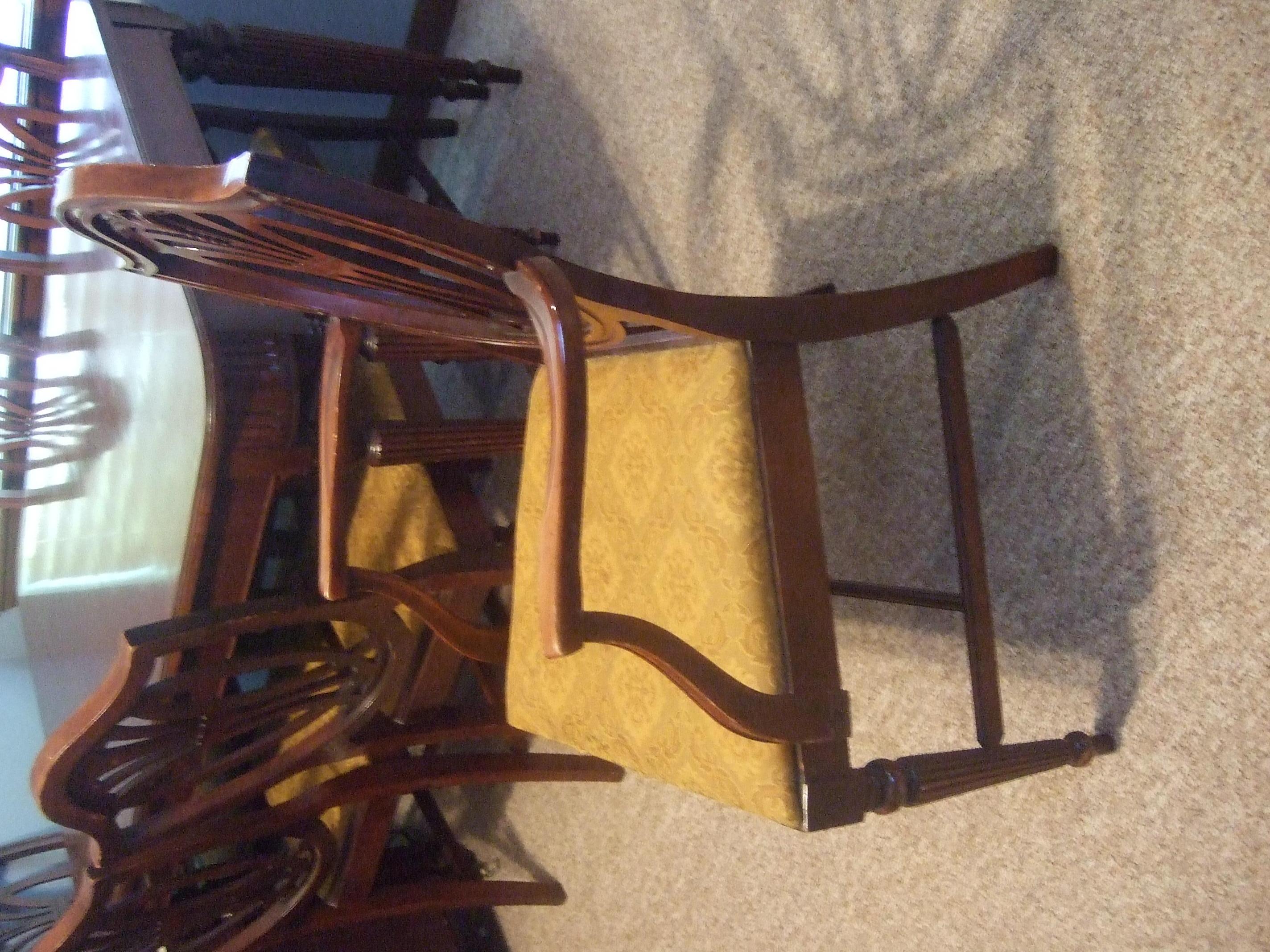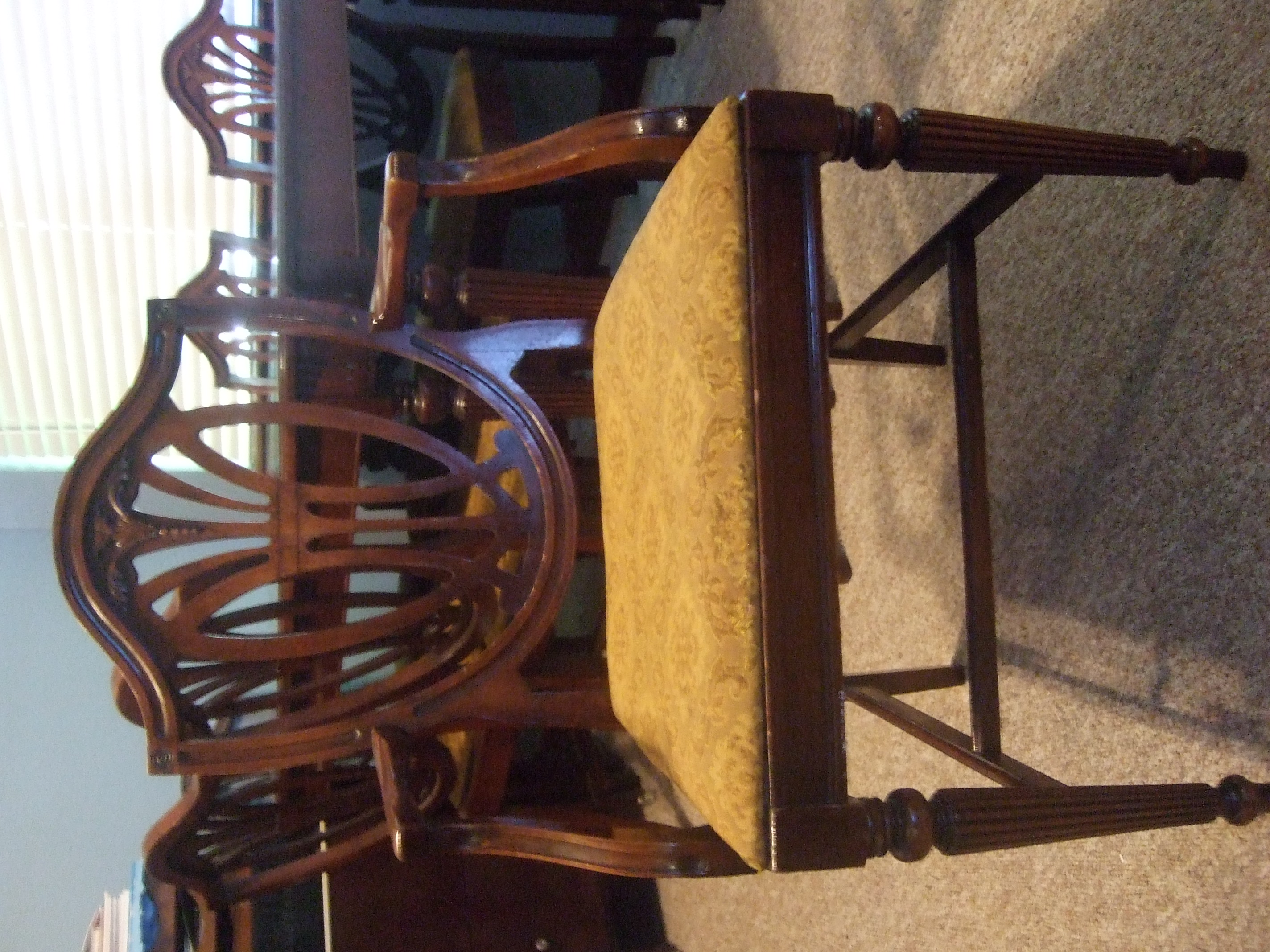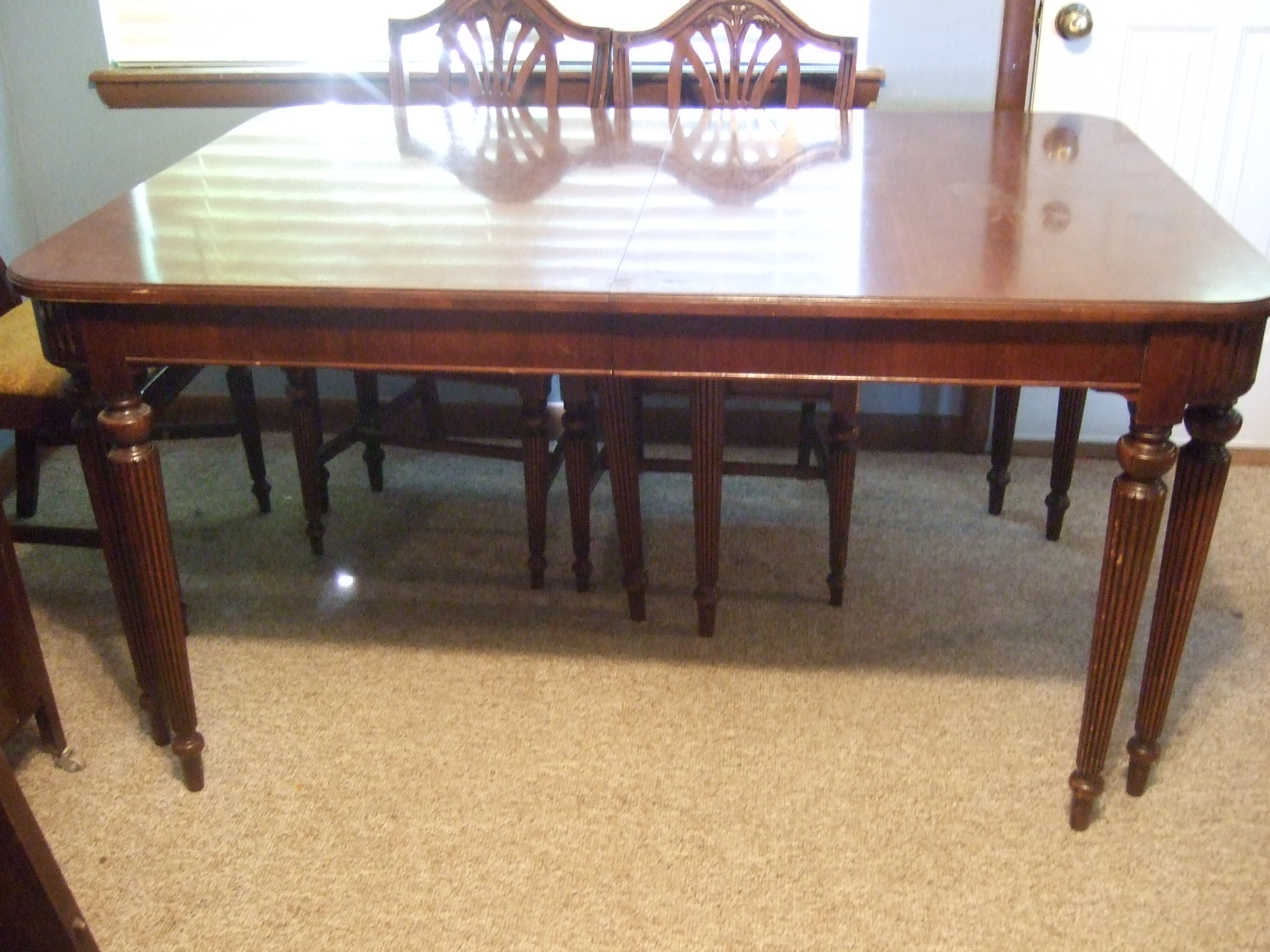 This is an antique dining set that I am 99% sure is from Biederman Furniture Co. out of St. Louis, MO. We bought this set awhile back with a house in Missouri. The number 317 is stamped on the bottom of the table (looks like it might be from the factory?) and there is writing on the bottom of the chairs reading (288-1 over 1228, 288-1 and 288-1 W (These may be from auction?).) I could not find identifying markings on these table and chairs, but recently came across a very similar set with the following stamped on the bottom of the chairs (Biederman Furniture Co. Springfield, MO No. 515.4859.WINE.) We also have 2 bedroom suites from that house that appear to be from Biederman. I don't know the exact age, but a note from the previous owner says they were reupholstered in April of 1970. I am guessing them to be from the mid 50s to mid 60s. The table measures approx. 40" W x 78" L (w/18" leaf.) I would consider the set to be in good condition aside from the 2 broken chaircs, see photos. The finish also shows some wear and scratches. The table has double legs at each corner as well as 2 legs in the middle. There are 6 chairs total one of which is a captains chair. I am curious of the value as a set as well as for the individual chairs or table.