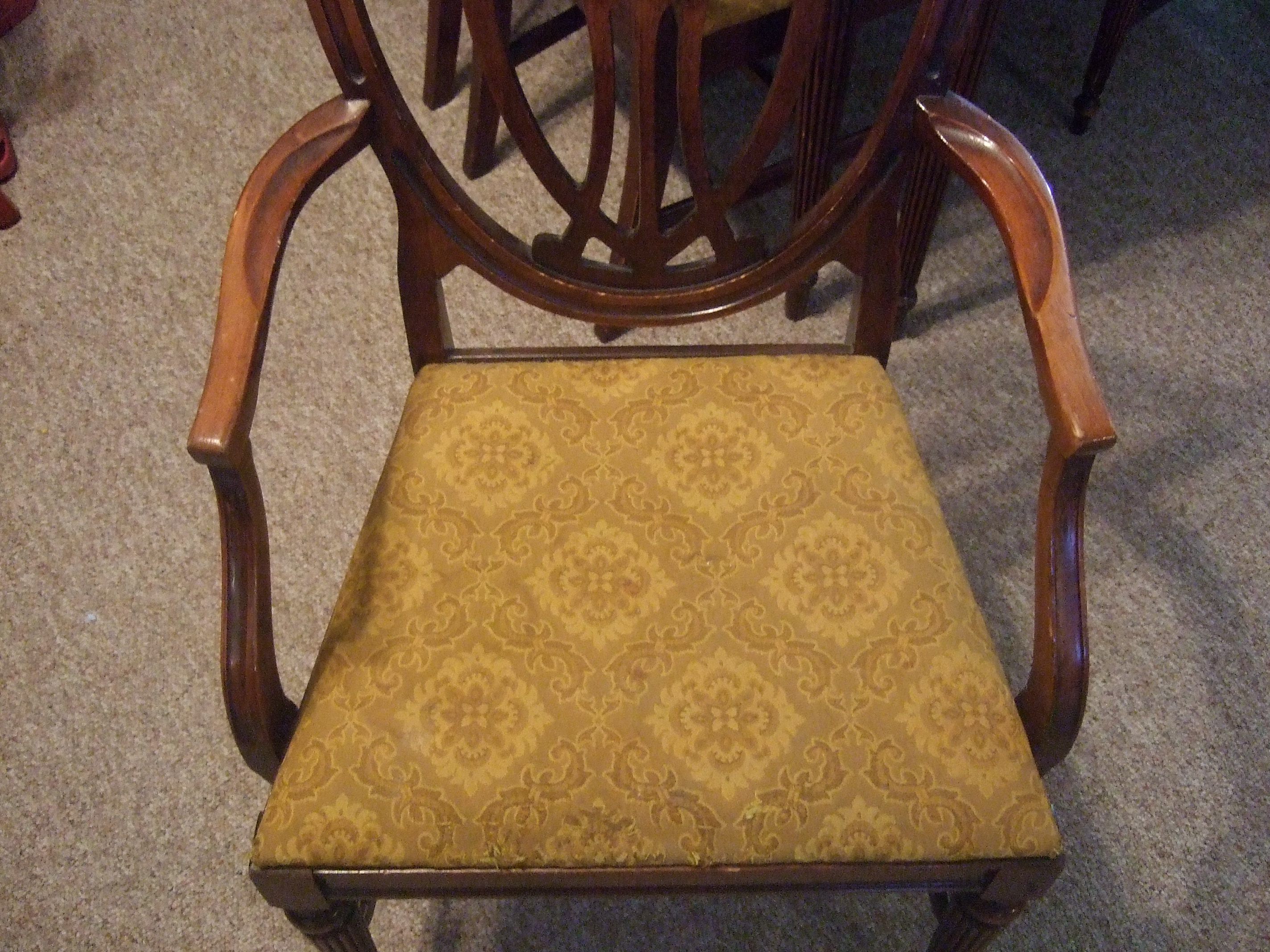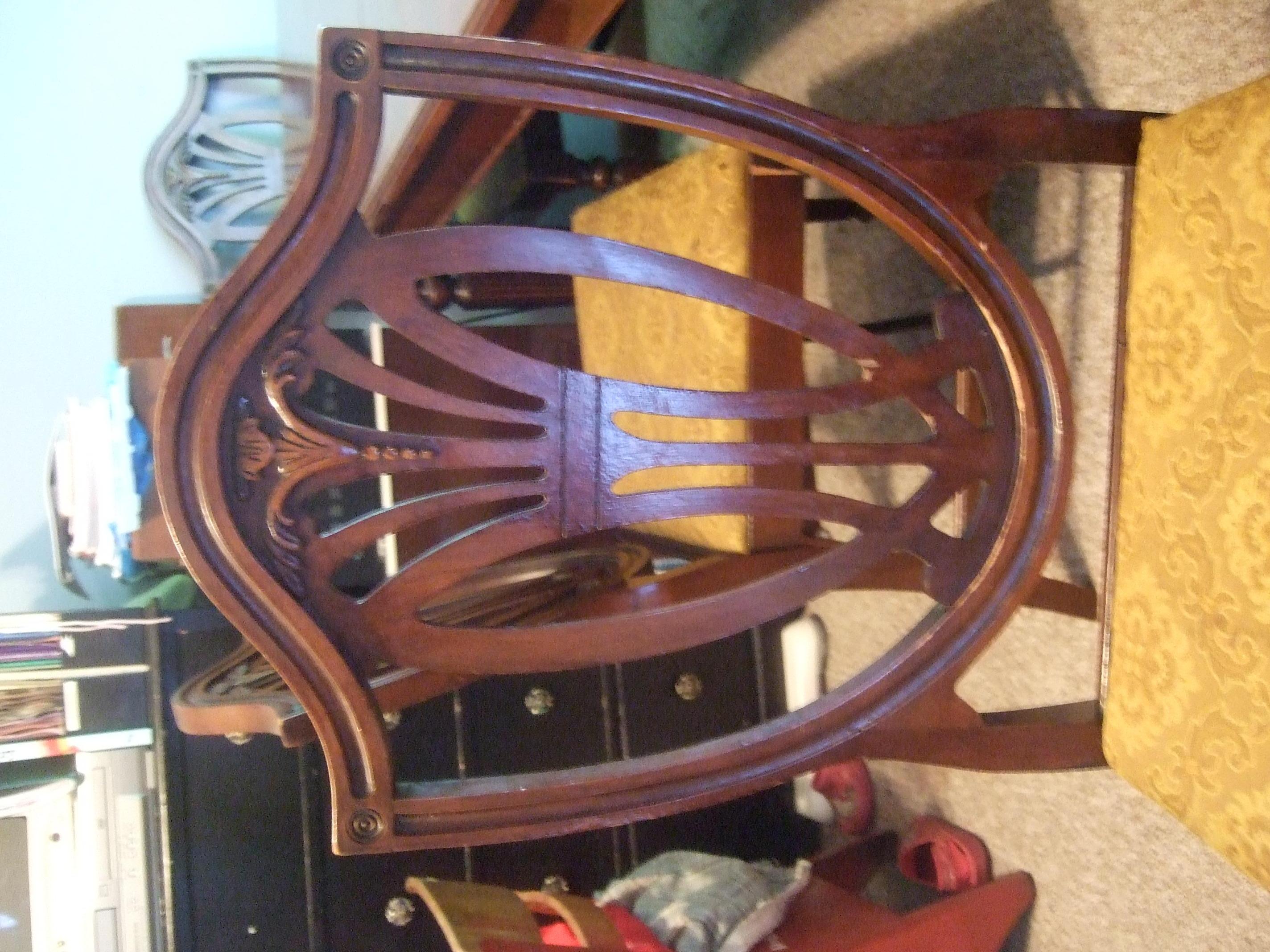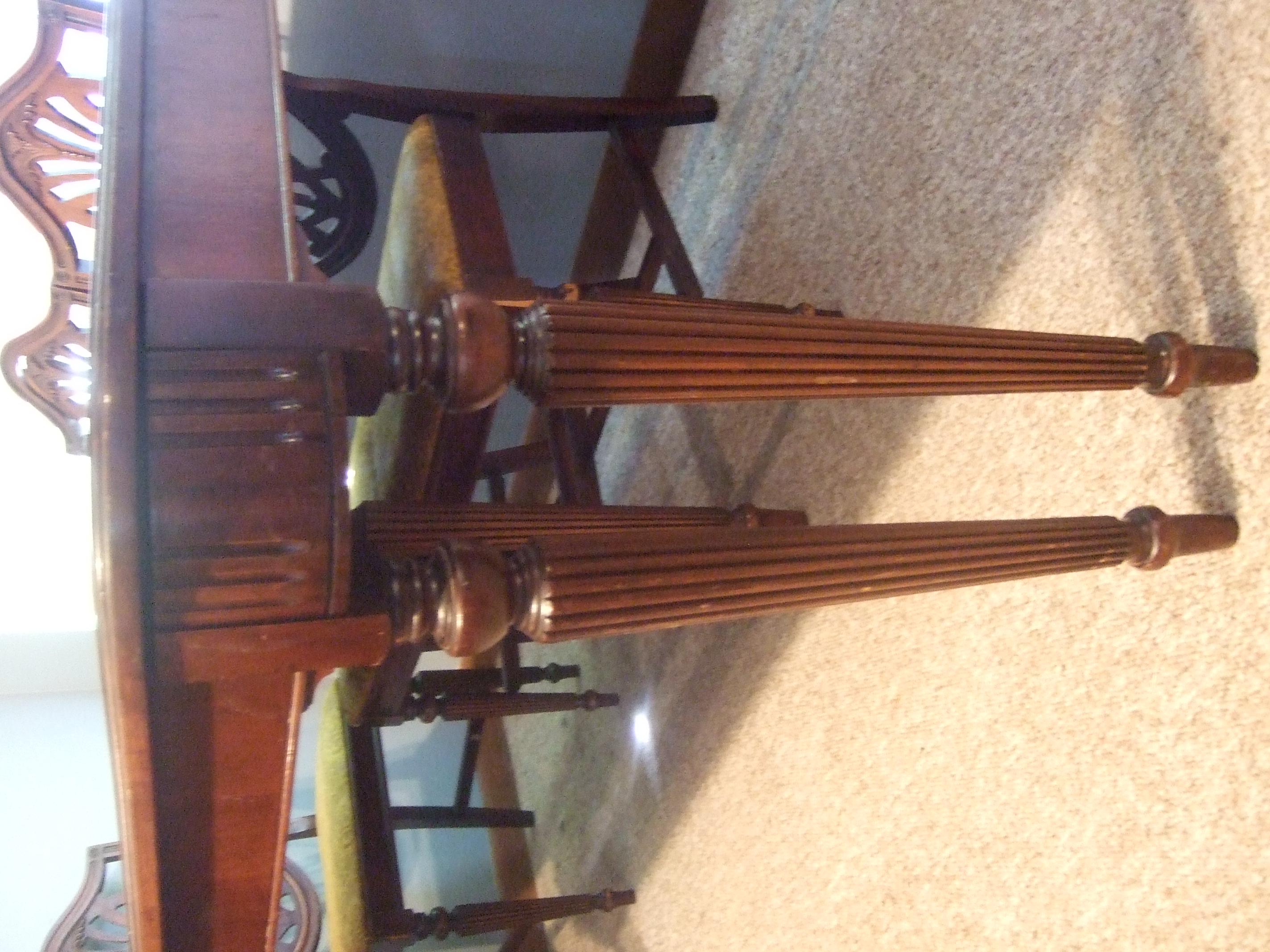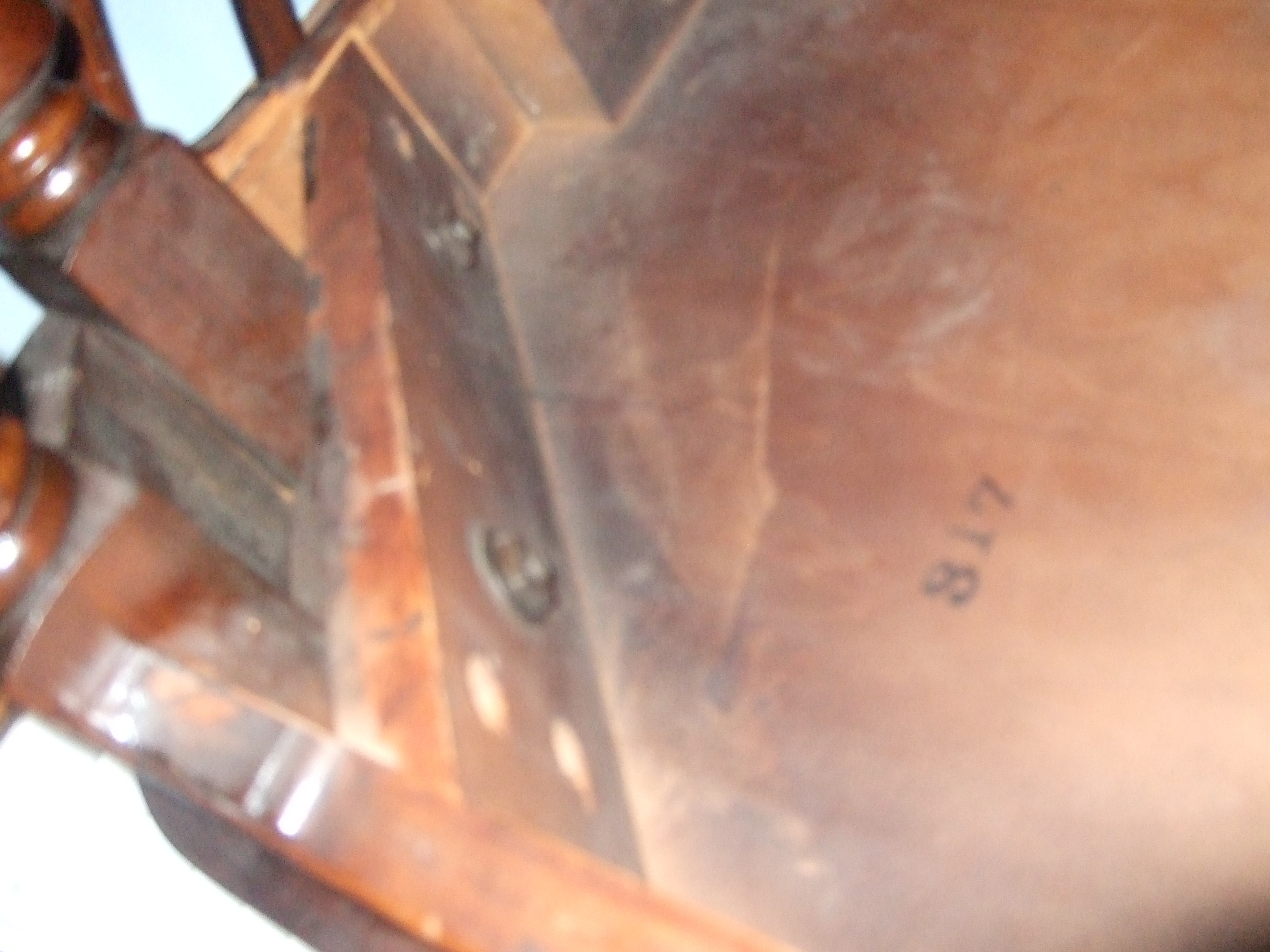 This is an antique dining set that I am 99% sure is from Biederman Furniture Co. out of St. Louis, MO. We bought this set awhile back with a house in Missouri. The number 317 is stamped on the bottom of the table (looks like it might be from the factory?) and there is writing on the bottom of the chairs reading (288-1 over 1228, 288-1 and 288-1 W (These may be from auction?).) I could not find identifying markings on these table and chairs, but recently came across a very similar set with the following stamped on the bottom of the chairs (Biederman Furniture Co. Springfield, MO No. 515.4859.WINE.) We also have 2 bedroom suites from that house that appear to be from Biederman. I don't know the exact age, but a note from the previous owner says they were reupholstered in April of 1970. I am guessing them to be from the mid 50s to mid 60s. The table measures approx. 40" W x 78" L (w/18" leaf.) I would consider the set to be in good condition aside from the 2 broken chaircs, see photos. The finish also shows some wear and scratches. The table has double legs at each corner as well as 2 legs in the middle. There are 6 chairs total one of which is a captains chair. I am curious of the value as a set as well as for the individual chairs or table.