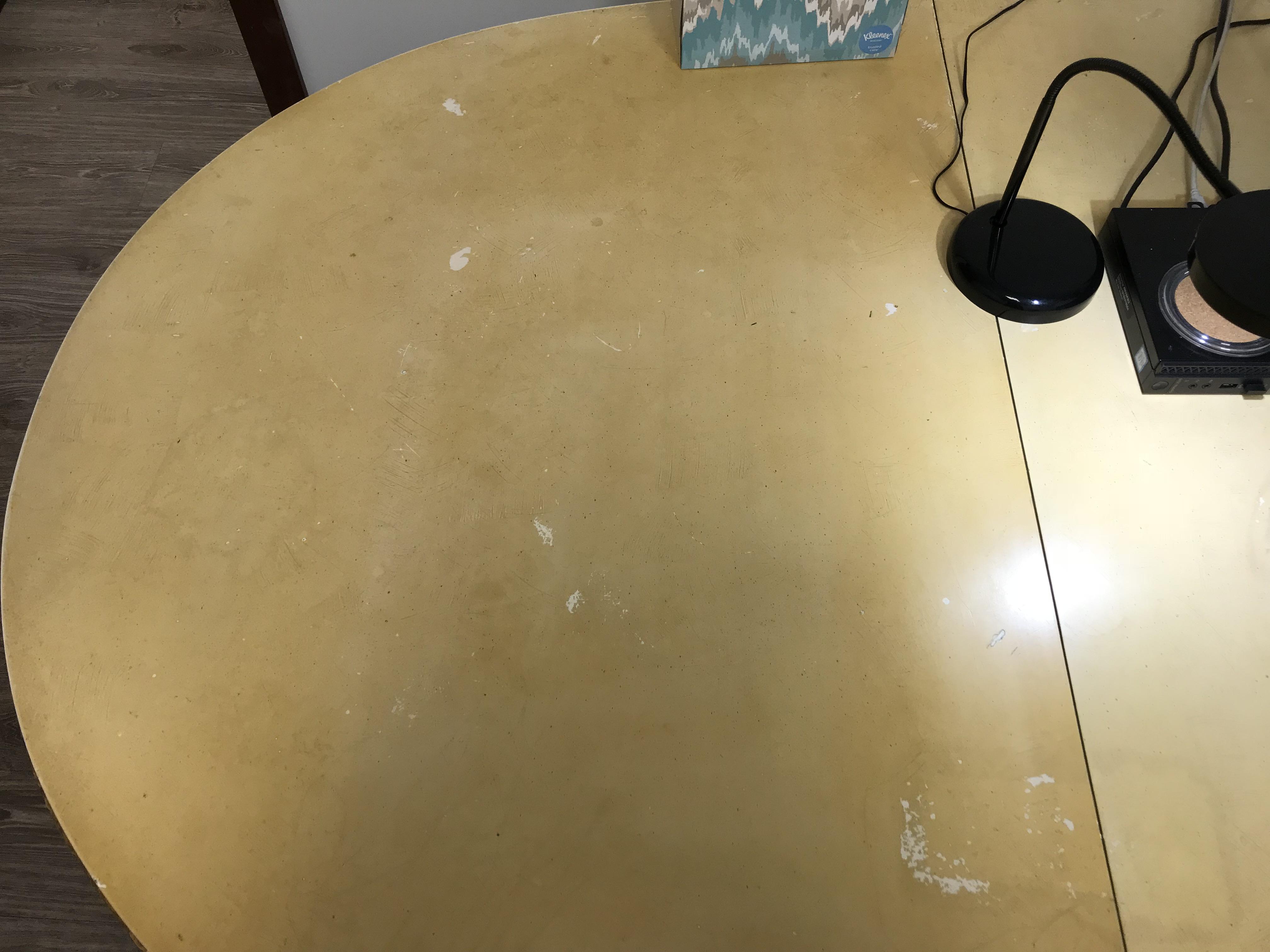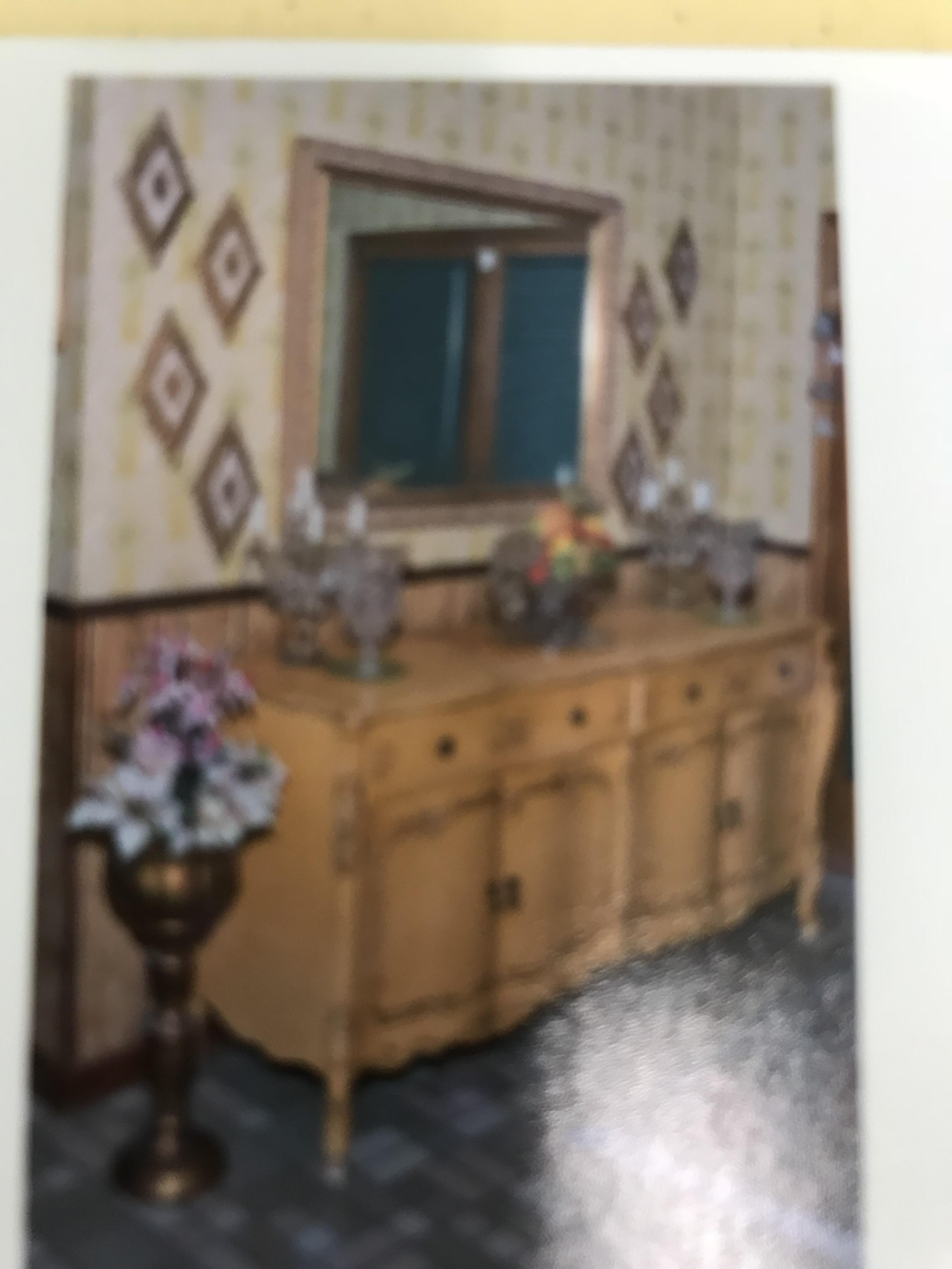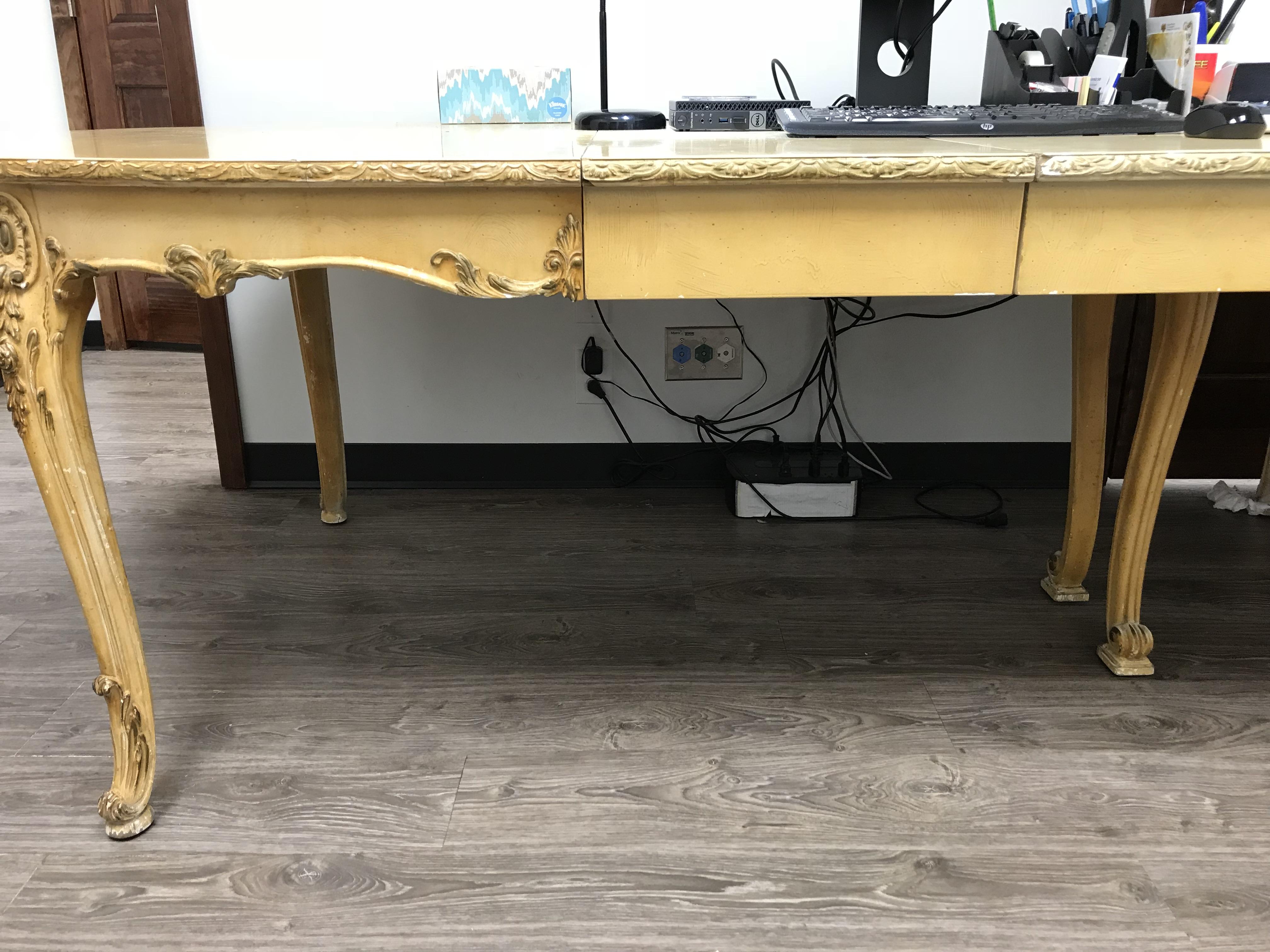 French Provincial Dining Room table, chairs and buffett. The underside of the table says, "Table No. 83, 846, Antique White Gold". It has three leaves, maybe four. My father was a politician and entertained the govenor and many other politicians in the late 1950's and early 1960's. Some of the pics I will post are pics of pics as most of the furniture is in office storage.