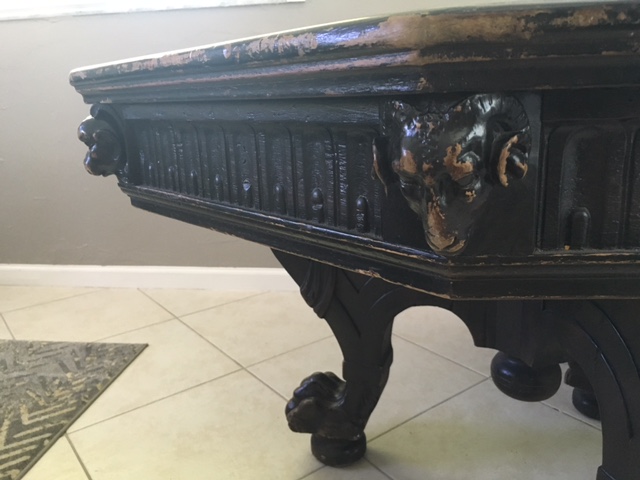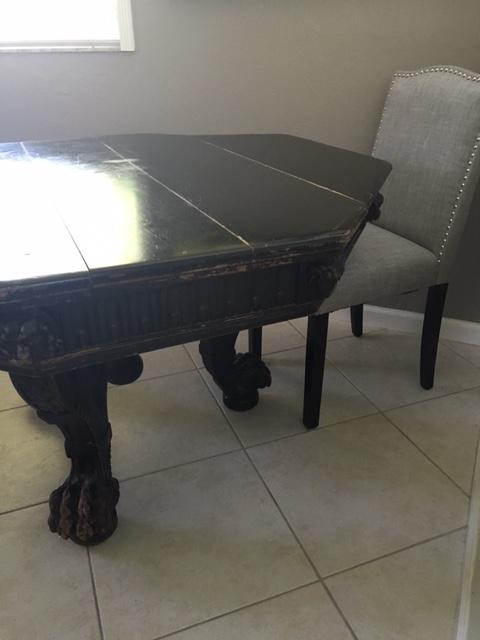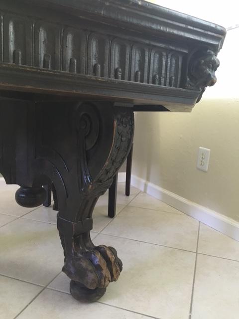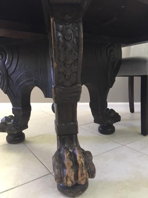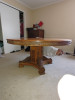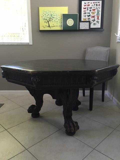 Solid wood dining table with claw feet legs. This antique octogon table would comfortably seat 4. One leaf slab can be taken out to reduce weight for transport.